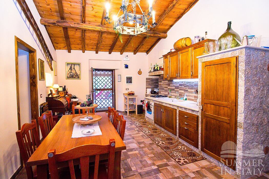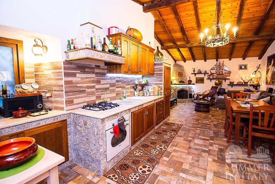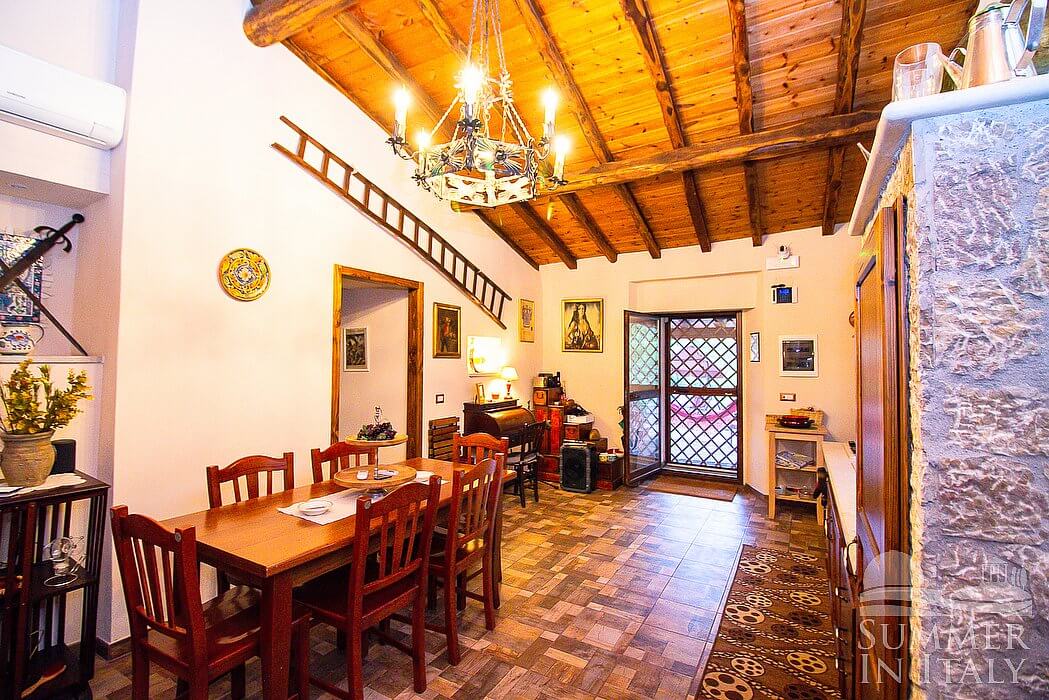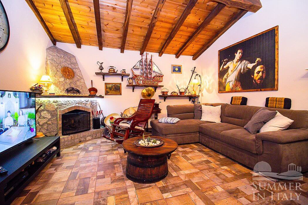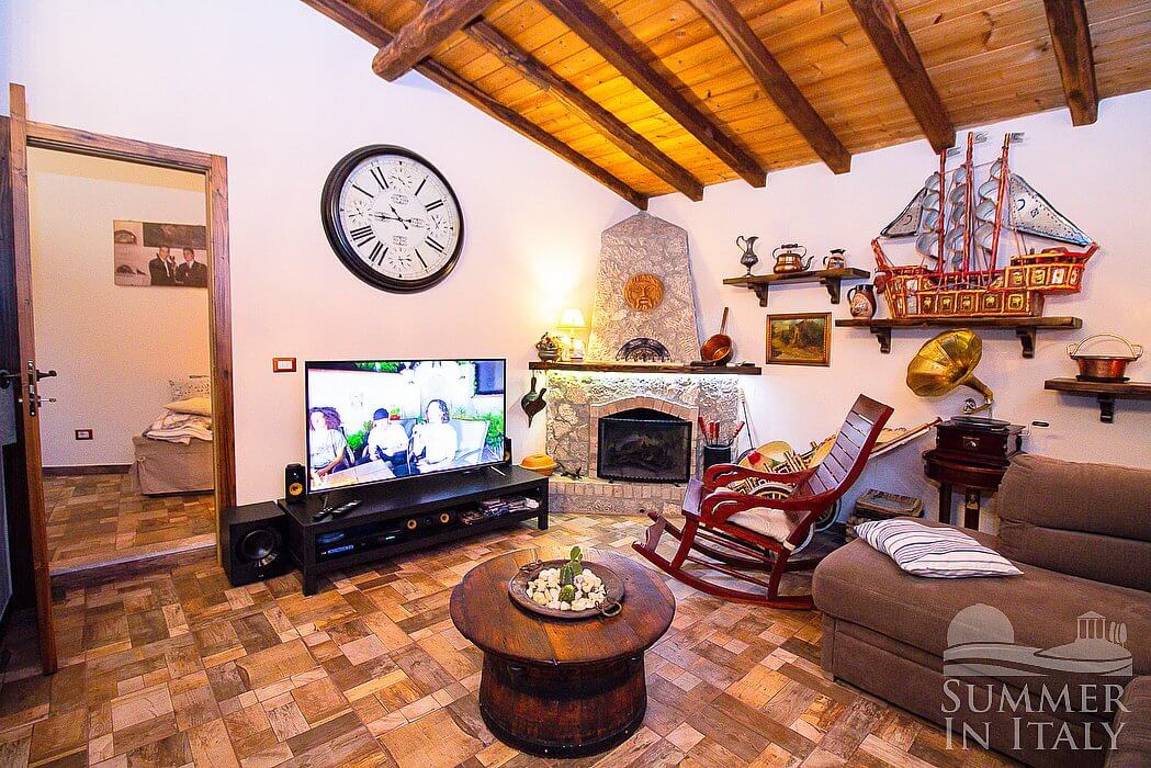 The ceiling of the living room is sloped and is made of wood. The furnishings are classic and welcoming. The furnishings include a sofa and a rocking chair. There is a nice fireplace made of stone. In the living room you will also find a cooking area. The kitchenette is equipped with a four-burner gas cooker, an electric oven, a refrigerator with freezer, a microwave oven, an Italian-style coffee-maker, a toaster and a kettle. The dining table can accommodate six guests. In this room you will find a television (local channels). From the living room you will be able to enter the patio through a French door. The room also has a window. It is equipped with an air conditioning/heating unit.