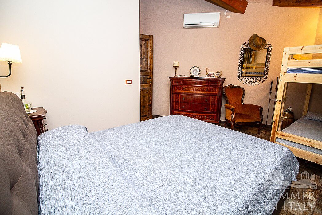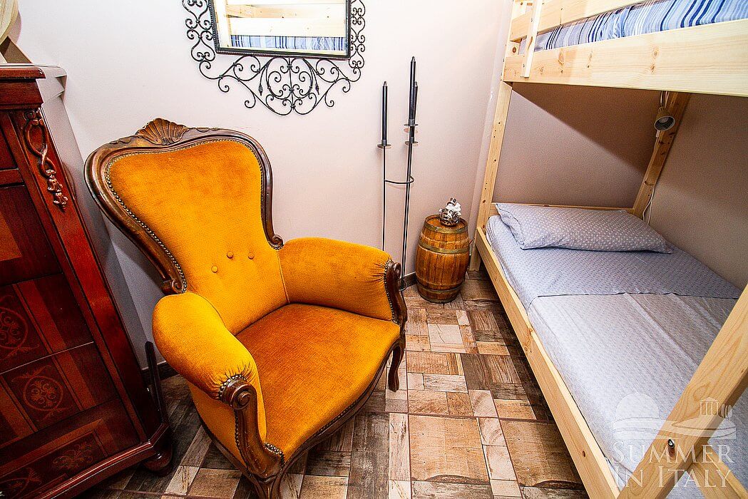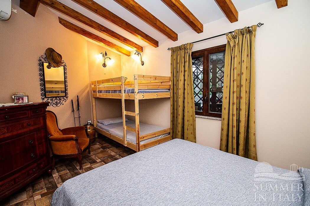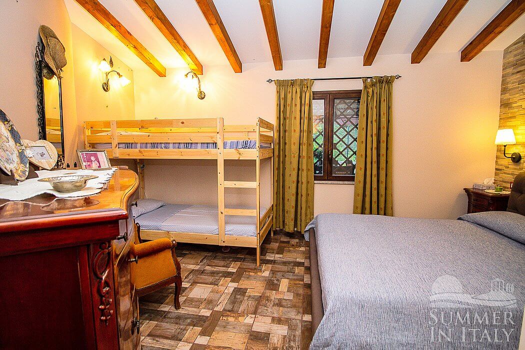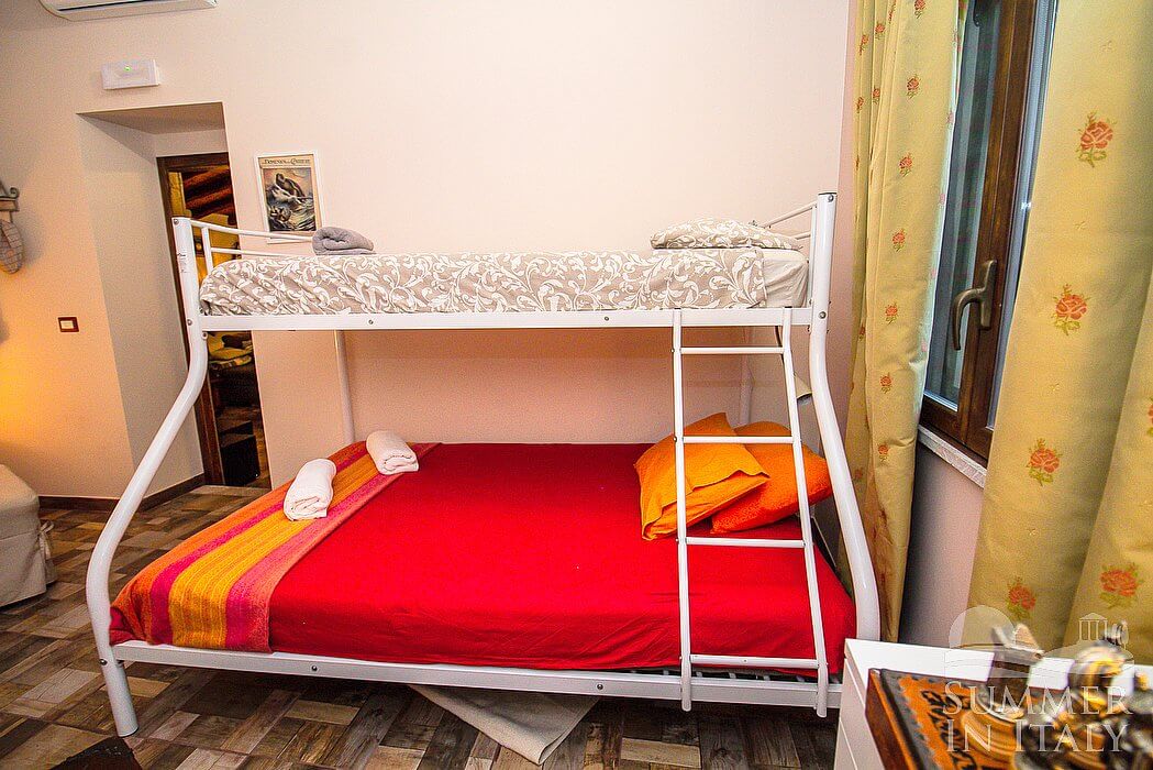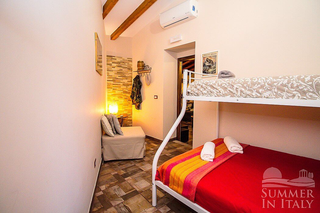 You will be able to enter the first bedroom from the living room through an access area. The ceiling has characteristic exposed wood beams. The room has a matrimonial bed (160 cm/63 inches, wider than a queen-size bed) and a bunk bed (two single beds, one on top of the other). The furnishings include an armchair. The room has a window. The bedroom is equipped with an air conditioning/heating unit.