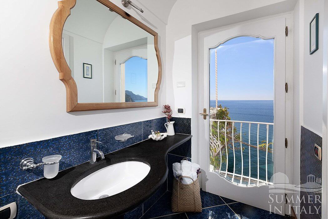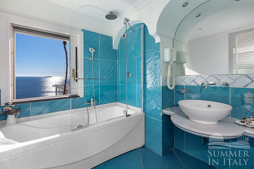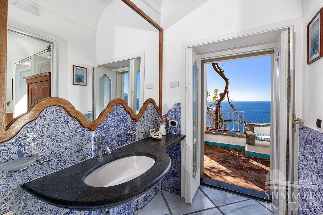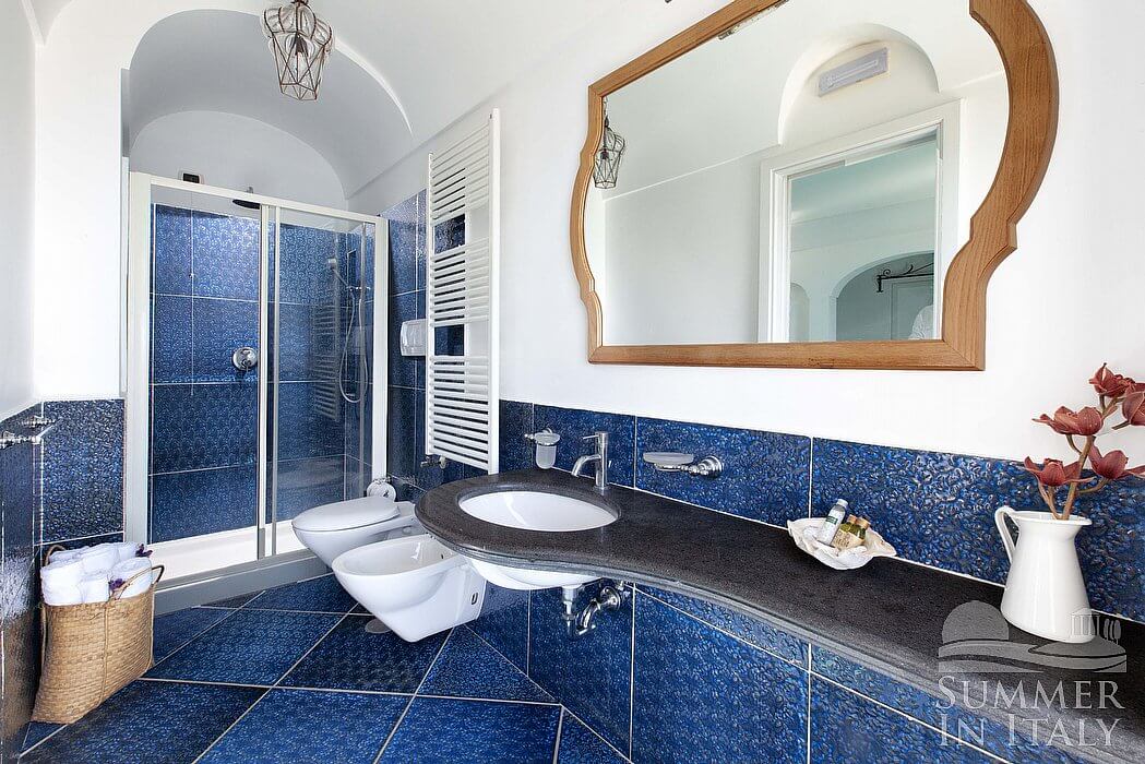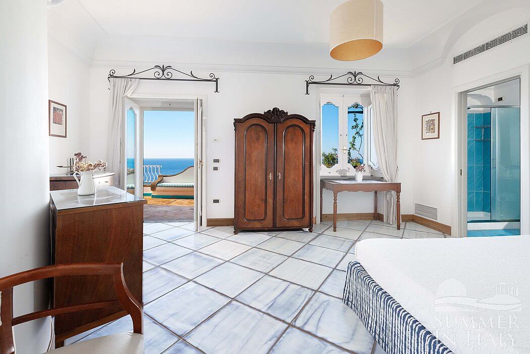 You will be able to enter the fourth bedroom from the corridor. The furnishings are elegant and bright, and include some antique pieces. The room has a matrimonial bed (160 cm/63 inches, wider than a queen-size bed), that can be split into twins if requested (please contact our staff in advance to make arrangements). The furnishings include a sofa. From the bedroom you will be able to enter the second terrace with a view of the sea and of the coast of Amalfi through a French door. The bedroom is equipped with an air conditioning/heating unit, and you will also find a safe. This bedroom has an en-suite bathroom, tiled with lucid handmade majolica tiles and equipped with a washbasin, a toilet, a jacuzzi bathtub and a hairdryer.