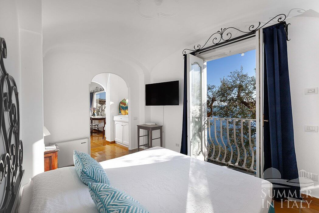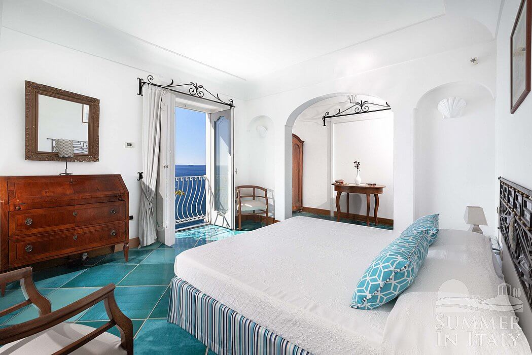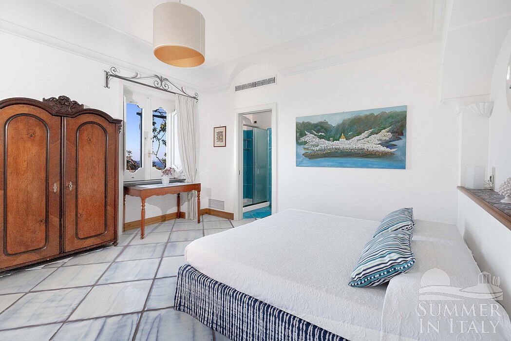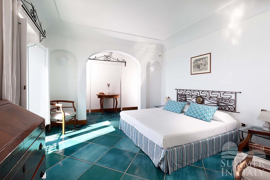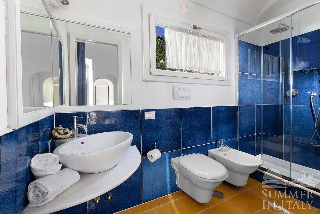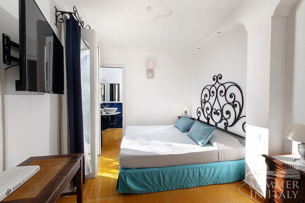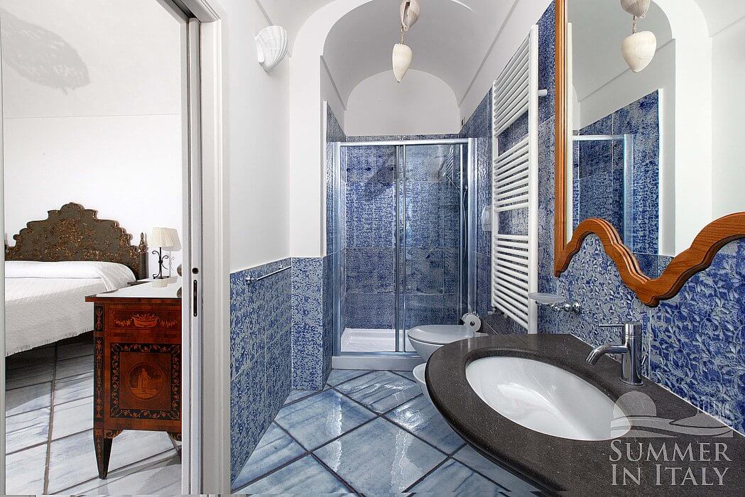 You will be able to enter the first bedroom from the corridor. The floor is paved with lucid sky-blue majolica tiles. The furnishings are elegant and refined, and include some antique pieces. The room has a matrimonial bed (160 cm/63 inches, wider than a queen-size bed), that can be split into twins if requested (please contact our staff in advance to make arrangements). From the bedroom you will be able to enter the small balcony with a view of the sea and of Positano through a French door. The bedroom is equipped with an air conditioning/heating unit, and you will also find a safe. This bedroom has an en-suite bathroom, tiled with lucid handmade majolica tiles and equipped with a washbasin, a toilet, a large fully-enclosed shower and a hairdryer.