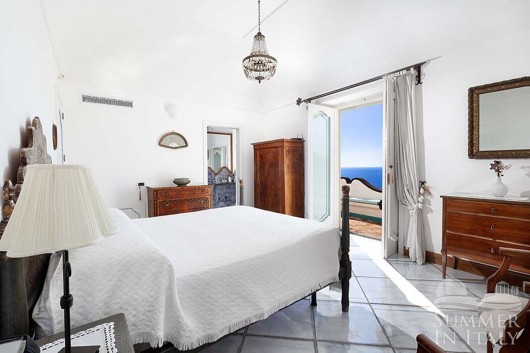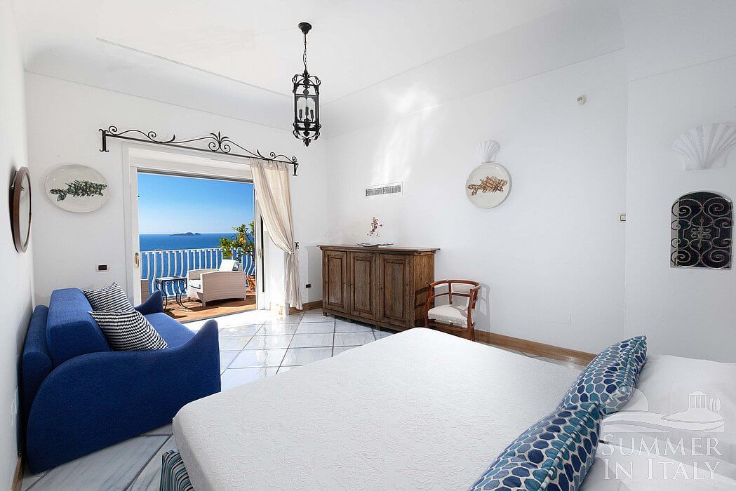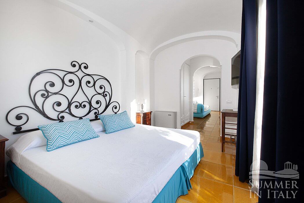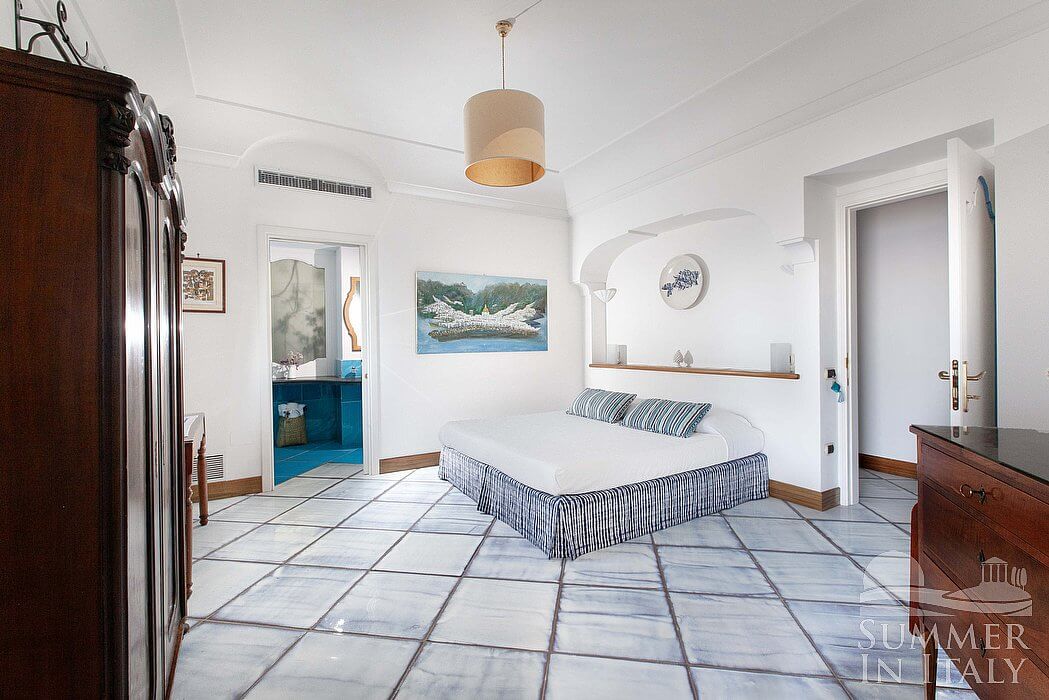 You will be able to enter the second bedroom from the corridor. The furnishings are elegant and refined. The room has a matrimonial bed (160 cm/63 inches, wider than a queen-size bed), that can be split into twins if requested (please contact our staff in advance to make arrangements). From the bedroom you will be able to enter the terrace with a view of the sea and of the coastline through a French door. The room has a window with a view of the sea, and it's equipped with an air conditioning/heating unit, and you will also find a safe. This bedroom has an en-suite bathroom, tiled with lucid handmade majolica tiles and equipped with a washbasin, a toilet, a large fully-enclosed shower and a hairdryer.