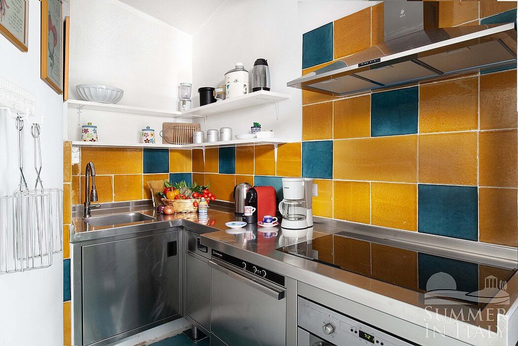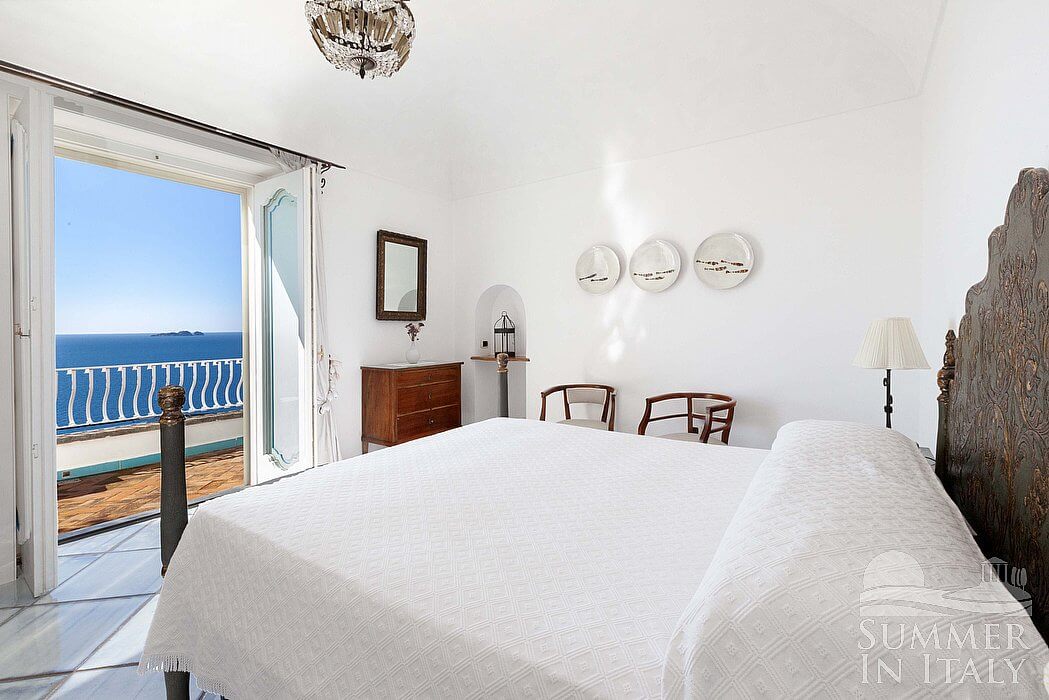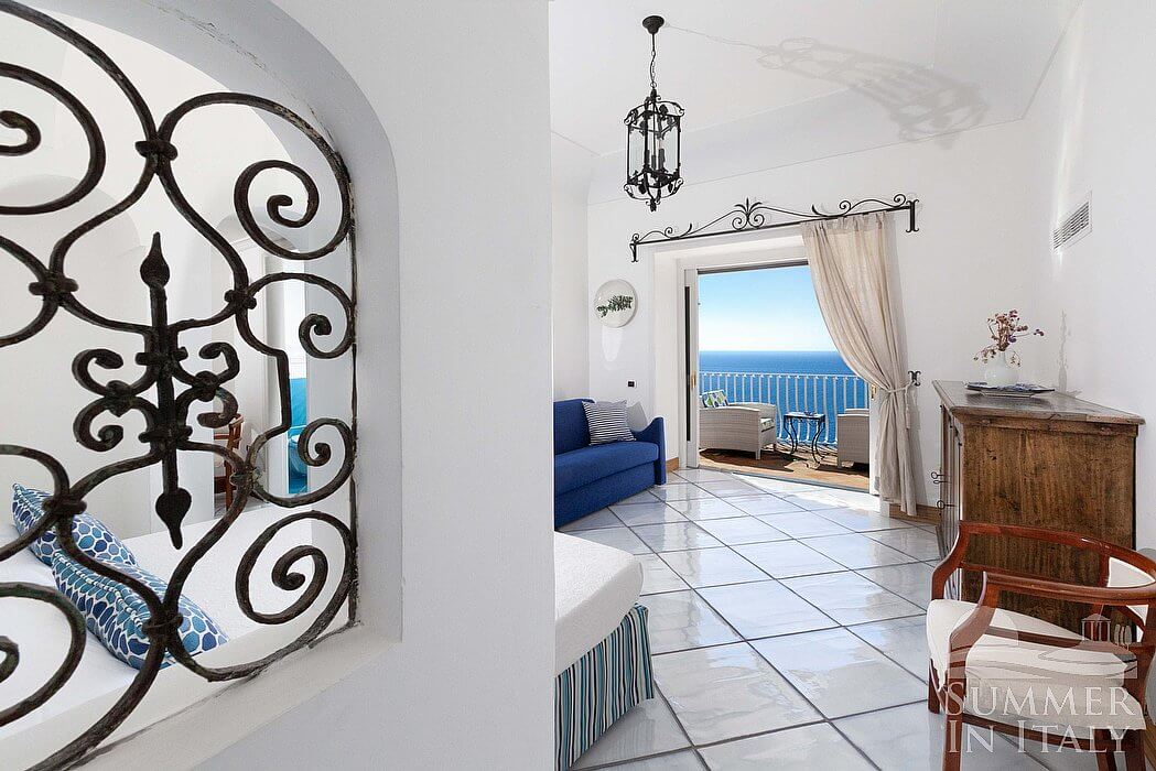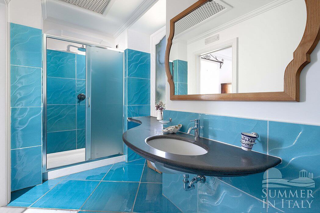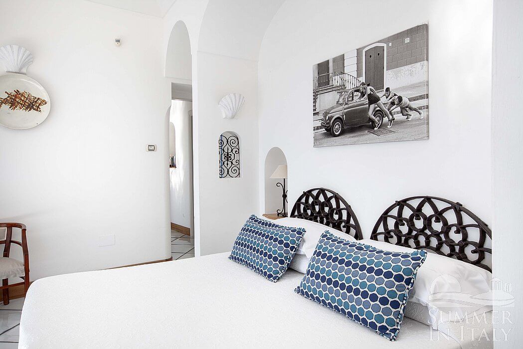 You will be able to enter the second bedroom from the corridor. The furnishings are elegant and refined. The room has a matrimonial bed (160 cm/63 inches, wider than a queen-size bed), that can be split into twins if requested (please contact our staff in advance to make arrangements). From the bedroom you will be able to enter the terrace with a view of the sea and of the coastline through a French door. The room has a window with a view of the sea, and it's equipped with an air conditioning/heating unit, and you will also find a safe. This bedroom has an en-suite bathroom, tiled with lucid handmade majolica tiles and equipped with a washbasin, a toilet, a large fully-enclosed shower and a hairdryer.