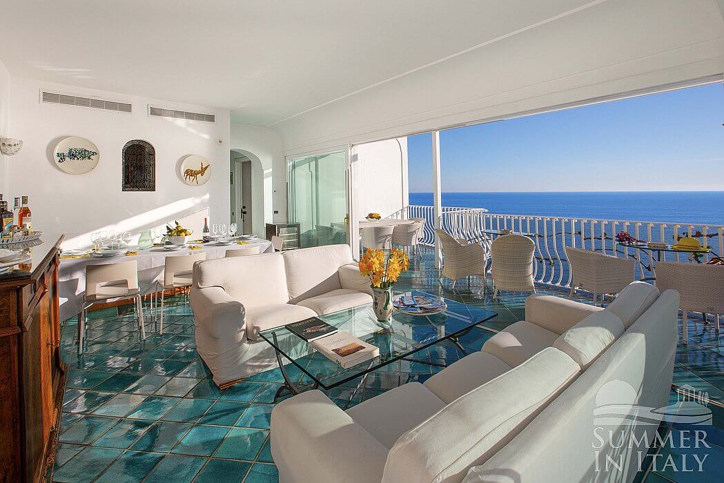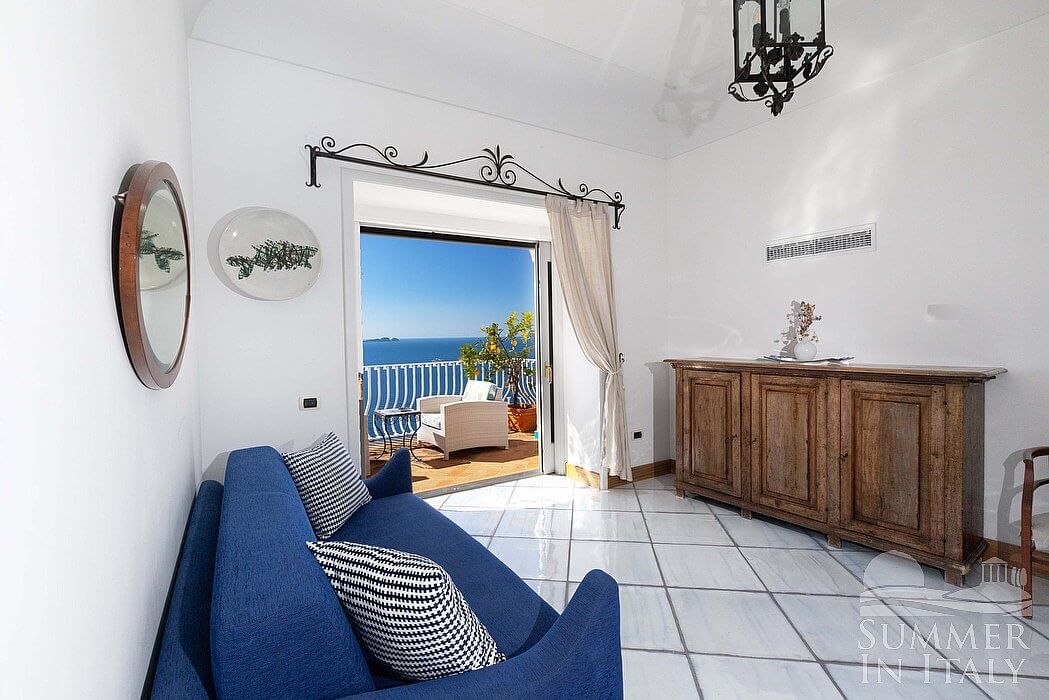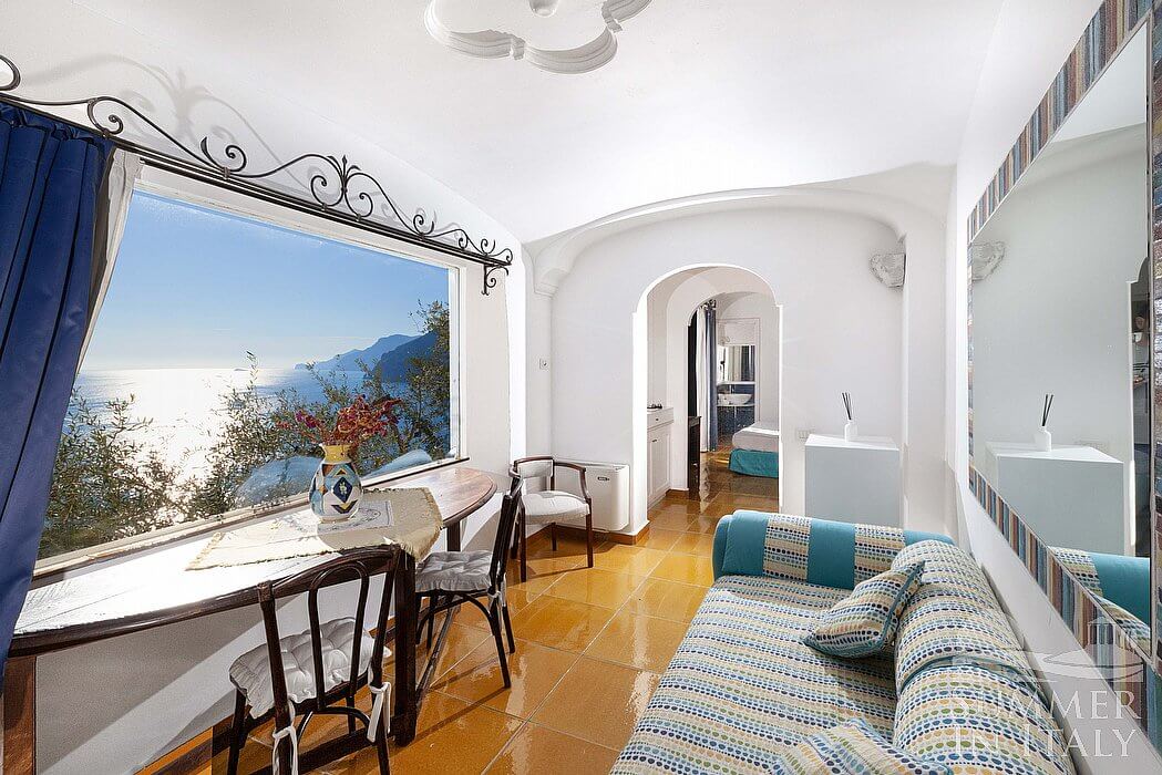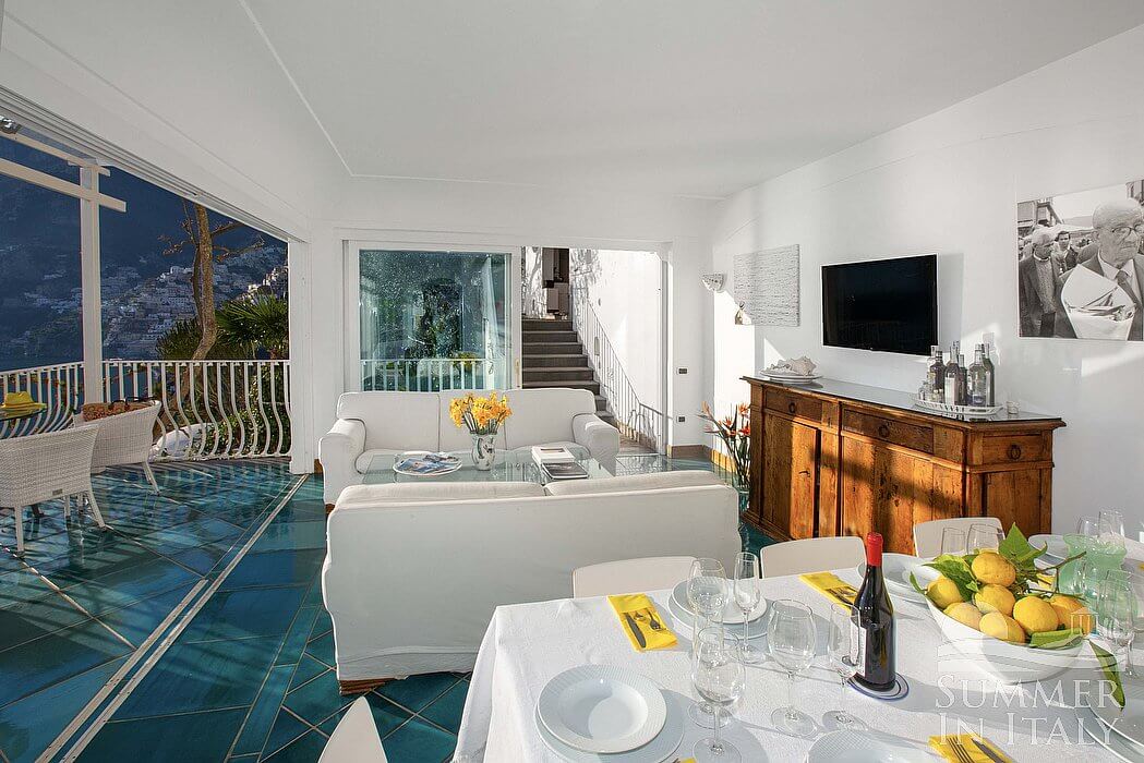 The living room is paved with handmade majolica tiles, in the characteristic style of the Amalfi Coast. The furnishings are elegant and bright, and include two sofas and two armchairs. The dining table can accommodate ten guests. In this room you will find a large flat-screen satellite television (local channels) and a DVD player. From the living room you will be able to enter the first terrace with a view of the sea and of Positano through two double-glazed French doors. The room is equipped with an air conditioning/heating unit.