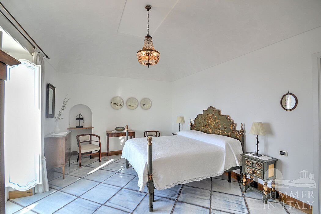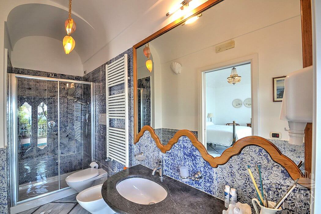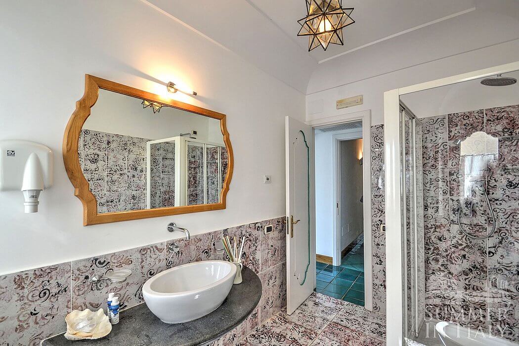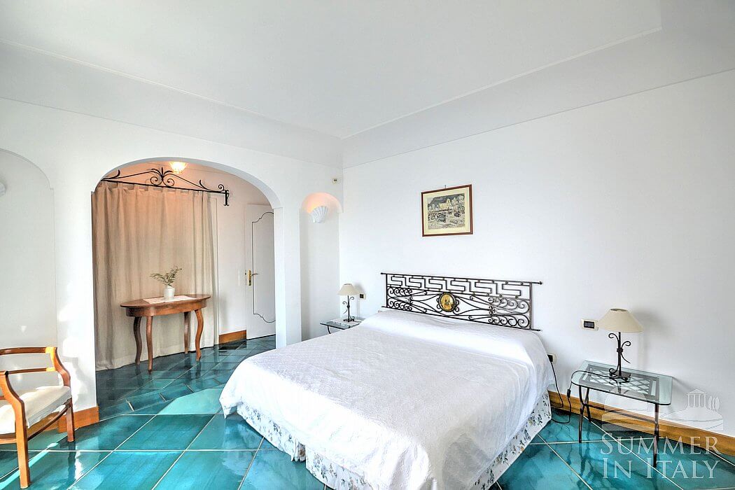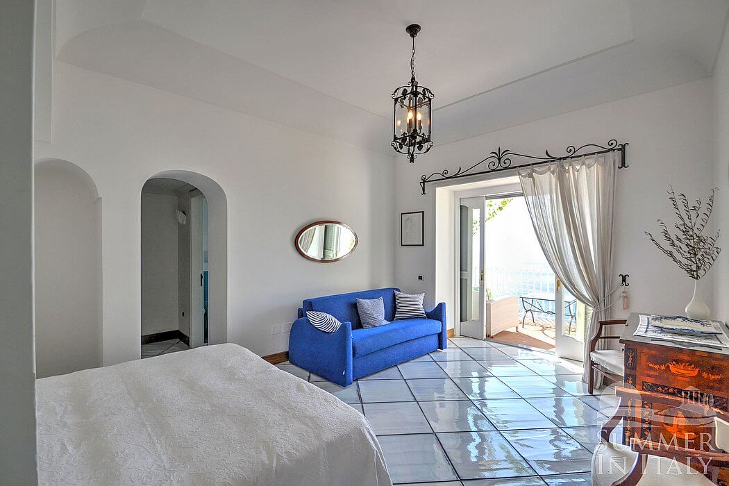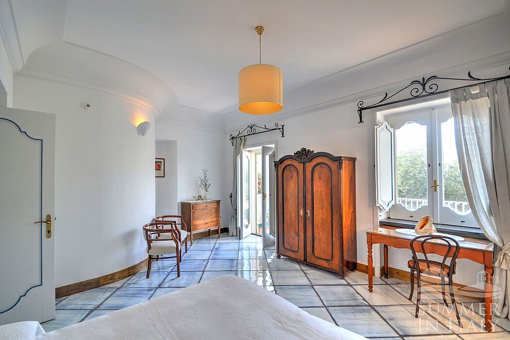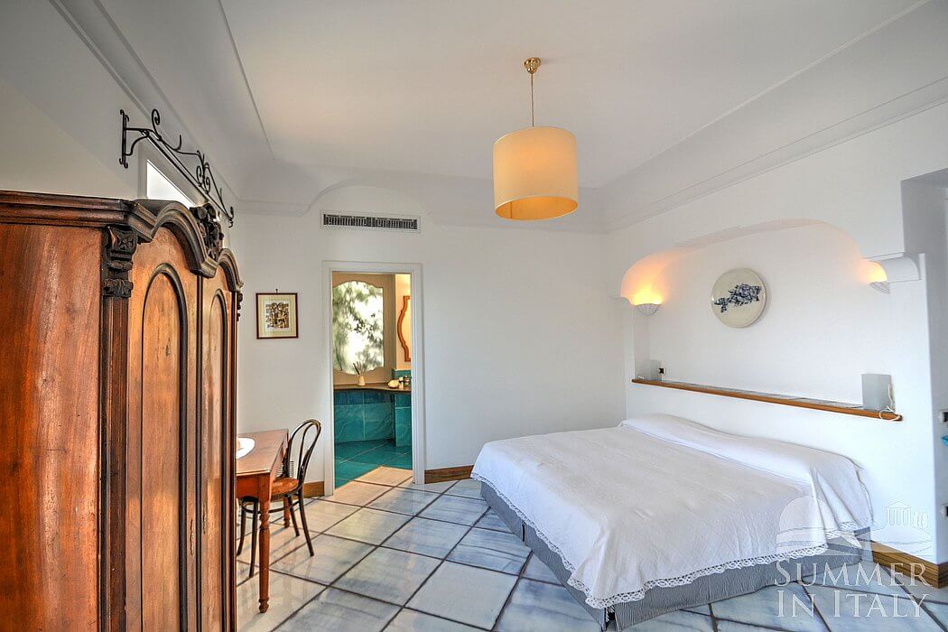 You will be able to enter the fifth bedroom from the corridor. The furnishings are elegant and bright, and include some antique pieces. The room has a matrimonial bed (160 cm/63 inches, wider than a queen-size bed), that can be split into twins if requested (please contact our staff in advance to make arrangements). The furnishings include a sofa. From the bedroom you will be able to enter the second terrace with a view of the sea and of the coast of Amalfi through a French door. The bedroom is equipped with an air conditioning/heating unit, and you will also find a safe. This bedroom has an en-suite bathroom, tiled with lucid handmade majolica tiles and equipped with a washbasin, a toilet, a jacuzzi bathtub and a hairdryer.