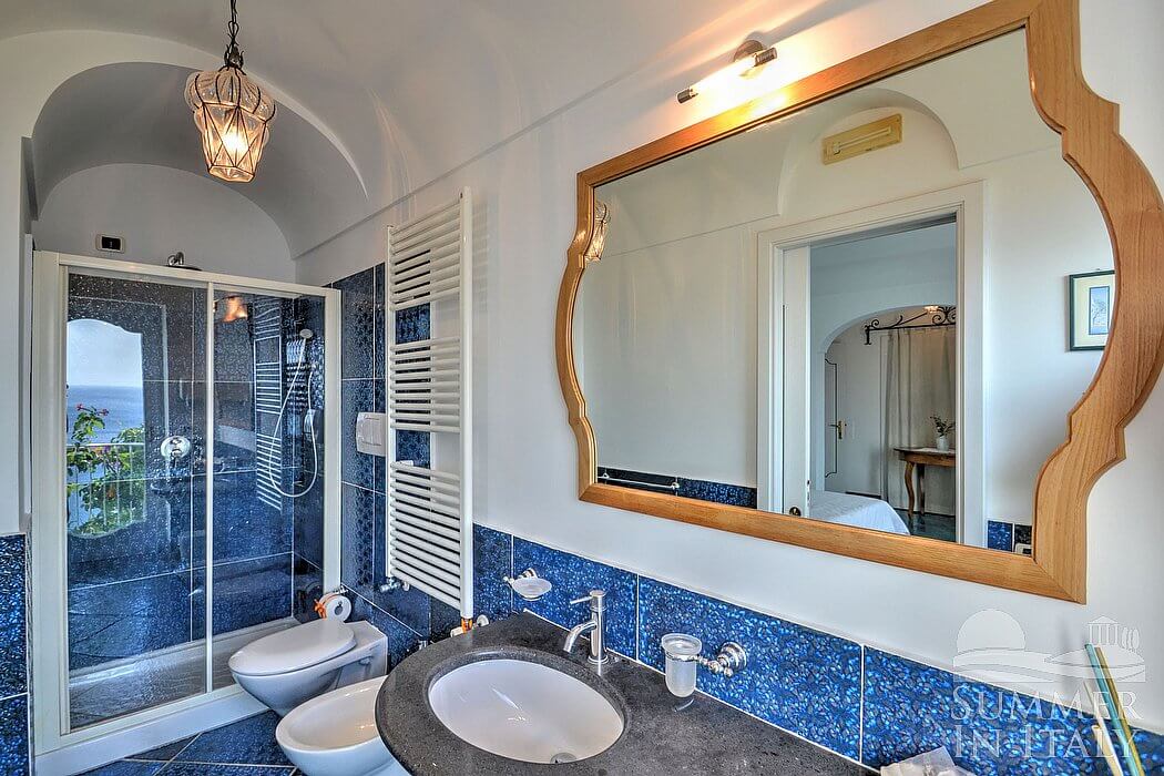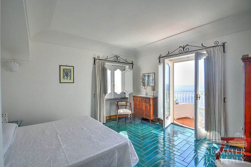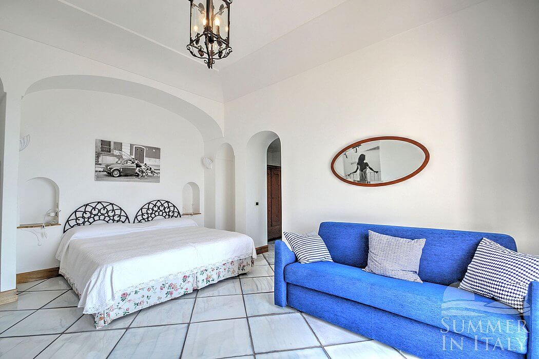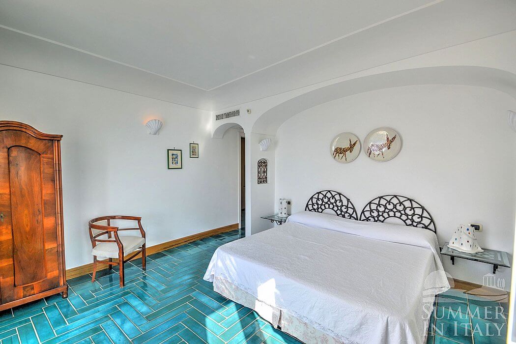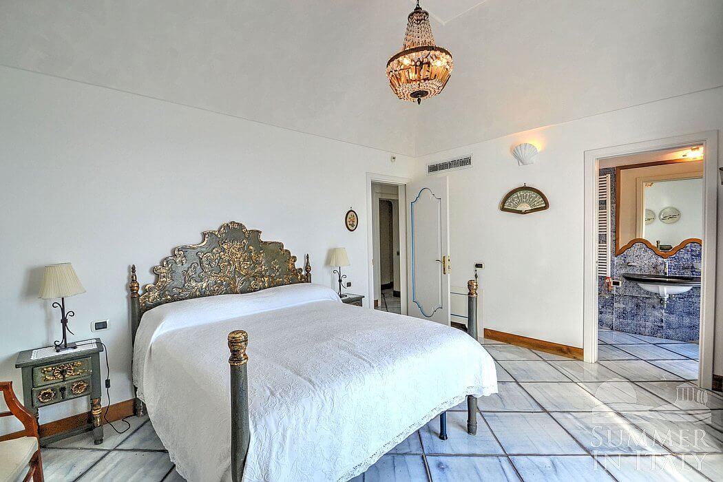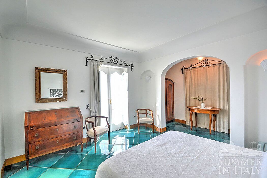 You will be able to enter the fifth bedroom from the corridor. The furnishings are elegant and bright, and include some antique pieces. The room has a matrimonial bed (160 cm/63 inches, wider than a queen-size bed), that can be split into twins if requested (please contact our staff in advance to make arrangements). The furnishings include a sofa. From the bedroom you will be able to enter the second terrace with a view of the sea and of the coast of Amalfi through a French door. The bedroom is equipped with an air conditioning/heating unit, and you will also find a safe. This bedroom has an en-suite bathroom, tiled with lucid handmade majolica tiles and equipped with a washbasin, a toilet, a jacuzzi bathtub and a hairdryer.