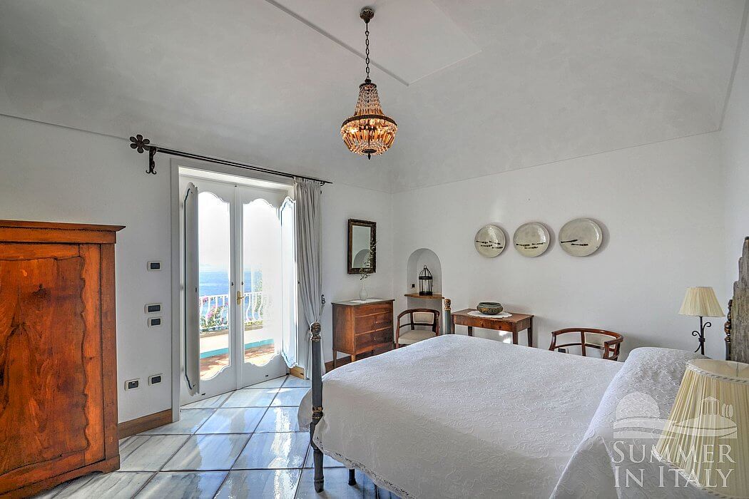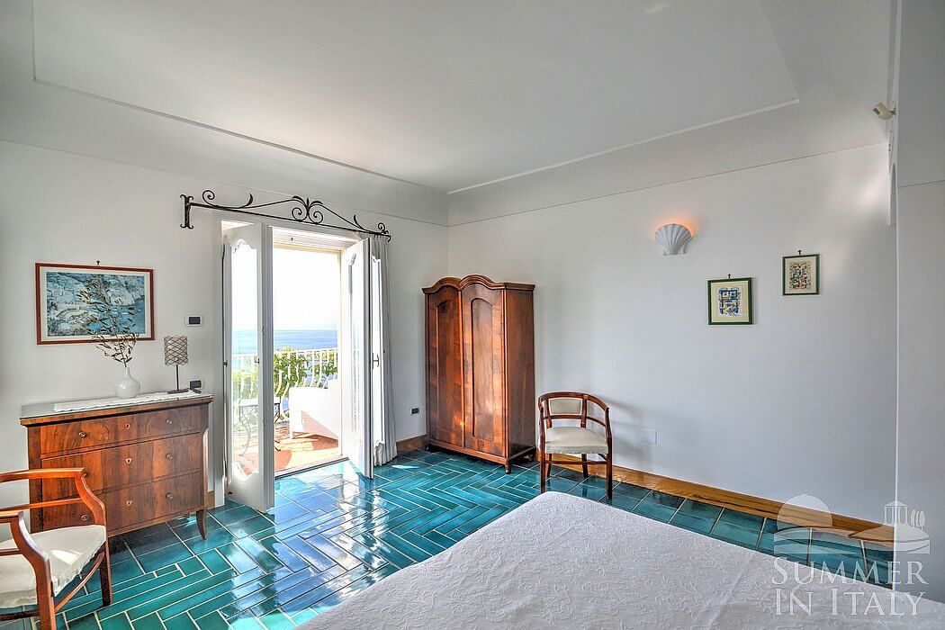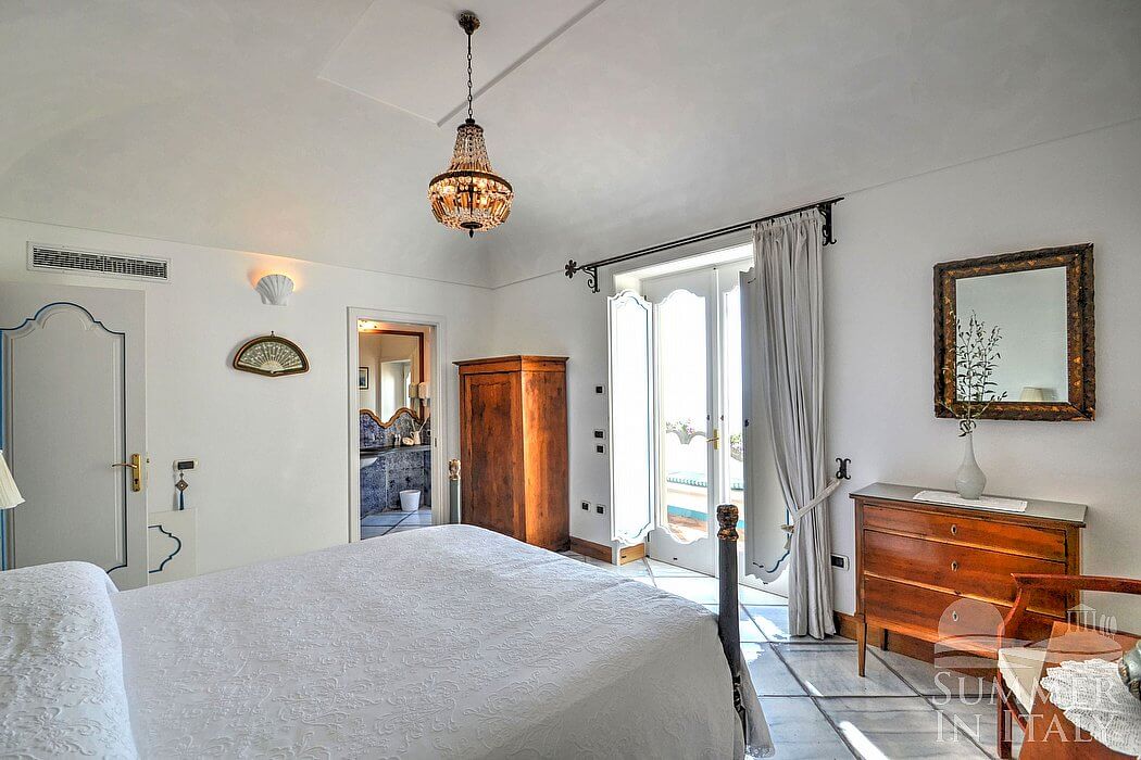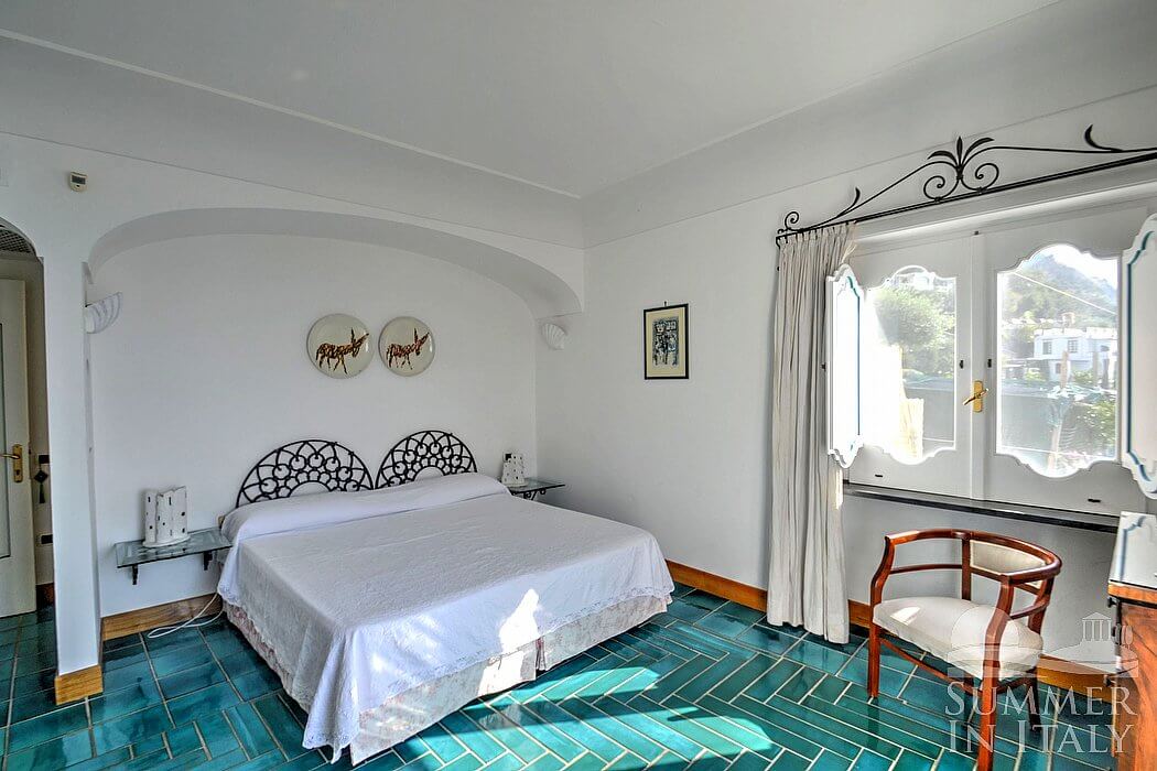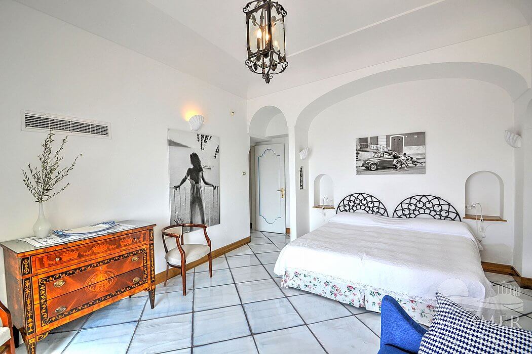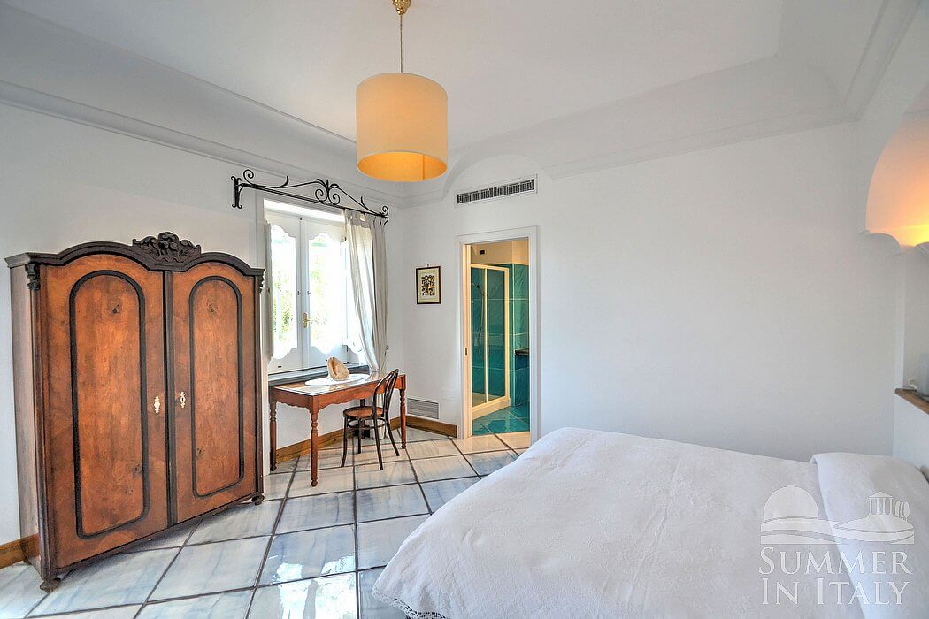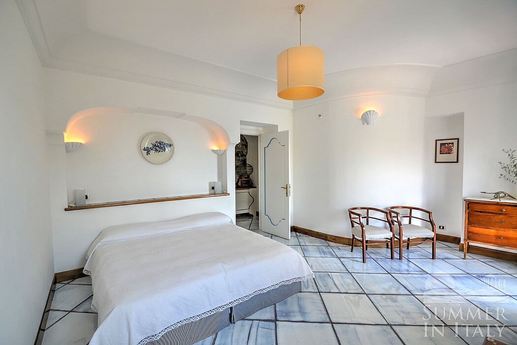 You will be able to enter the fifth bedroom from the corridor. The furnishings are elegant and bright, and include some antique pieces. The room has a matrimonial bed (160 cm/63 inches, wider than a queen-size bed), that can be split into twins if requested (please contact our staff in advance to make arrangements). The furnishings include a sofa. From the bedroom you will be able to enter the second terrace with a view of the sea and of the coast of Amalfi through a French door. The bedroom is equipped with an air conditioning/heating unit, and you will also find a safe. This bedroom has an en-suite bathroom, tiled with lucid handmade majolica tiles and equipped with a washbasin, a toilet, a jacuzzi bathtub and a hairdryer.