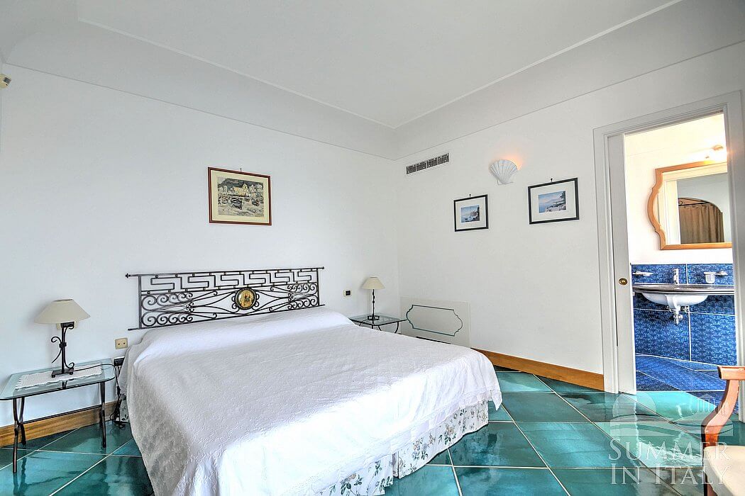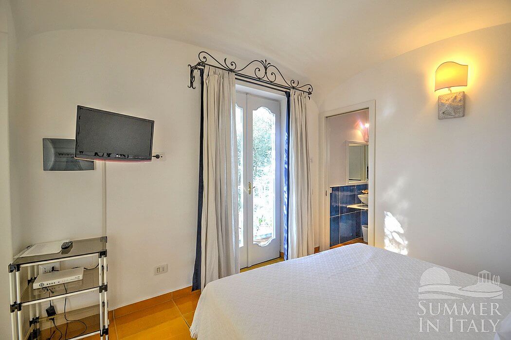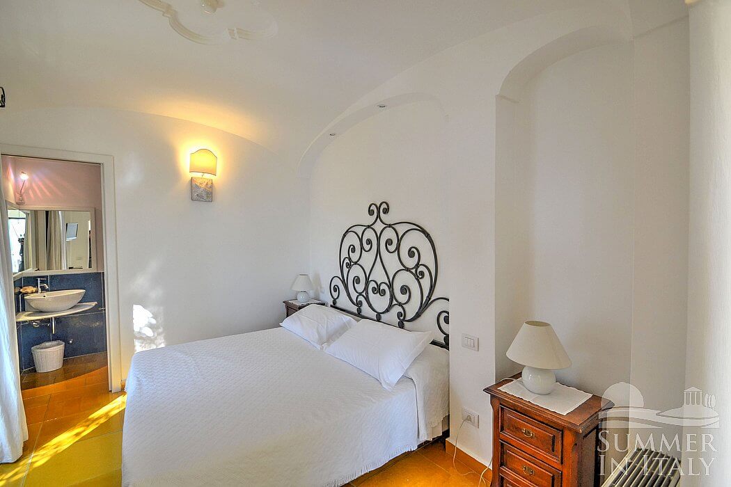 You will be able to enter the first bedroom from the corridor. The floor is paved with lucid sky-blue majolica tiles. The furnishings are elegant and refined, and include some antique pieces. The room has a matrimonial bed (160 cm/63 inches, wider than a queen-size bed), that can be split into twins if requested (please contact our staff in advance to make arrangements). From the bedroom you will be able to enter the small balcony with a view of the sea and of Positano through a French door. The bedroom is equipped with an air conditioning/heating unit, and you will also find a safe. This bedroom has an en-suite bathroom, tiled with lucid handmade majolica tiles and equipped with a washbasin, a toilet, a large fully-enclosed shower and a hairdryer.