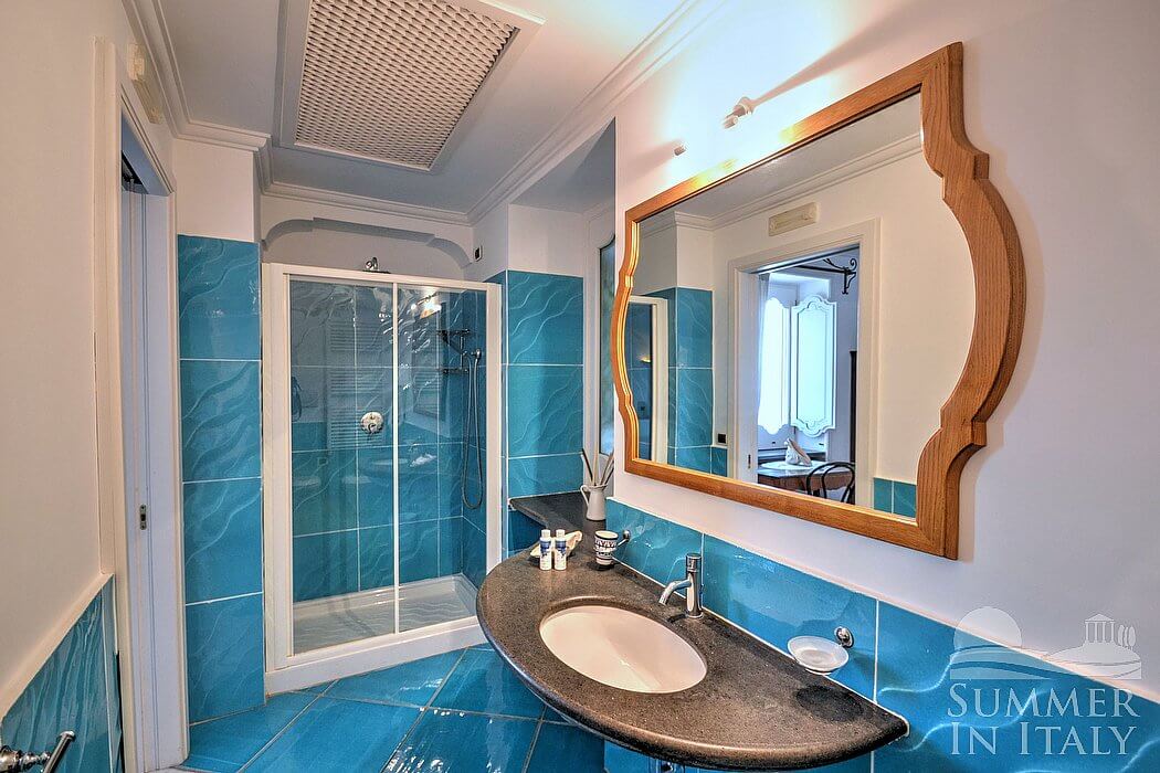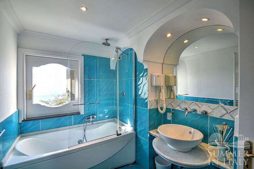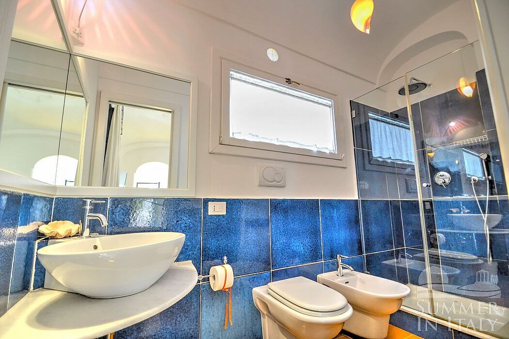 You will be able to enter the second bedroom from the corridor. The floor is paved with lucid sky-blue majolica tiles. The furnishings are elegant and bright, and include some antique pieces. The room has a matrimonial bed (160 cm/63 inches, wider than a queen-size bed), that can be split into twins if requested (please contact our staff in advance to make arrangements). From the bedroom you will be able to enter a terrace with a view of the sea and of the coastline through a French door. The room has a window with a view of the sea and of the coastline. The bedroom is equipped with an air conditioning/heating unit, and you will also find a safe. This bedroom has an en-suite bathroom, spacious and equipped with a washbasin, a toilet, a large fully-enclosed shower and a hairdryer.