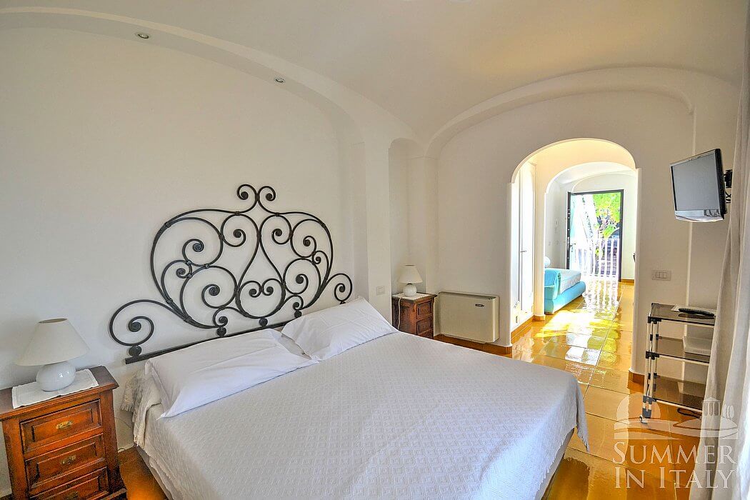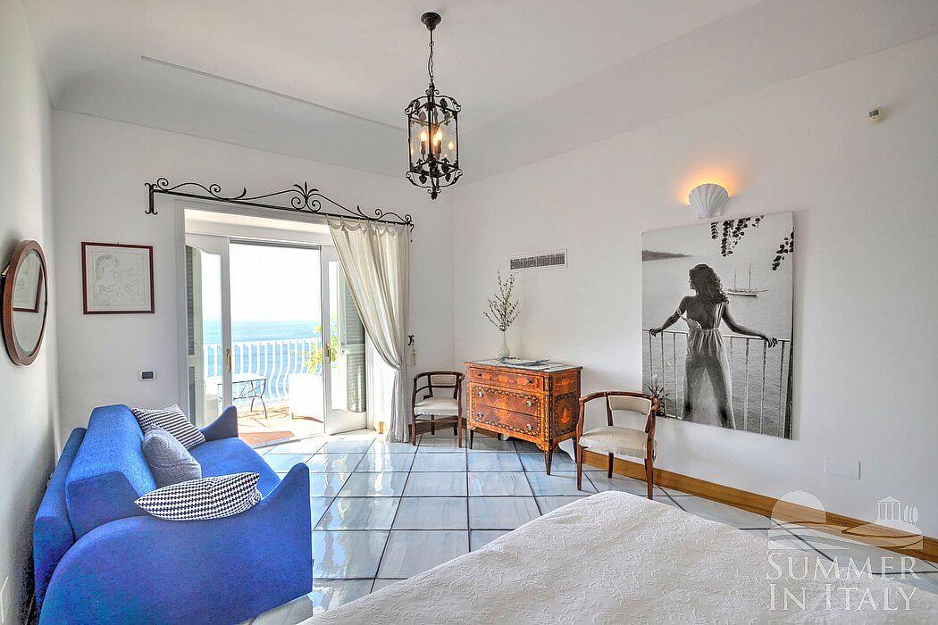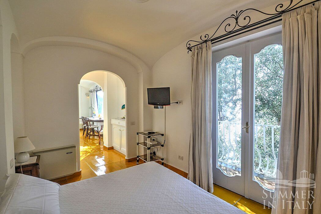 This suite is made up by three interconnected rooms: a sleeping area, a sitting area and a bathroom. You will be able to enter the sixth bedroom from the garden. The bedroom has a matrimonial bed (160 cm/63 inches, wider than a queen-size bed), that can be split into twins if requested (please contact our staff in advance to make arrangements). The furnishings include a sofa and a desk. In this room you will find a satellite television (local channels). The room has two windows with a view of the sea and of the island of Li Galli. The bedroom is equipped with an air conditioning/heating unit, and you will also find a safe. This bedroom has an en-suite bathroom, spacious and equipped with a washbasin, a toilet, a fully enclosed shower and a hairdryer.