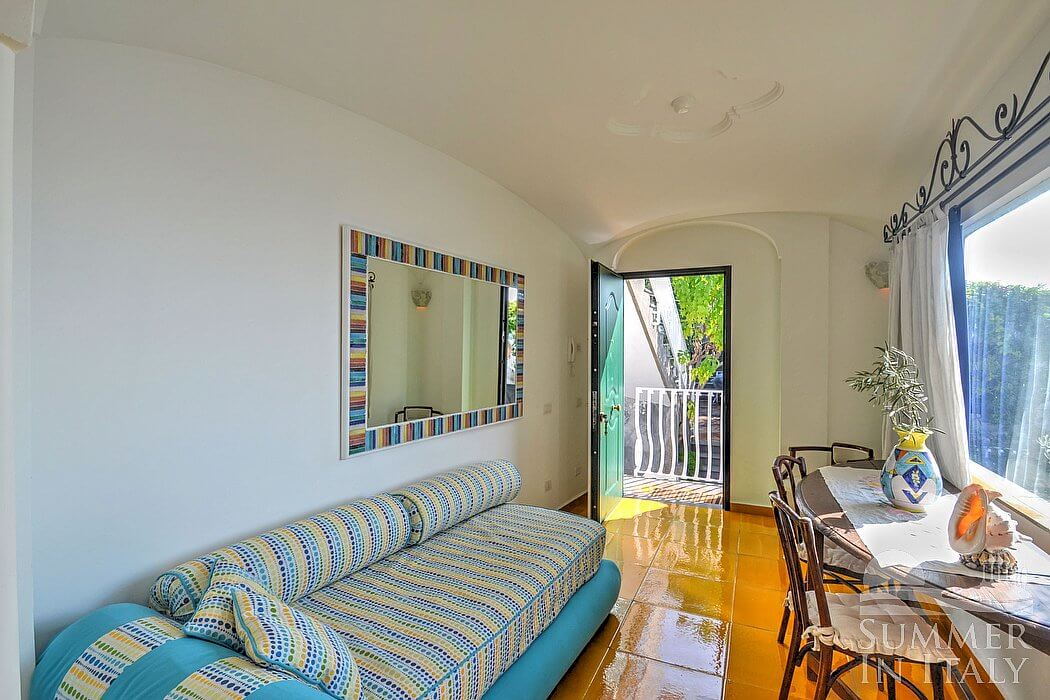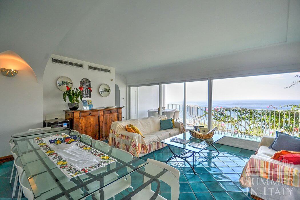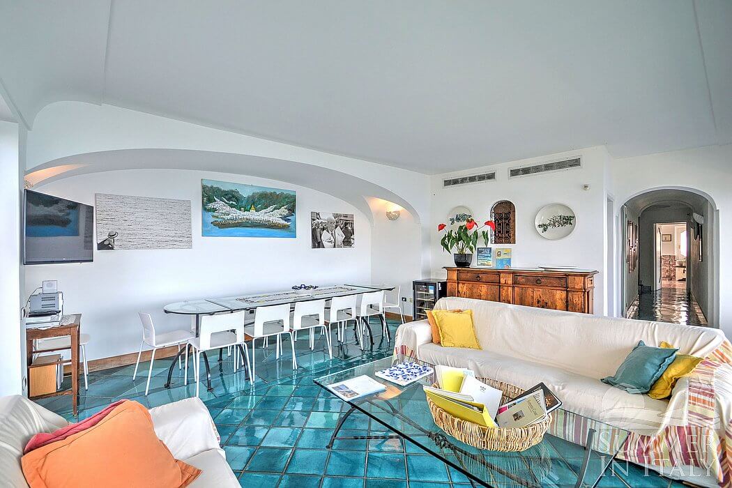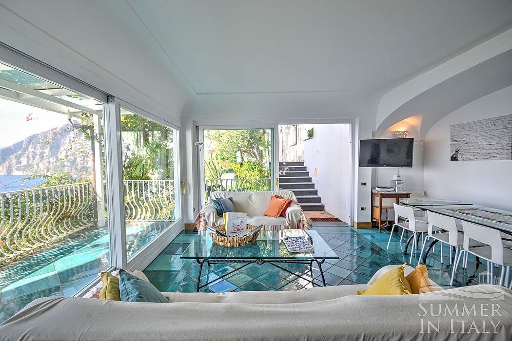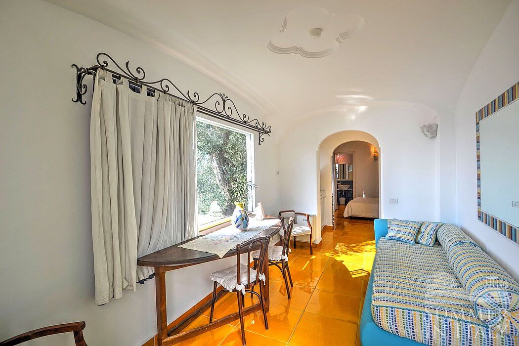 The living room is paved with handmade majolica tiles, in the characteristic style of the Amalfi Coast. The furnishings are elegant and bright. The furnishings include two sofas and two armchairs. The dining table can accommodate 12 guests. In this room you will find a large flat-screen satellite television (local channels) and a DVD player. From the living room you will be able to enter the first terrace with a view of the sea and of Positano through two double-glazed French doors. The room is equipped with an air conditioning/heating unit.