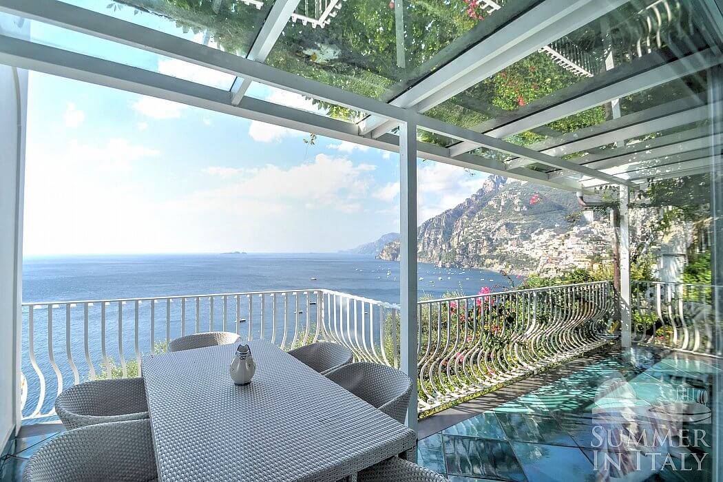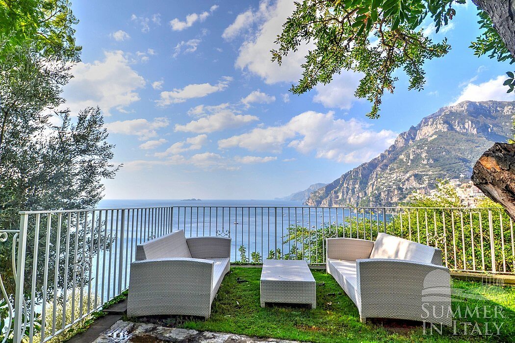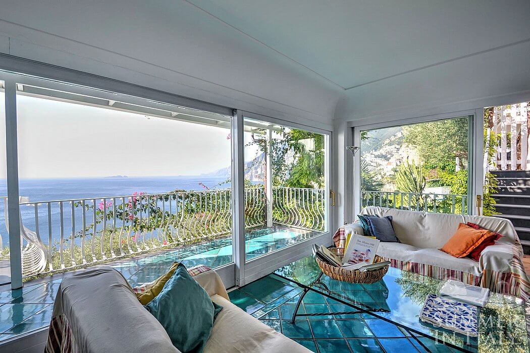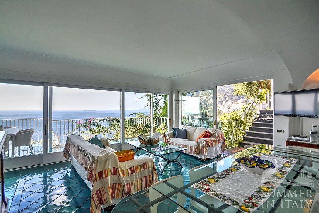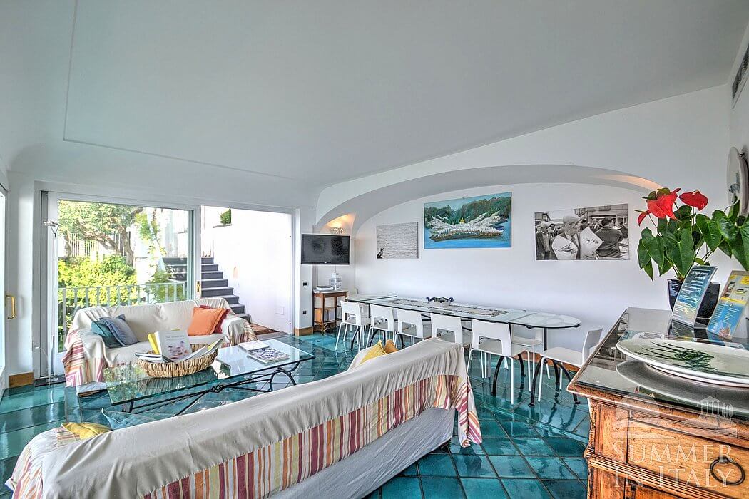 The living room is paved with handmade majolica tiles, in the characteristic style of the Amalfi Coast. The furnishings are elegant and bright. The furnishings include two sofas and two armchairs. The dining table can accommodate 12 guests. In this room you will find a large flat-screen satellite television (local channels) and a DVD player. From the living room you will be able to enter the first terrace with a view of the sea and of Positano through two double-glazed French doors. The room is equipped with an air conditioning/heating unit.