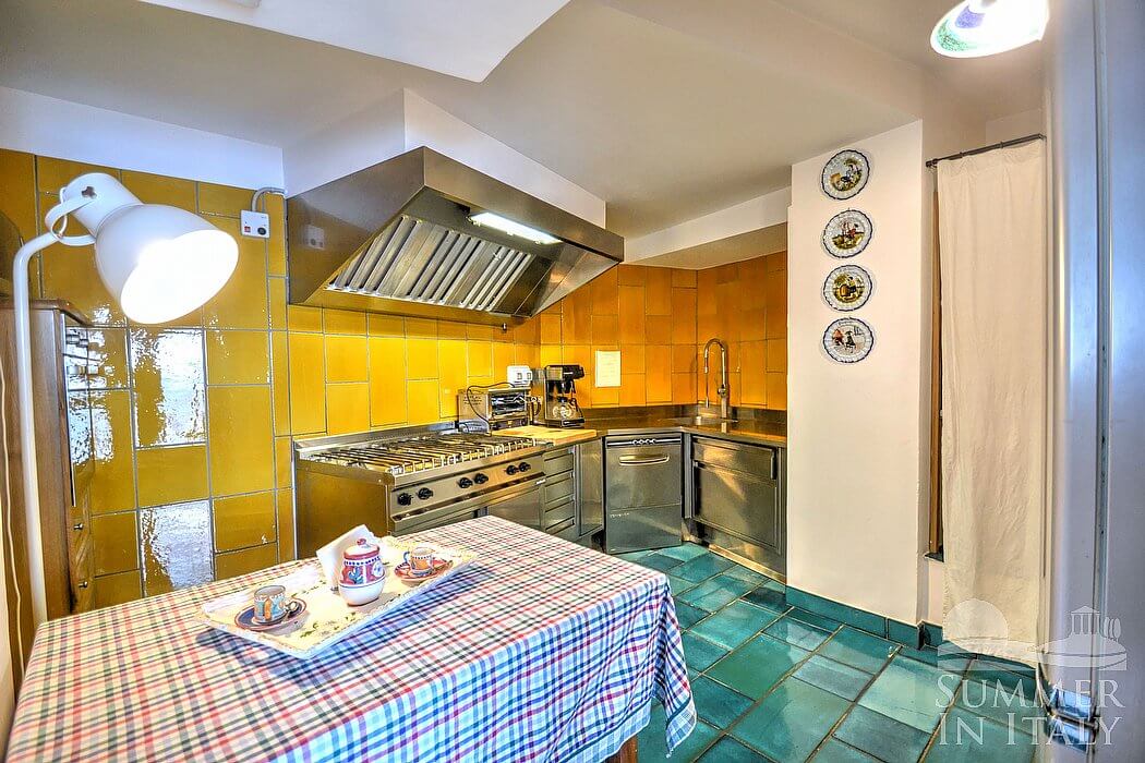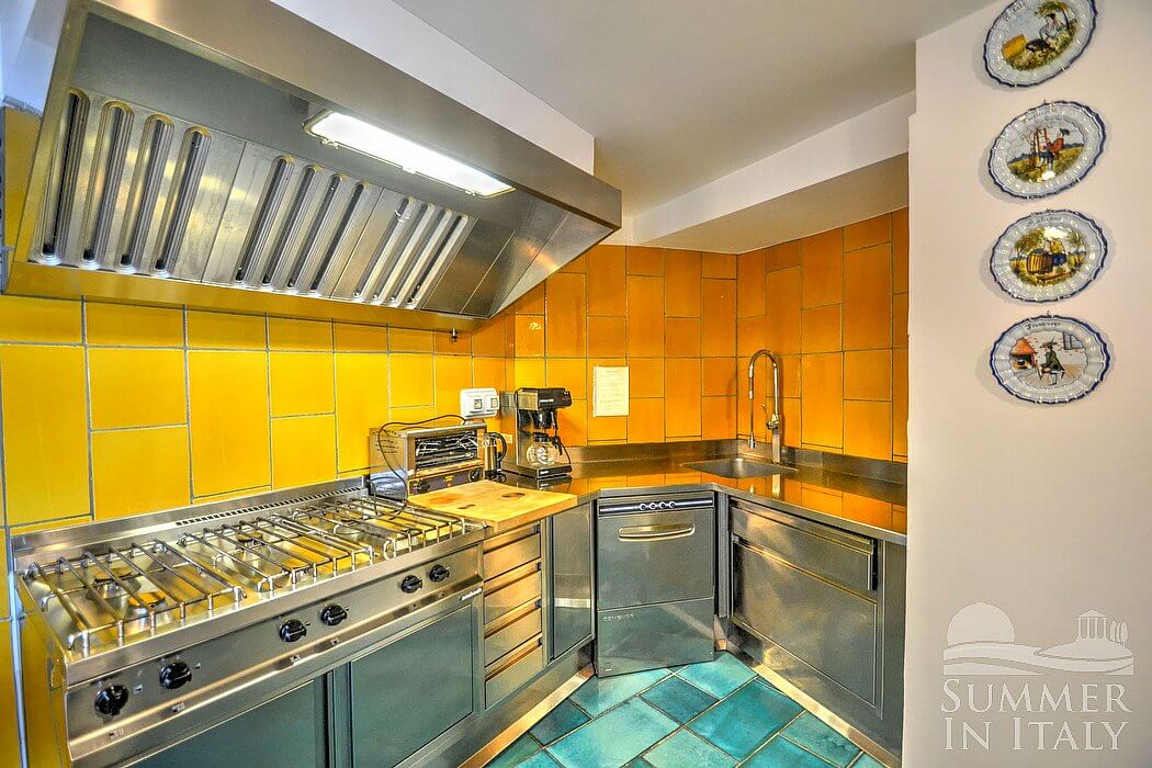 You will be able to enter the kitchen from the living room. It is professional-grade, equipped with a six-burner gas cooker, an electric oven, a large refrigerator with freezer, a dishwasher, a microwave oven, an Italian-style coffee-maker, an American-style coffee-maker (bring your filters!), a toaster and other small appliances.