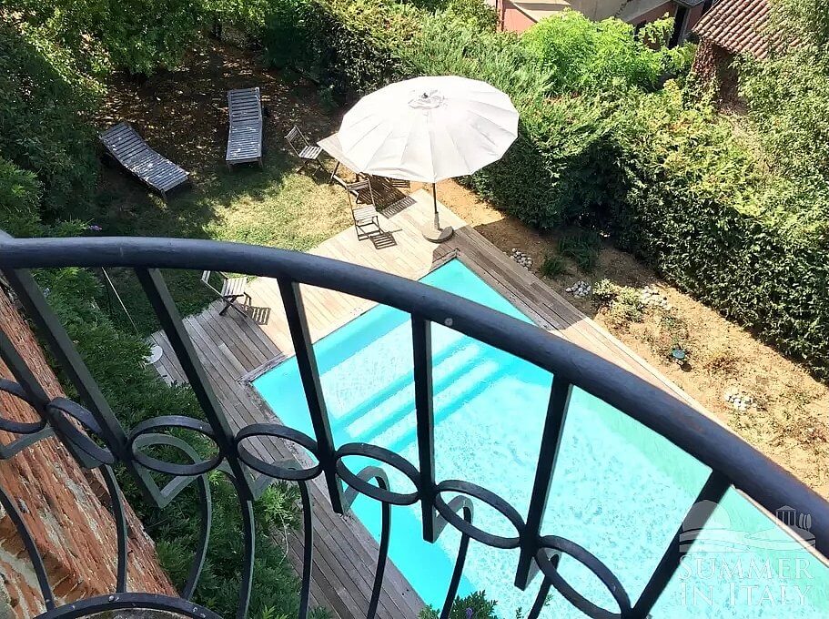 You will reach the swimming pool from the garden going down a stairway which consists of approximately 20 steps. The pool is 6 meters (20 feet) large by 12 meters (39 feet) long. The area is equipped with a table, chairs, a sun umbrella and sun loungers. From the swimming pool you will enjoy a broad view of the greenery. The pool is open from the beginning of June until mid-September.
