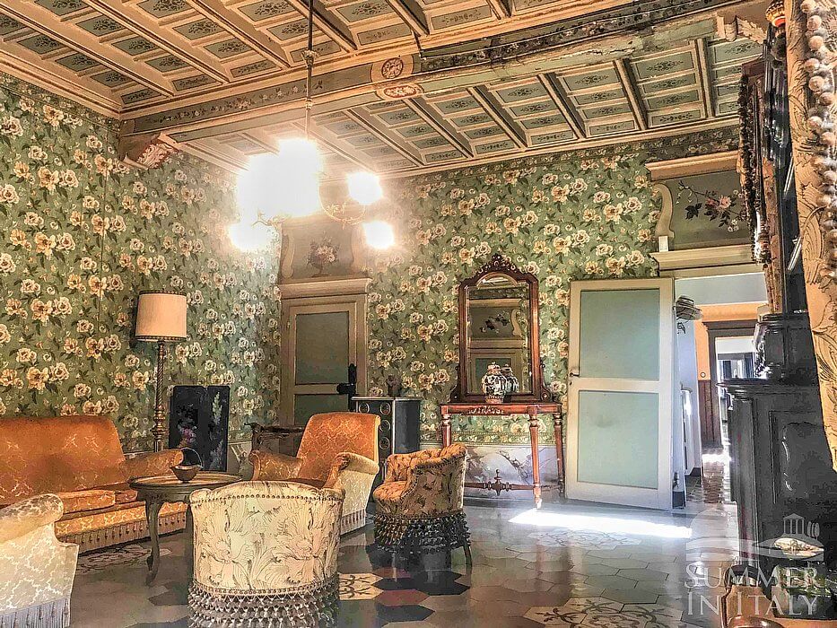 An elegant and welcoming two-story historical villa located on top of a small hill