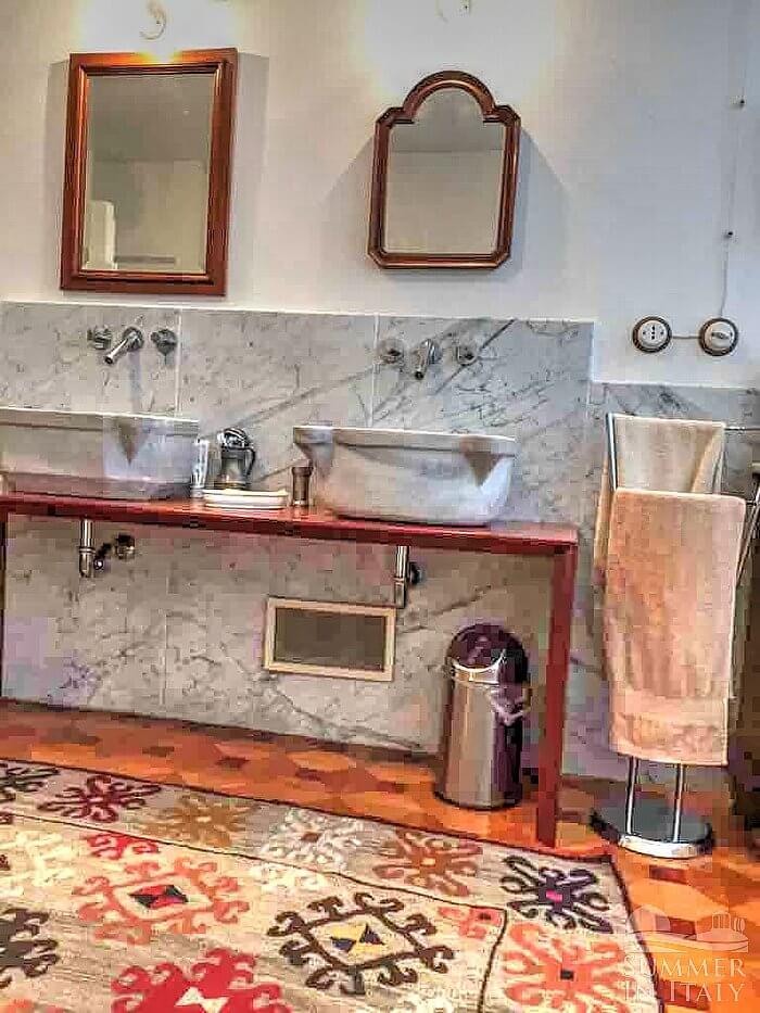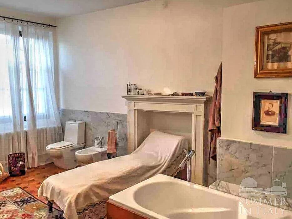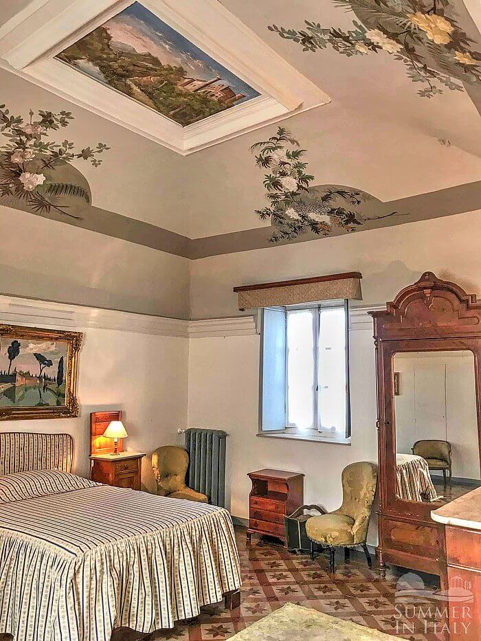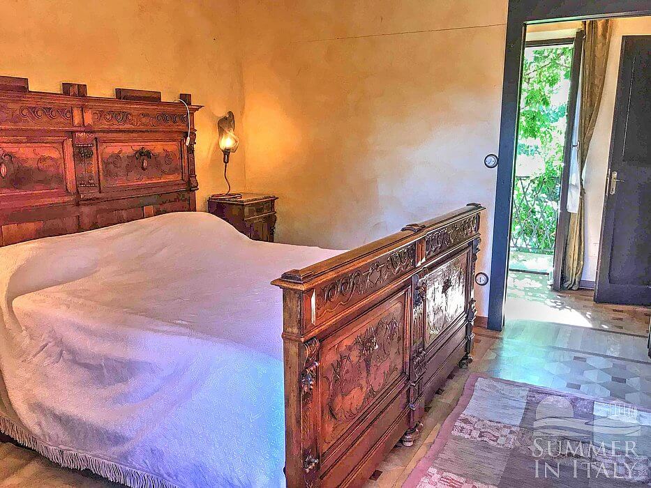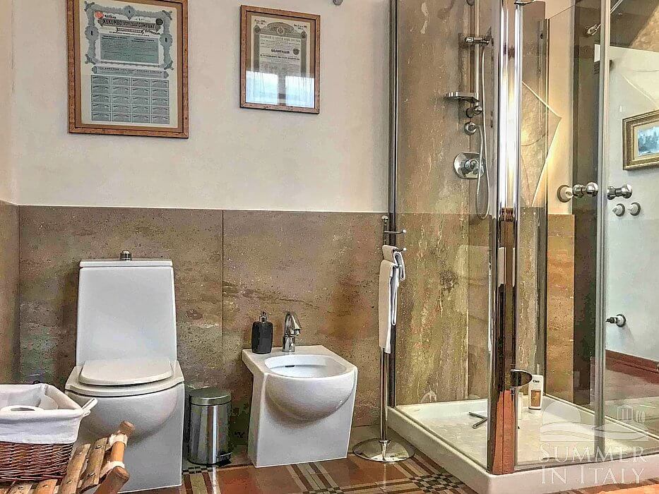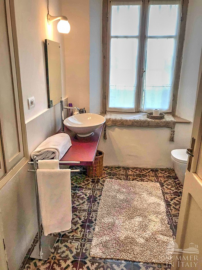 You will be able to enter the first bedroom through a corridor. The ceiling is frescoed. It has a French bed (120 cm/47 inches). The furnishings include armchairs. From the bedroom you will be able to enter the small balcony through a French door. The room also has a window. This bedroom has an en-suite bathroom, equipped with a washbasin, a toilet, a fully enclosed shower and a hairdryer.