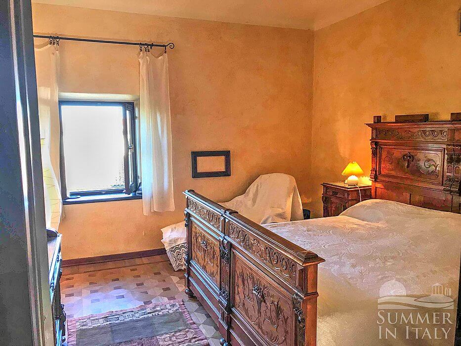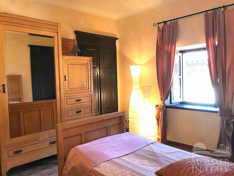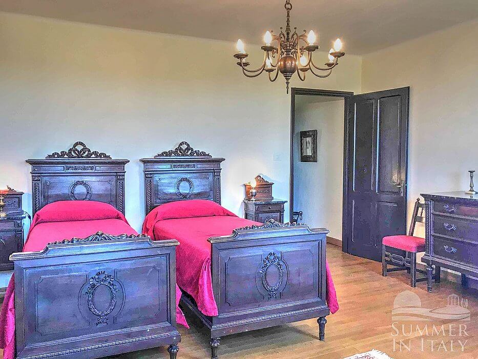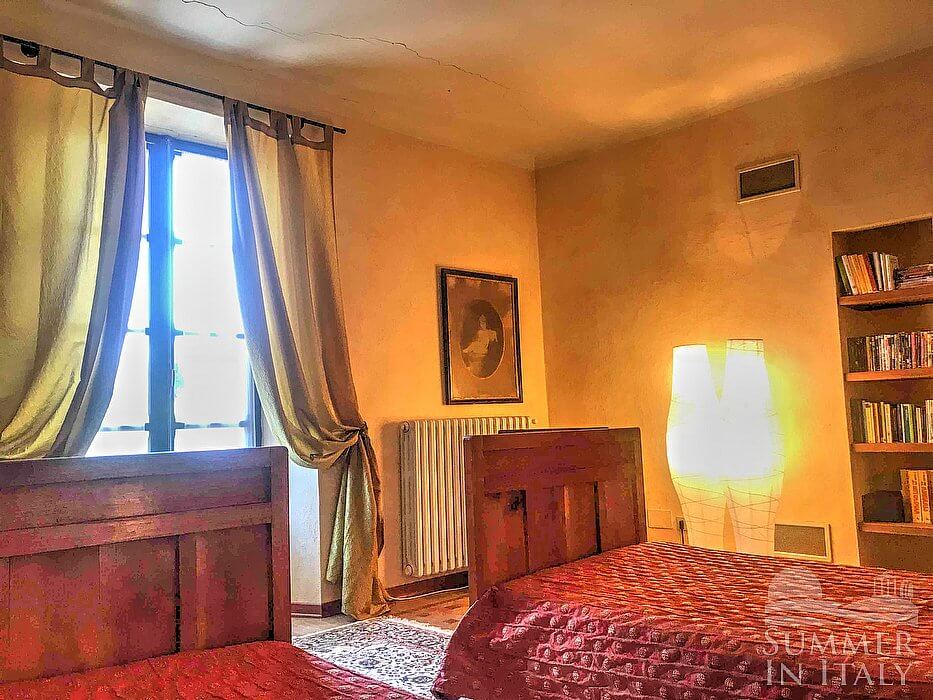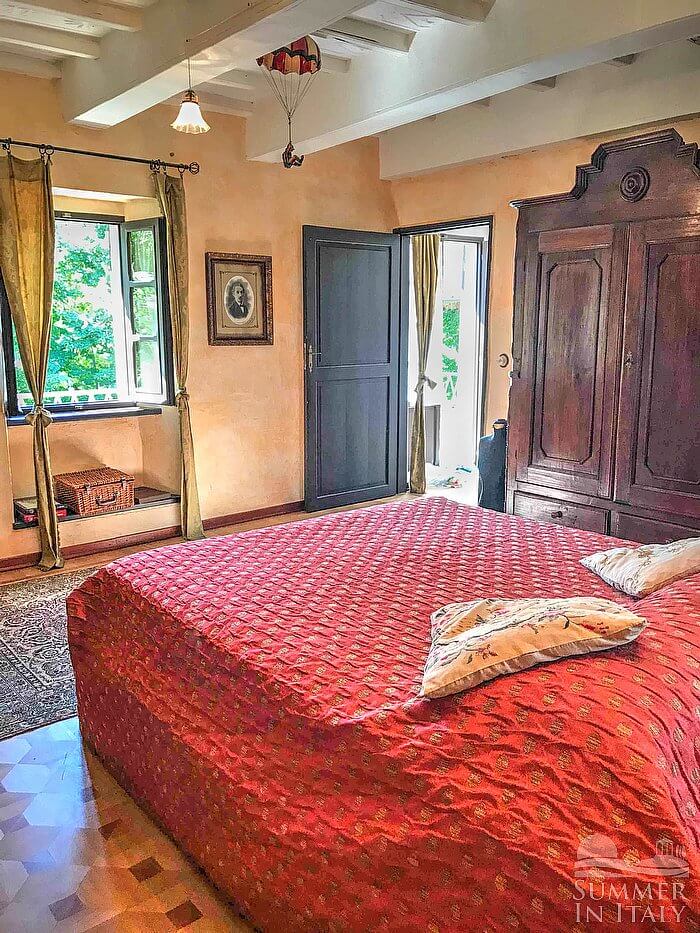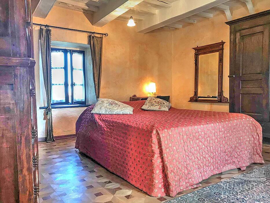 Important notice: members of your party will need to walk through this bedroom to reach the fourth the fifth and the sixth bedroom. You will be able to enter the third bedroom through a corridor. The ceiling has characteristic exposed wood beams. The room has a matrimonial bed (160 cm/62 inches, wider than a queen-size bed). The room has two windows.