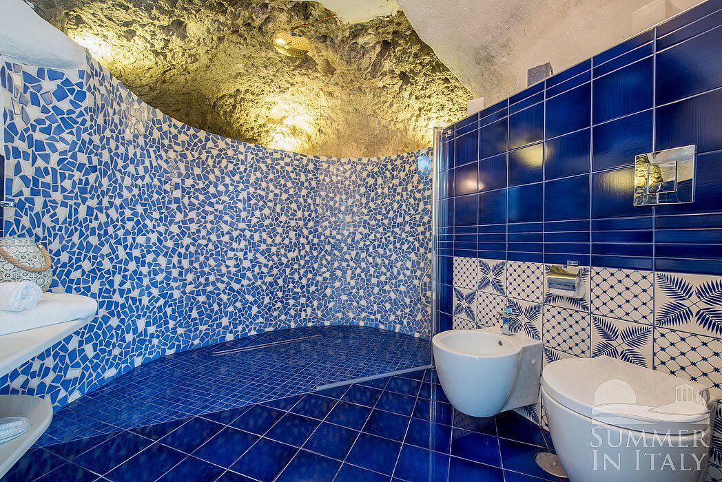 You will be able to enter the first bedroom from the dining room. The ceiling is vaulted. The furnishings are modern and welcoming. The room has a matrimonial bed (160 cm/63 inches, wider than a queen-size bed). The furnishings include a sofa and an armchair. In this room you will find a satellite television (local channels). From the bedroom you will be able to enter the patio through a French door. The room also has a small high window, and it's equipped with an air conditioning/heating unit. This bedroom has an en-suite bathroom, dug into the rock and equipped with a washbasin, a toilet, a large fully-enclosed shower and a hairdryer.