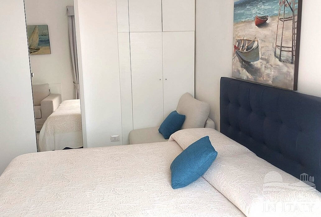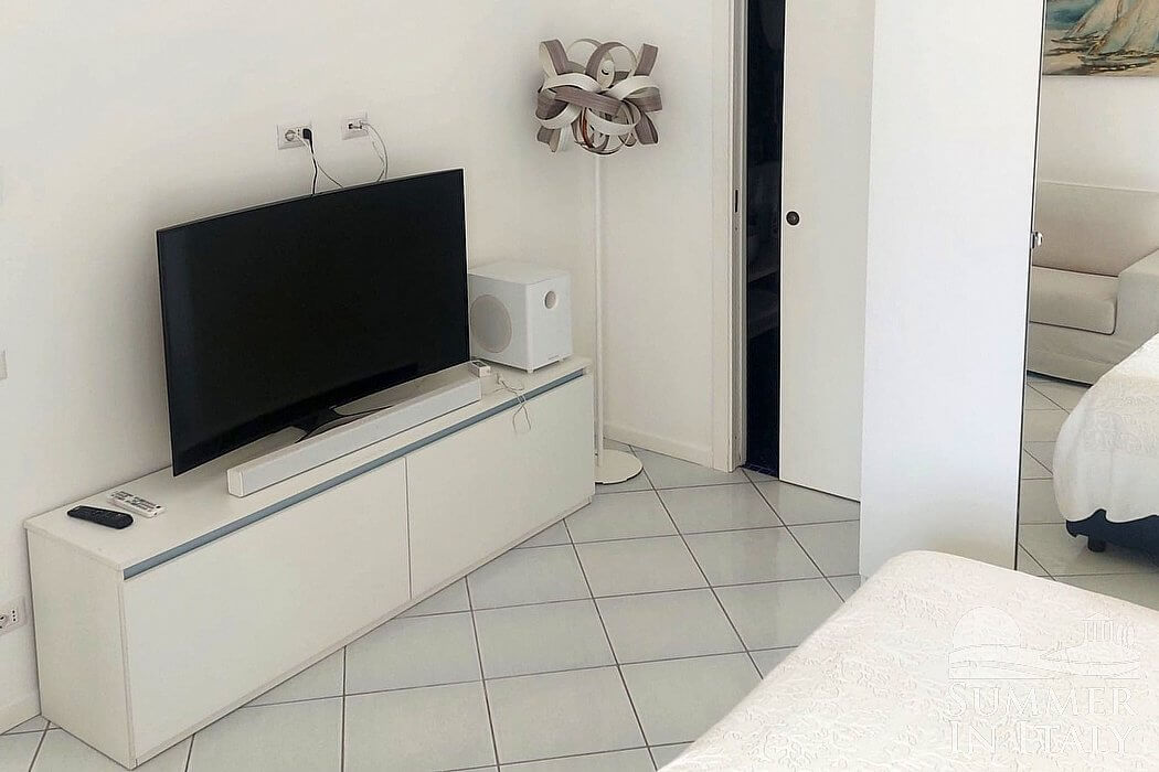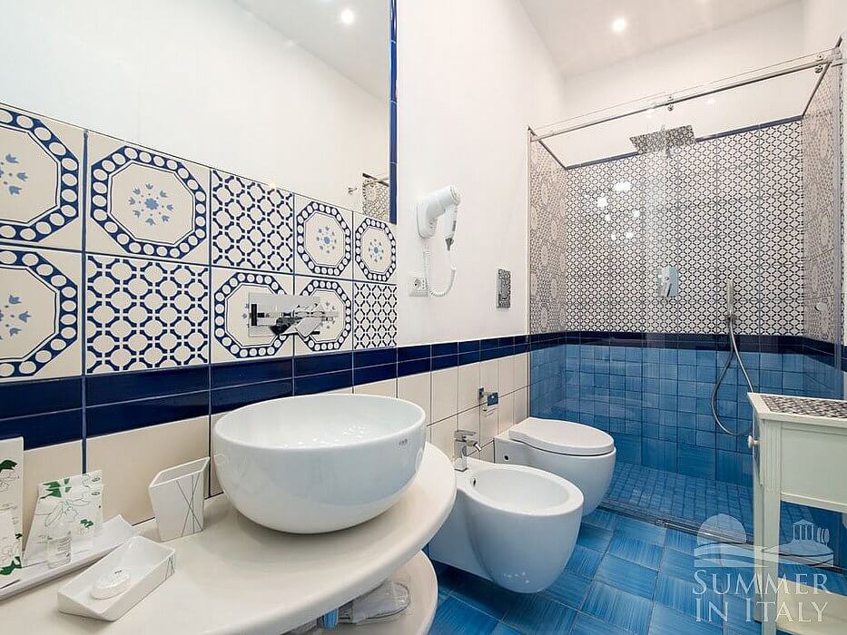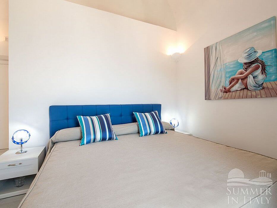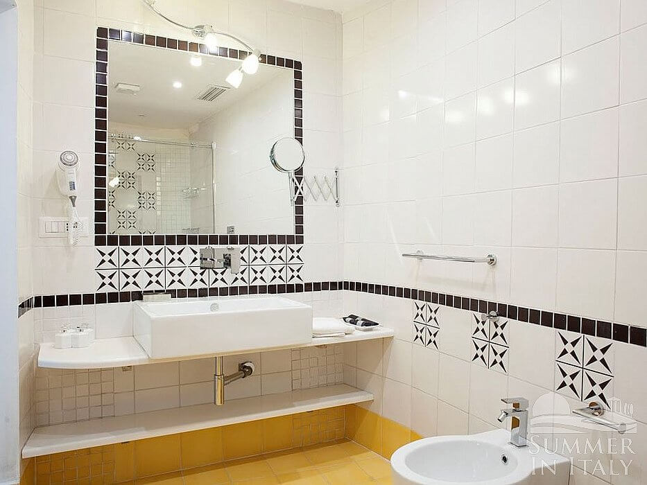 You will be able to enter the fourth bedroom through an external access. The bedroom has a matrimonial bed (160 cm/63 inches, wider than a queen-size bed), that can be split into twins if requested (please contact our staff in advance to make arrangements). The furnishings include a desk. In this room you will find a satellite television (local channels). The room has a Juliet balcony, and it's equipped with an air conditioning/heating unit. This bedroom has an en-suite bathroom, equipped with a washbasin, a toilet, a fully enclosed shower and a hairdryer.
