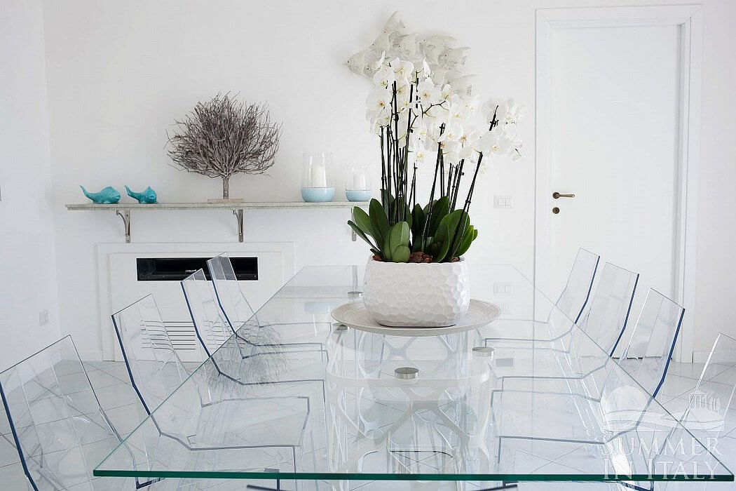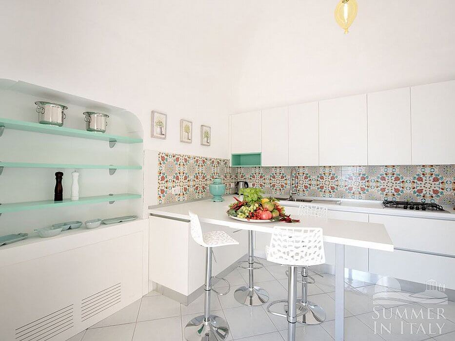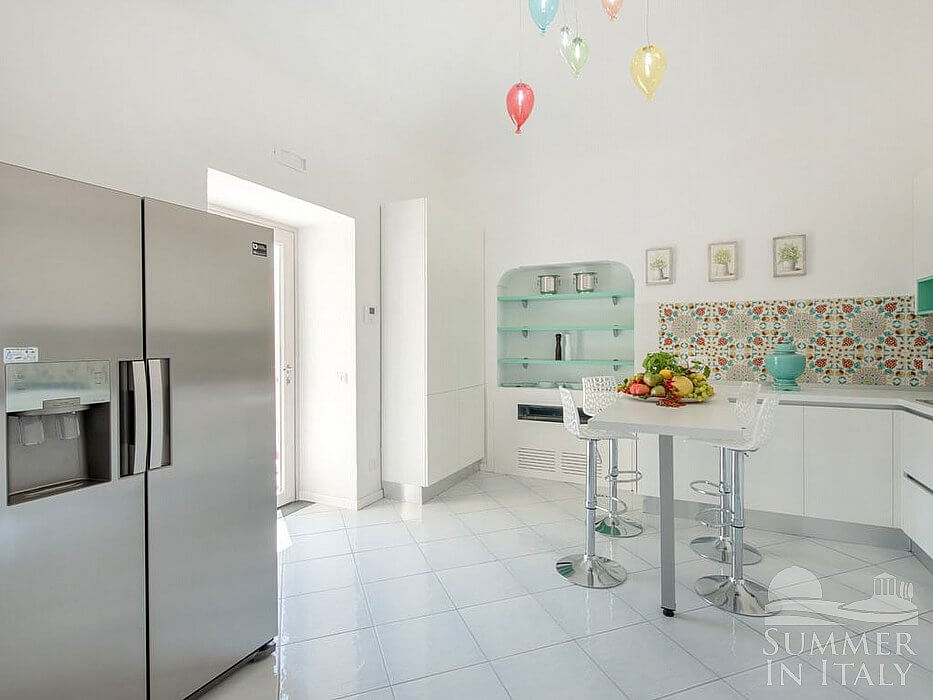 The kitchen is equipped with a four-burner gas cooker, an electric oven, an American-style refrigerator with ice-maker, a dishwasher, an Italian-style coffee-maker, an American-style coffee-maker and a kettle. From the kitchen a French door will take you to the patio. The kitchen is equipped with an air conditioning/heating unit.