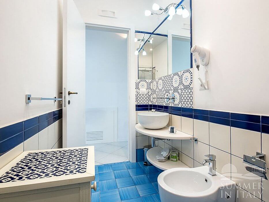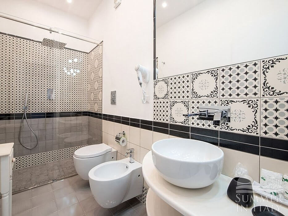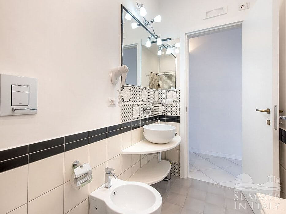 You will be able to enter the second bedroom through an external access. The bedroom has a matrimonial bed (160 cm/63 inches, wider than a queen-size bed), that can be split into twins if requested (please contact our staff in advance to make arrangements). The furnishings include a desk. In this room you will find a satellite television (local channels). The room has a Juliet balcony, and it's equipped with an air conditioning/heating unit. This bedroom has an en-suite bathroom, equipped with a washbasin, a toilet, a fully enclosed shower and a hairdryer.