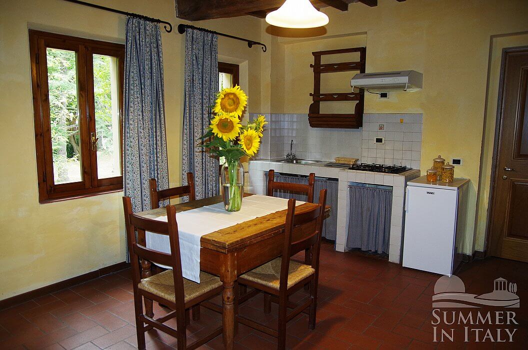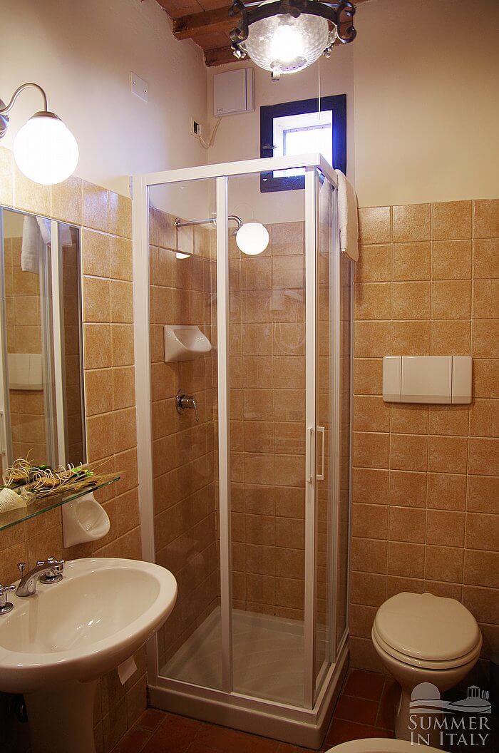 The living room is paved with terracotta tiles. The ceiling has characteristic exposed wood beams. The furnishings are in the traditional style of the Tuscan countryside. The furnishings include a divan that unfolds into a double bed (available upon request with an additional cost -- please contact our staff in advance). In the living room you will also find a cooking area. The kitchenette is equipped with a four-burner gas cooker, a small refrigerator without freezer and an Italian-style coffee-maker. The dining table can accommodate four guests. The room has two windows with a view of the garden. It is equipped with an air conditioning/heating unit.