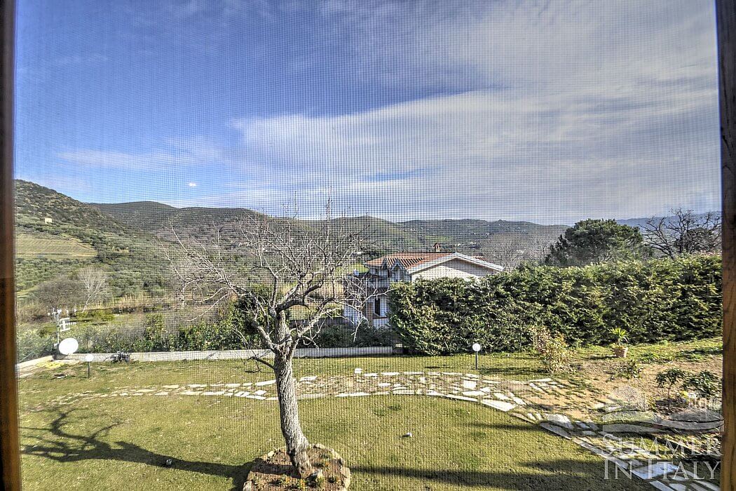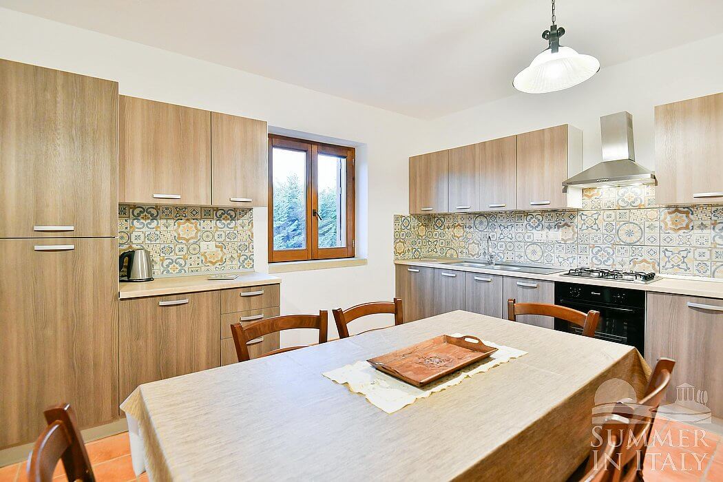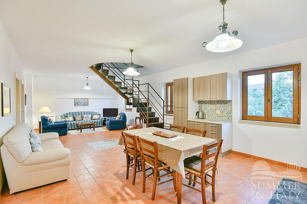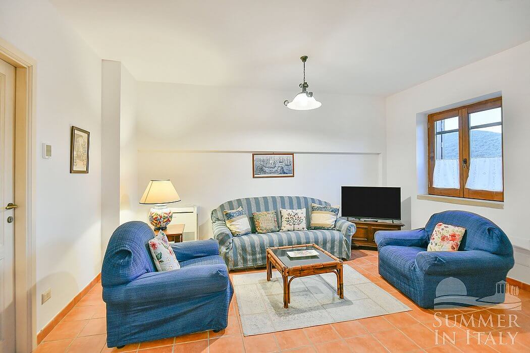 The living room is paved with terracotta tiles. The furnishings are simple and comfortable, and include two sofas and two armchairs. In the living room you will also find a cooking area. The kitchenette is equipped with a four-burner gas cooker, an electric oven, a refrigerator with freezer, a dishwasher, an Italian-style coffee-maker and other small appliances. There is also a washing machine (hidden in a cabinet), an iron and an ironing board. The dining table can accommodate eight guests. In this room you will find a flat-screen satellite television (local channels). The room has three windows with a view of the greenery. It is equipped with an air conditioning/heating unit.