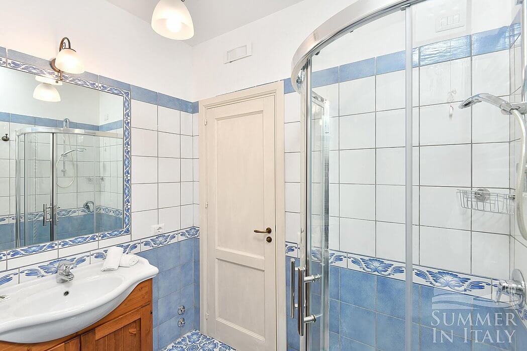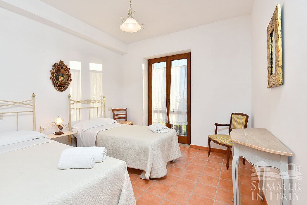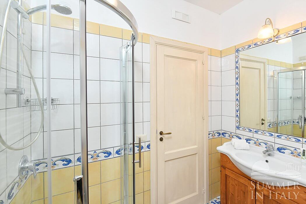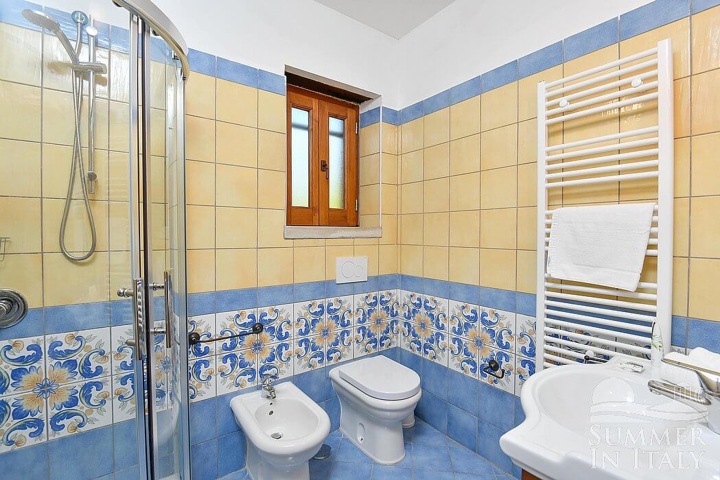 You will be able to enter the third bedroom from the living room. It has two twin beds (80 cm/32 inches). From the bedroom you will be able to enter the small balcony through a French door. The bedroom is equipped with an air conditioning/heating unit. This bedroom has an en-suite bathroom, decorated with majolica tiles and equipped with a washbasin, a toilet, a fully enclosed shower and a hairdryer.