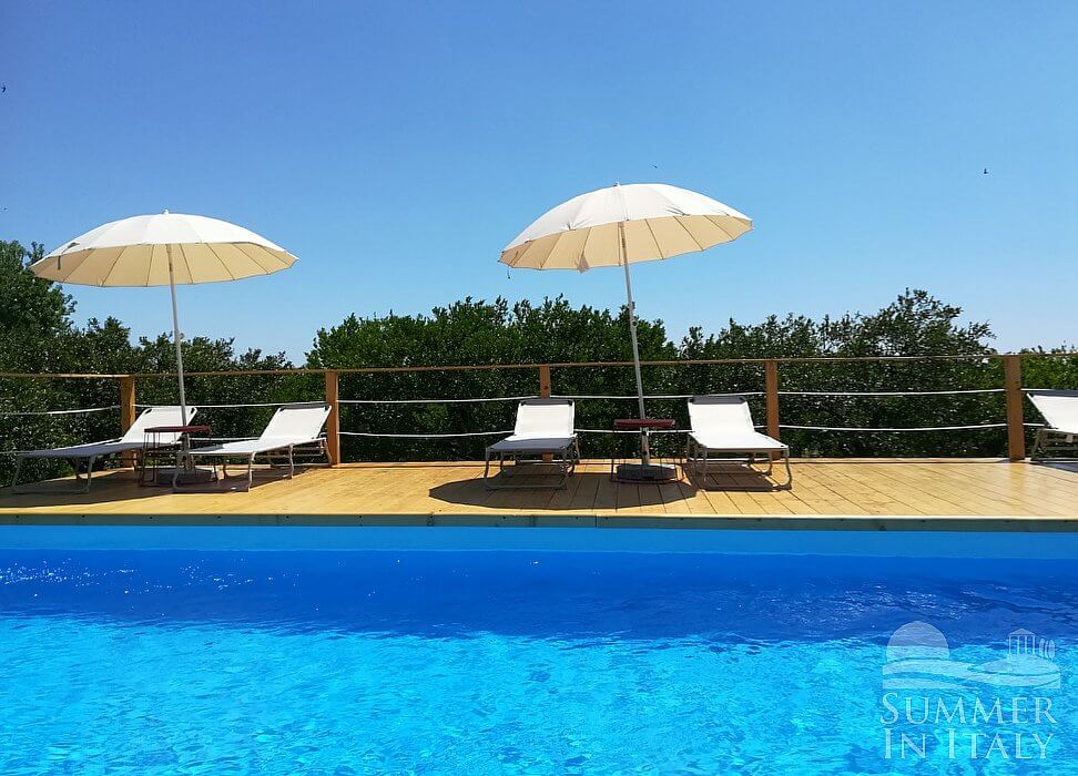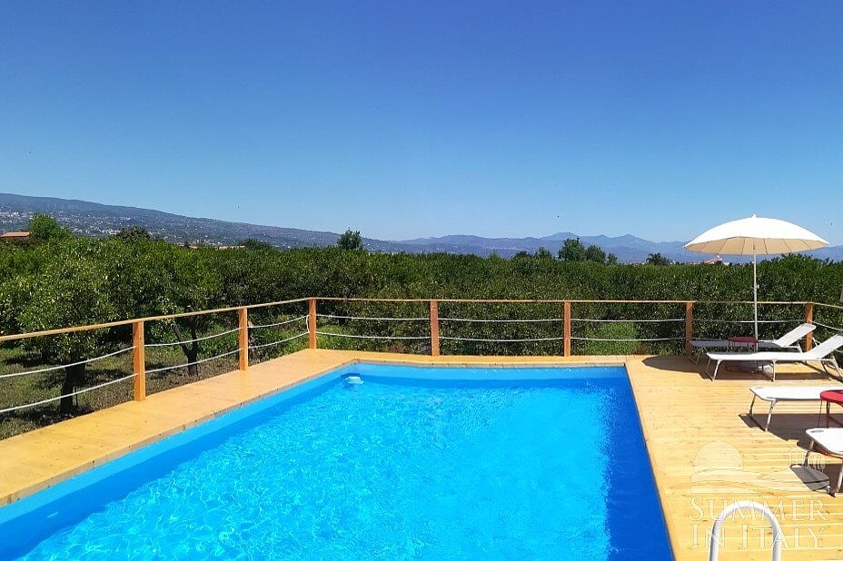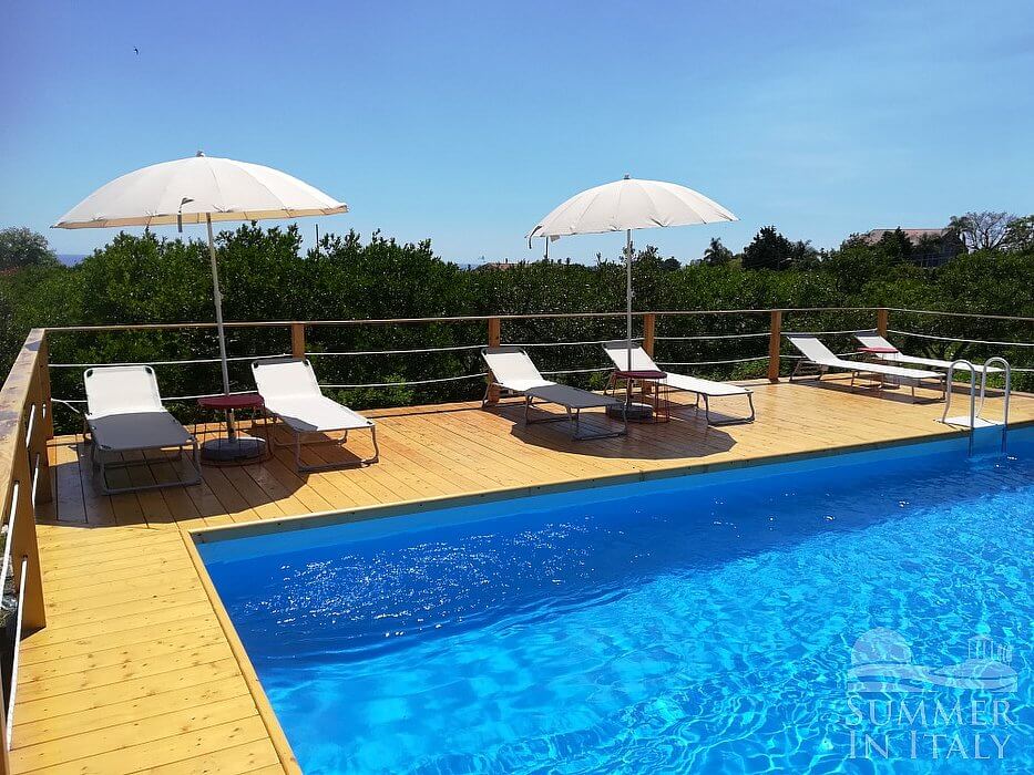 You will reach the swimming pool from the villa going up a short route that cuts through the garden and includes approximately three stairway steps. The above-ground pool is 4 meters (13 feet) large by 8 meters (26 feet) long, 1.2 meters (4 feet) deep. The area is equipped with sun umbrellas and sun loungers. From the swimming pool you will enjoy a charming view of the Mount Etna and of the greenery. You will share the pool with the owners. The swimming pool is open from mid-April until the end of October.
