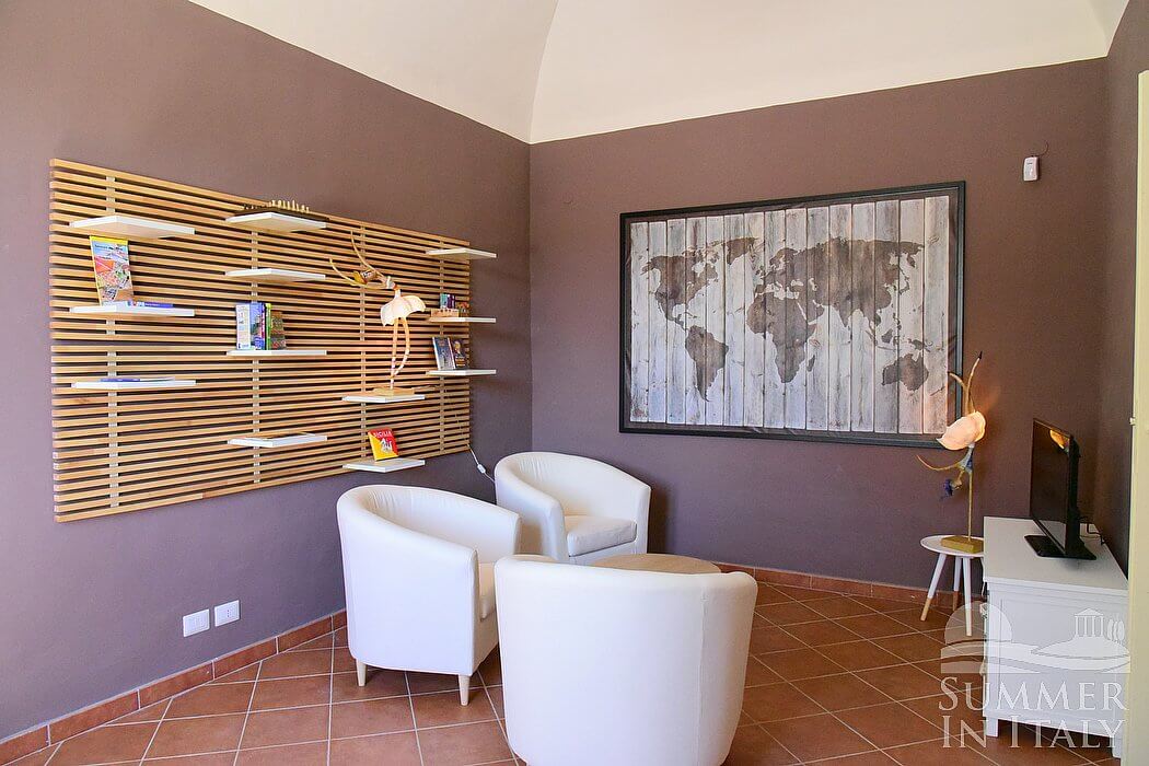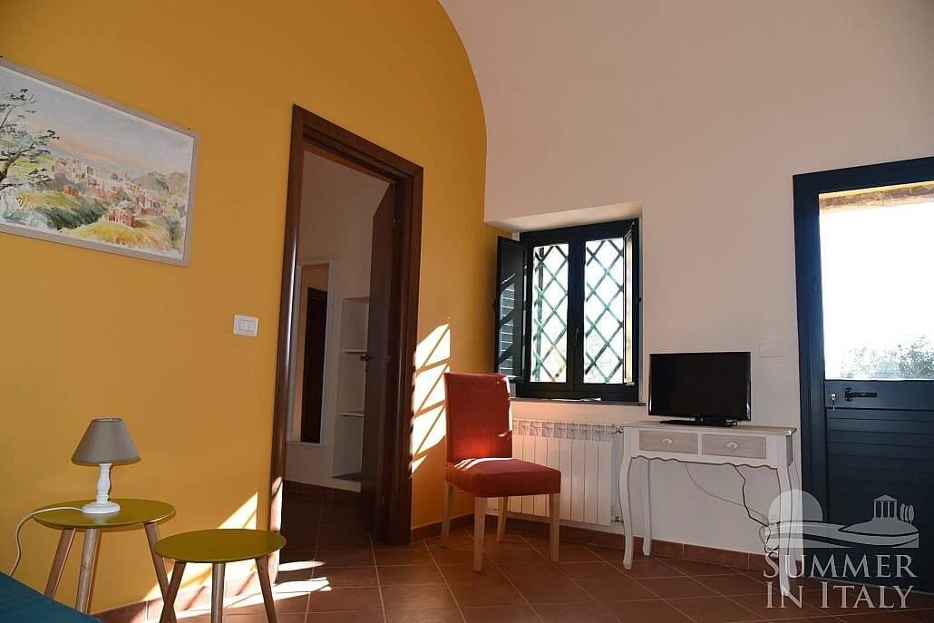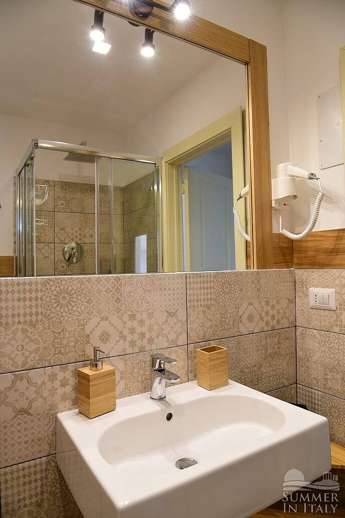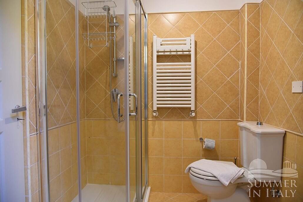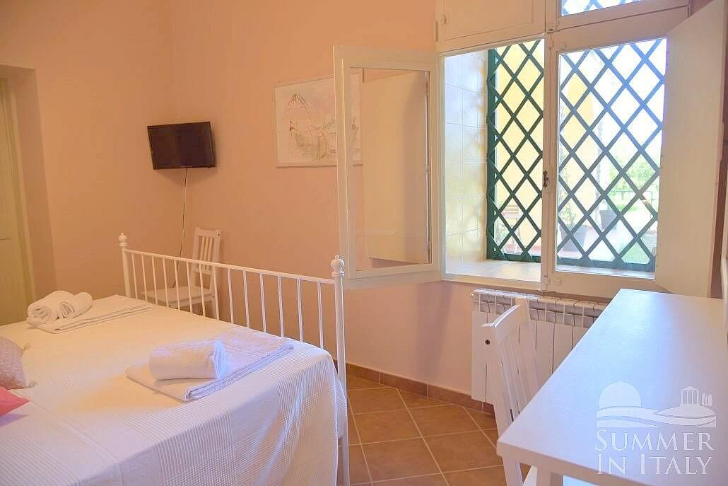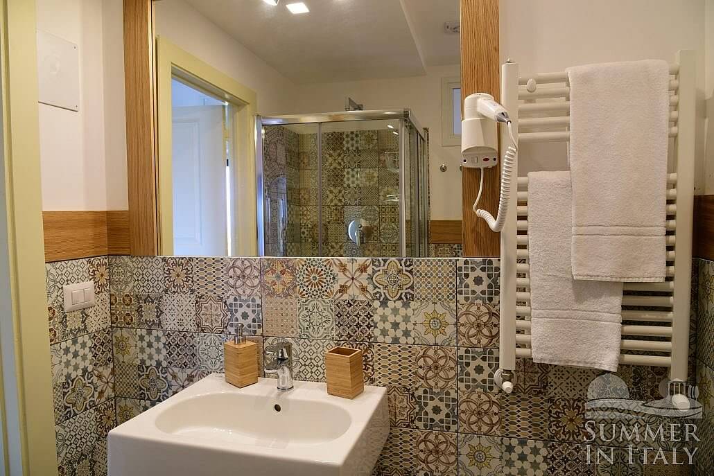 You will be able to enter the seventh bedroom through a corridor. The bedroom has a matrimonial bed (160 cm/63 inches, wider than a queen-size bed) and a single bed (80 cm/32 inches). In this room you will find a television (local channels). From the bedroom you will be able to enter a small balcony through a French door. The bedroom is equipped with an air conditioning/heating unit. This bedroom has an en-suite bathroom, decorated with majolica tiles and equipped with a washbasin, a toilet, a fully enclosed shower and a hairdryer.
