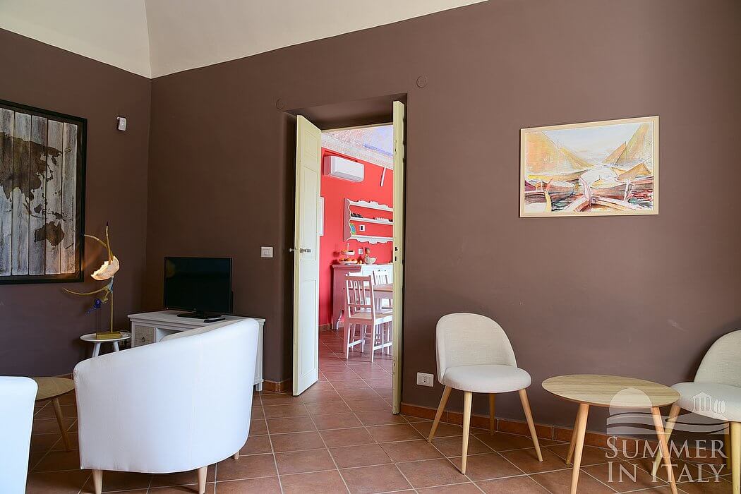 The first living room is paved with terracotta tiles. The ceiling is vaulted. The furnishings are simple and comfortable. The furnishings include three armchairs. In this room you will find a television (local channels). From the living room you will be able to enter the alleyway in front of the house through a French door.