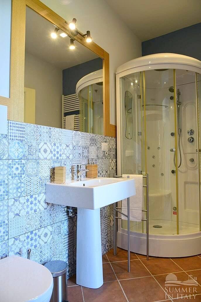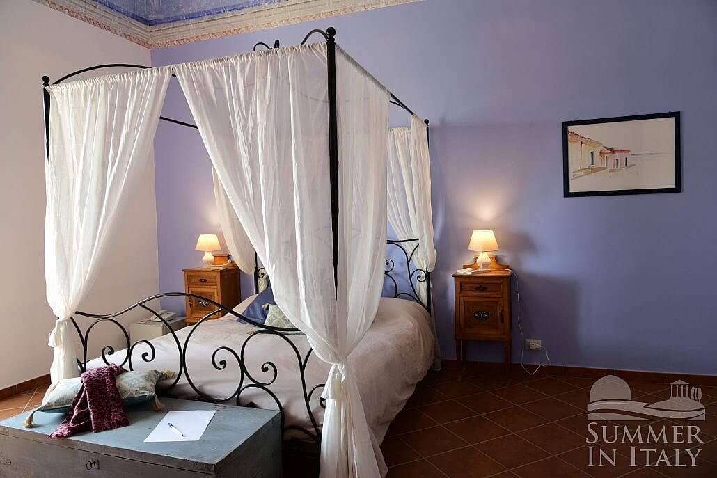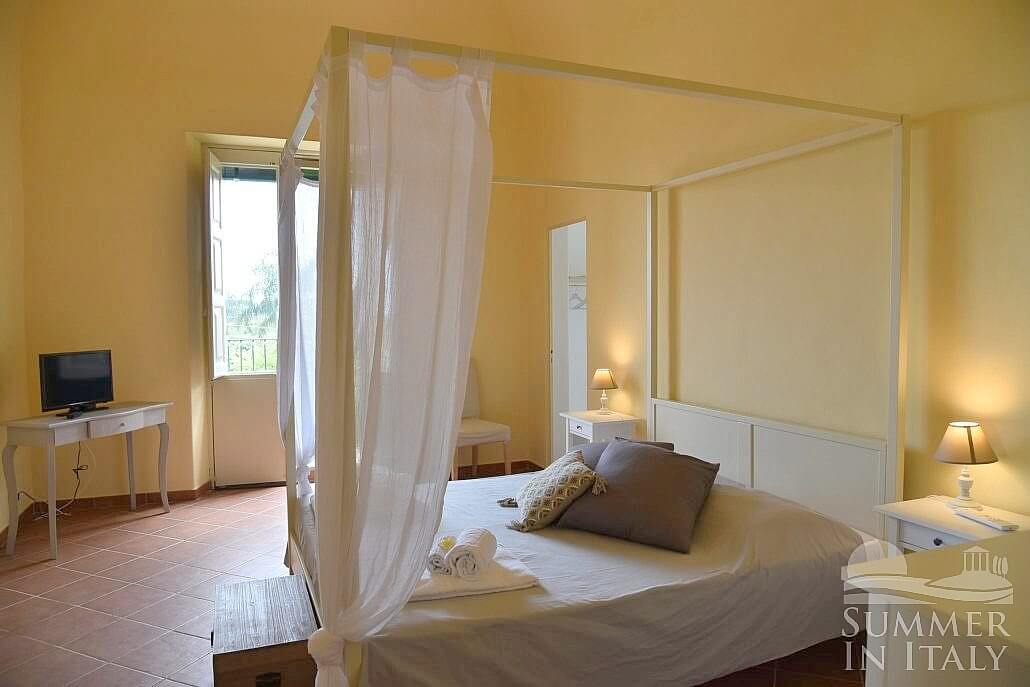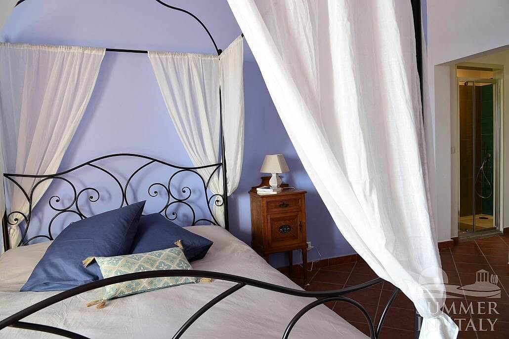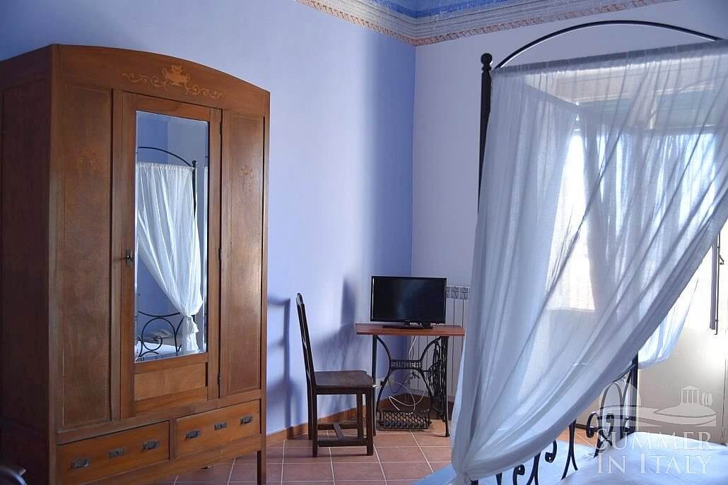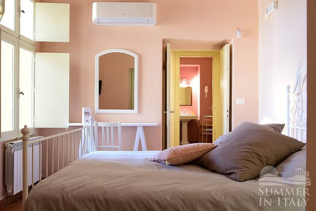 You will be able to enter the eighth bedroom through a corridor. The bedroom has a matrimonial bed (160 cm/63 inches, wider than a queen-size bed). In this room you will find a television (local channels). From the bedroom you will be able to enter a small balcony through a French door. The bedroom is equipped with an air conditioning/heating unit. This bedroom has an en-suite bathroom, decorated with majolica tiles and equipped with a washbasin, a toilet, a fully enclosed shower and a hairdryer.