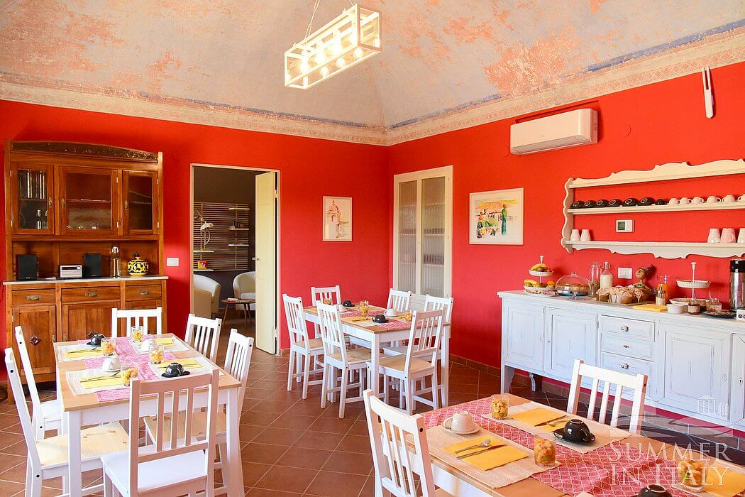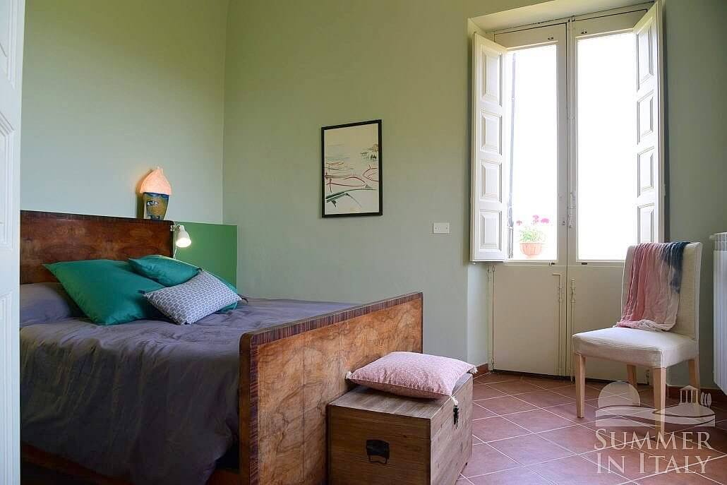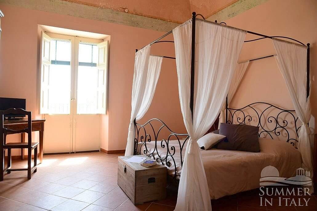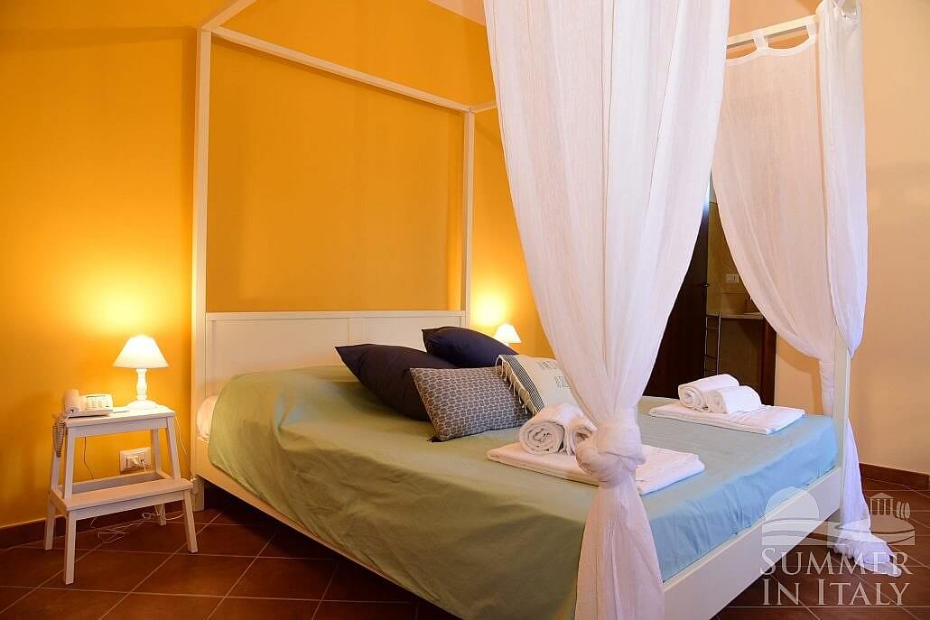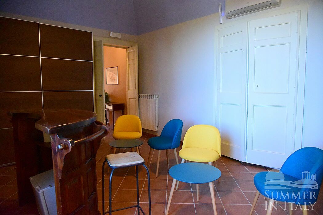 You will be able to enter the eighth bedroom through a corridor. The bedroom has a matrimonial bed (160 cm/63 inches, wider than a queen-size bed). In this room you will find a television (local channels). From the bedroom you will be able to enter a small balcony through a French door. The bedroom is equipped with an air conditioning/heating unit. This bedroom has an en-suite bathroom, decorated with majolica tiles and equipped with a washbasin, a toilet, a fully enclosed shower and a hairdryer.