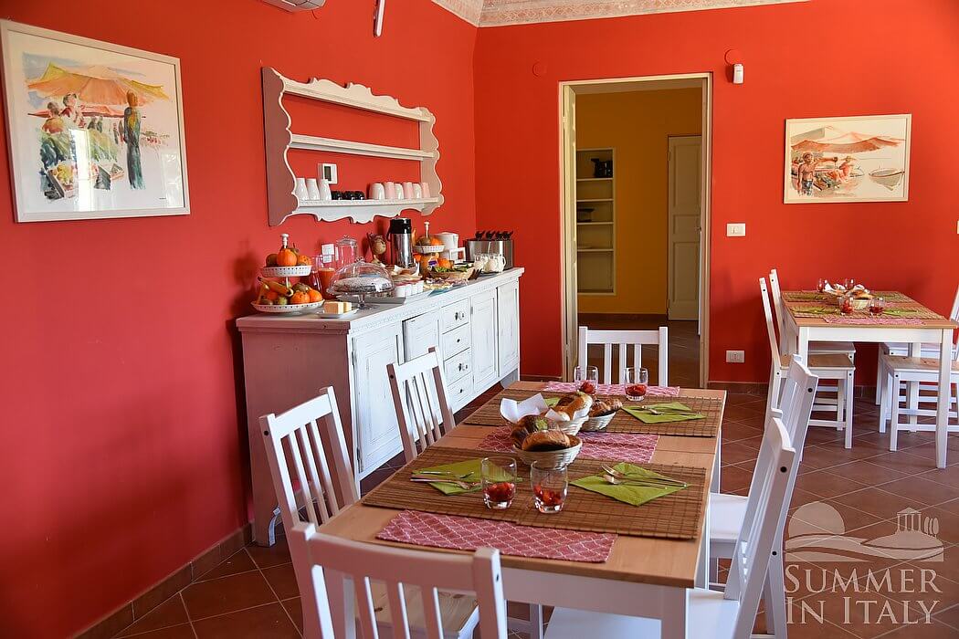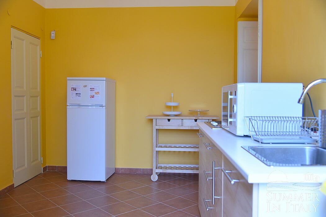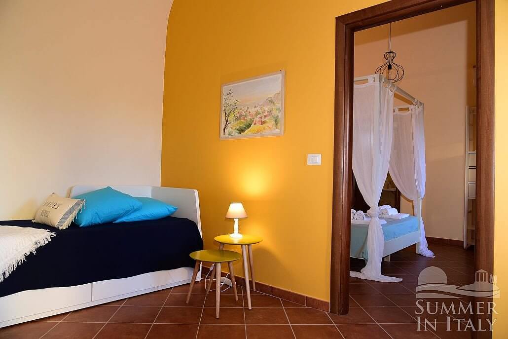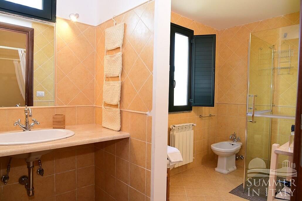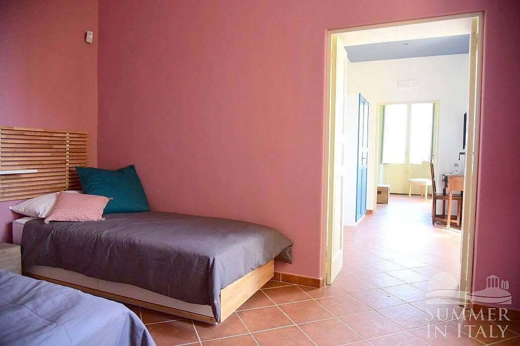 You will be able to enter the sixth bedroom through a corridor. The bedroom has a matrimonial bed (160 cm/63 inches, wider than a queen-size bed) and a single bed (80 cm/32 inches). In this room you will find a television (local channels). From the bedroom you will be able to enter a small balcony through a French door. The bedroom is equipped with an air conditioning/heating unit. This bedroom has an en-suite bathroom, tiled with lucid sea green majolica tiles and equipped with a washbasin, a toilet, a fully enclosed shower and a hairdryer.