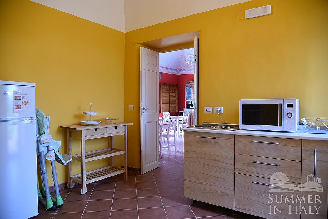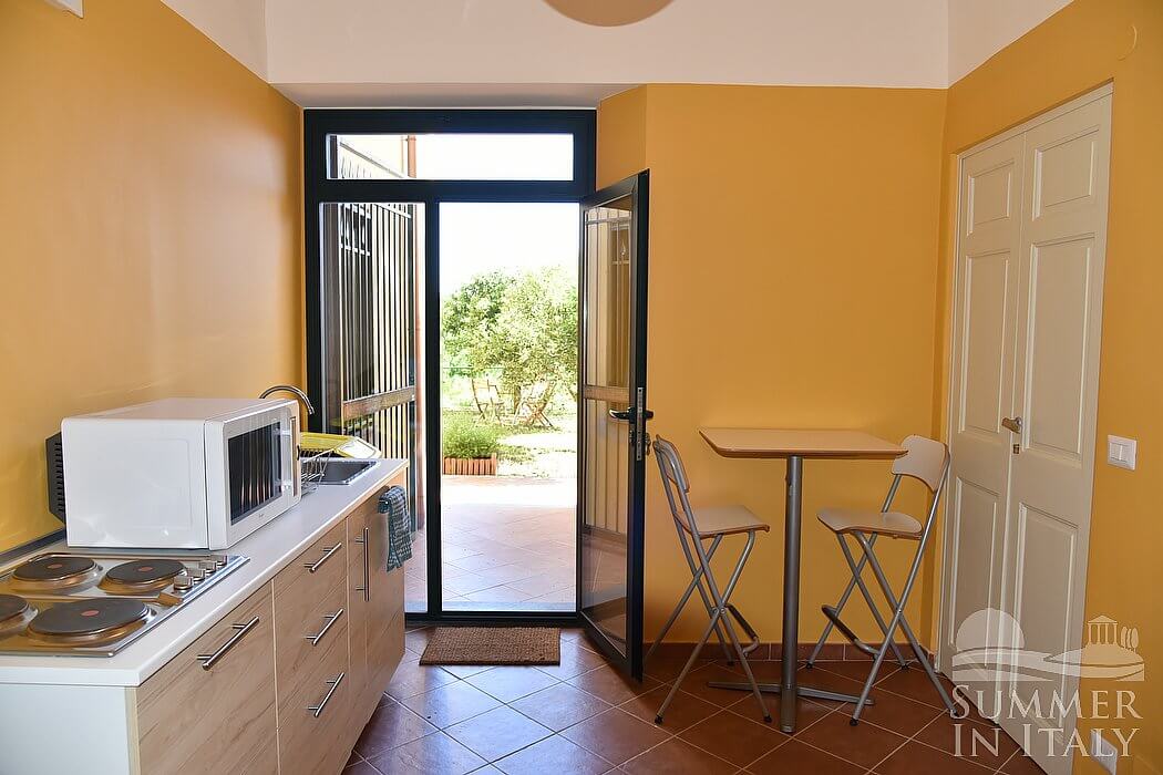 You will be able to enter the kitchen from the dining room. It is equipped with a four-burner electric cooker, a refrigerator with freezer, a microwave oven, an Italian-style coffee-maker and an American-style coffee-maker (bring your filters!). Here you will also find an iron and an ironing board. The dining table can accommodate two guests. From the kitchen a French door will take you to the garden.