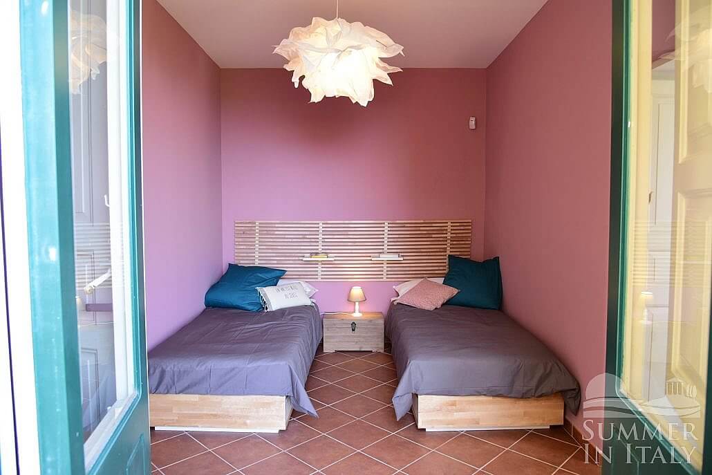 Important notice: members of your party will need to walk through this bedroom to reach the fifth bedroom. You will be able to enter the fourth bedroom through an access area. It has two twin beds (80 cm/32 inches), that can be pushed together into a matrimonial bed if requested (please contact our staff in advance to make arrangements). From the bedroom you will be able to enter a long terrace with a view of the Mount Etna and of the sea at a distance through a French door. The bedroom is equipped with an air conditioning/heating unit.