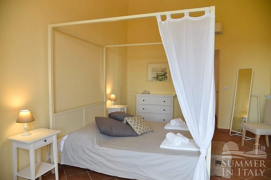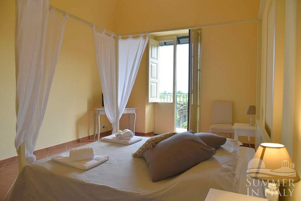 You will be able to enter the fifth bedroom from the fourth bedroom through an access area. The bedroom has a matrimonial bed (160 cm/63 inches, wider than a queen-size bed). From the bedroom you will be able to enter a long terrace with a view of the Mount Etna and of the sea at a distance through two French doors. The bedroom is equipped with an air conditioning/heating unit.