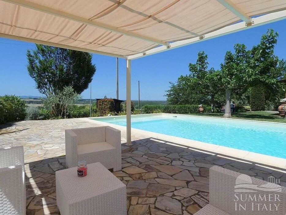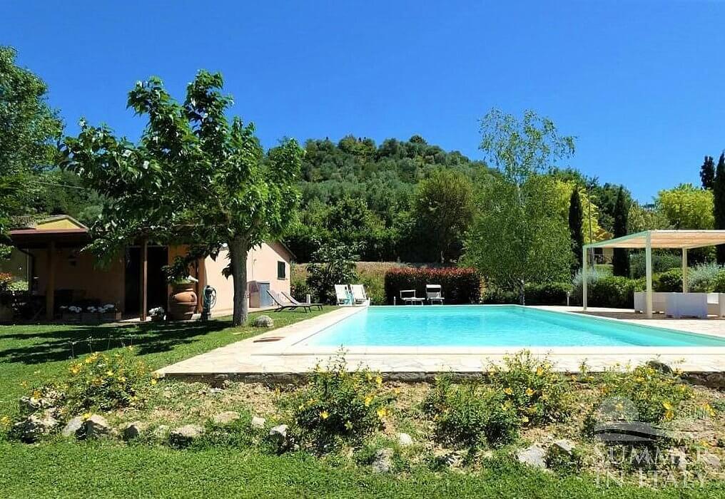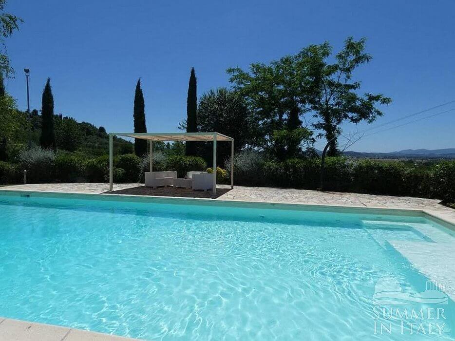 The swimming pool is 6 meters (20 feet) large by 14 meters (46 feet) long. The area is equipped with deck chairs, sun loungers and a gazebo. This area is also equipped with a small sofa and two armchairs. From the swimming pool you will enjoy an enchanting view of the greenery and of the hills. The pool is open from the beginning of May until the end of September.