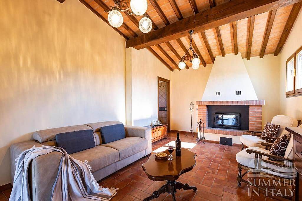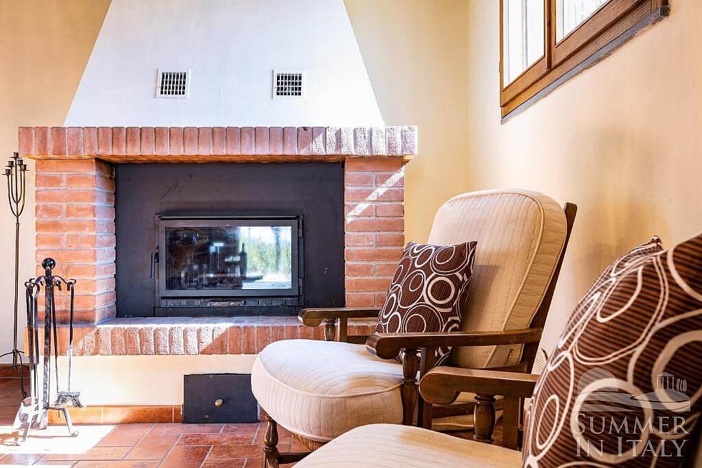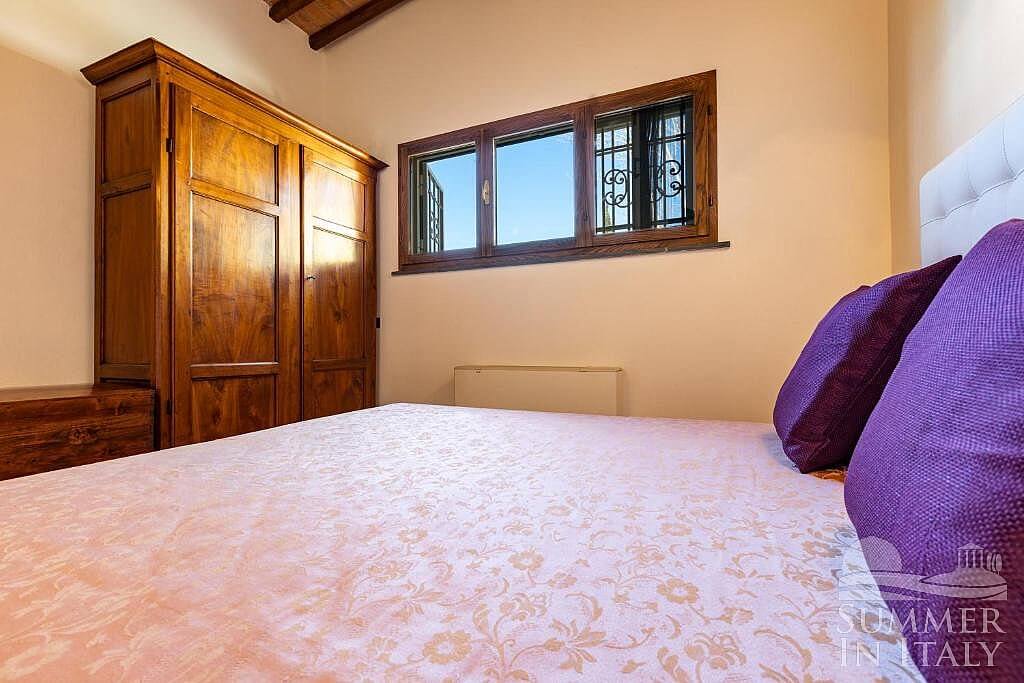 You will be able to enter the living room from the kitchen through a brickwork arched opening. The floor is paved with terracotta tiles. The ceiling has characteristic exposed wood beams. The furnishings are warm and welcoming. The furnishings include two armchairs and a divan that unfolds into a double bed. There is a nice fireplace made of bricks. In this room you will find a satellite television (local channels). The room has a window. It is equipped with an air conditioning/heating unit.