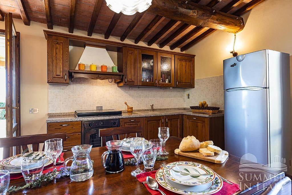 The kitchen is equipped with a four-burner gas cooker, an electric oven, a refrigerator with freezer, a dishwasher, a microwave oven, an Italian-style coffee-maker and a kettle. The dining table can accommodate four guests. The furnishings of the kitchen include an armchair. From the kitchen two French doors will take you to the patio and the garden. The kitchen is equipped with an air conditioning/heating unit.