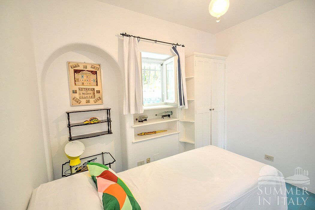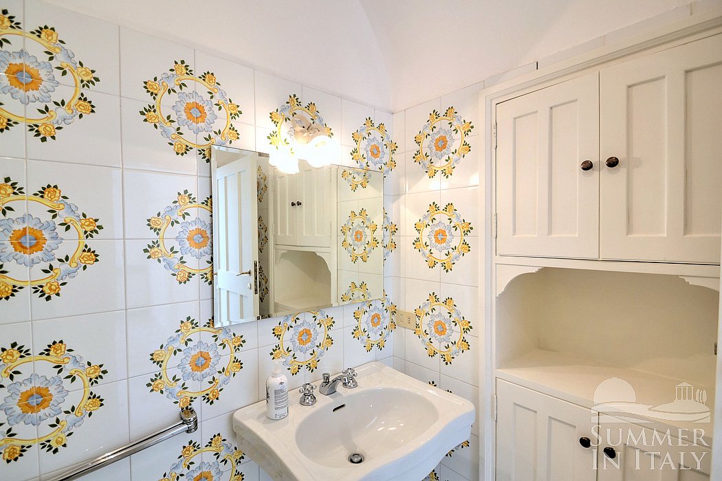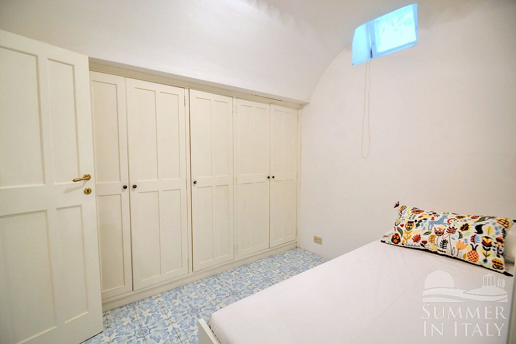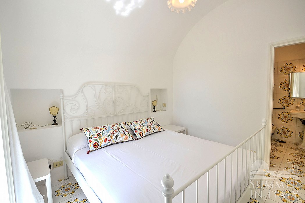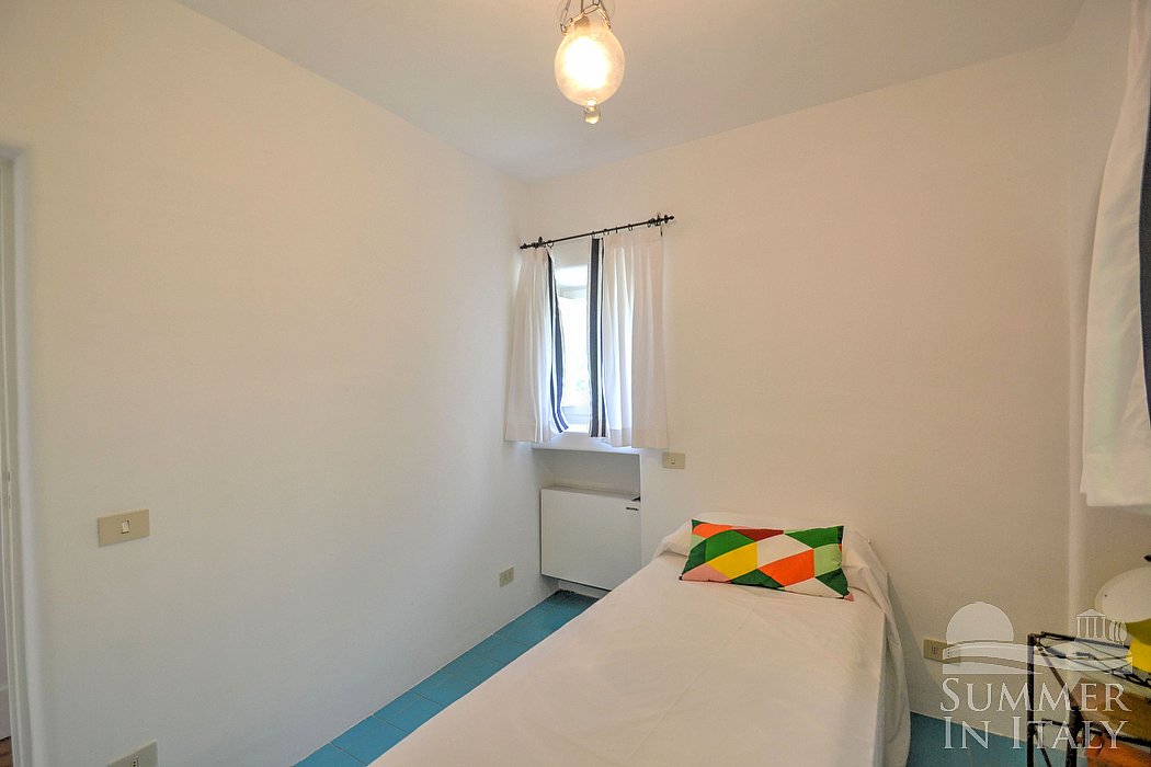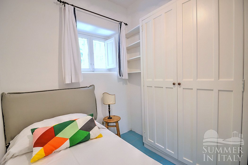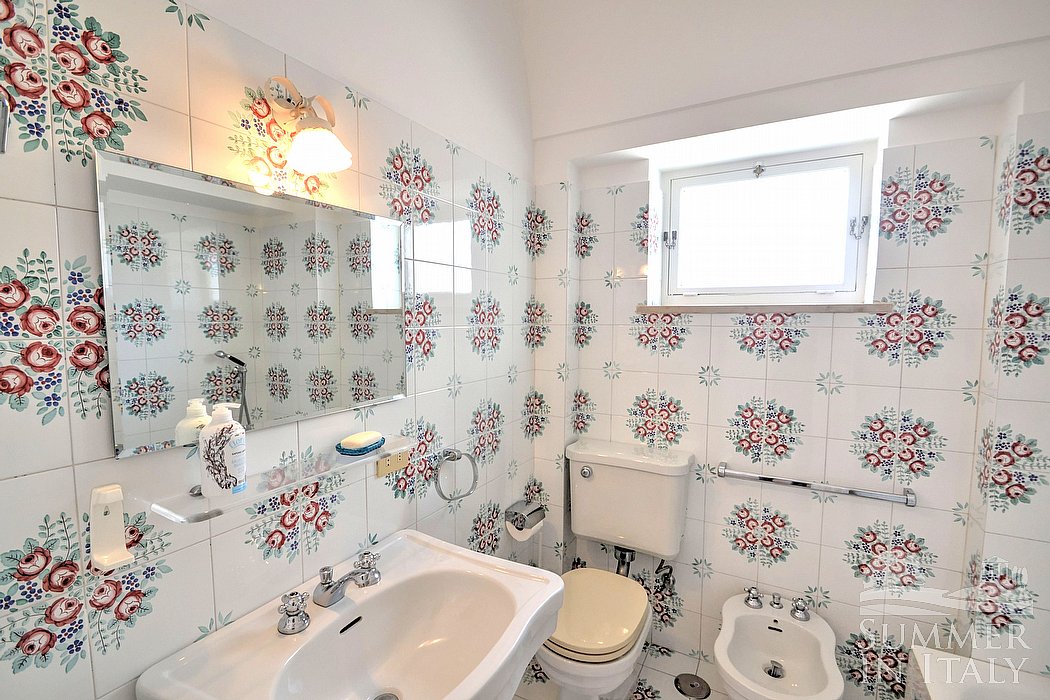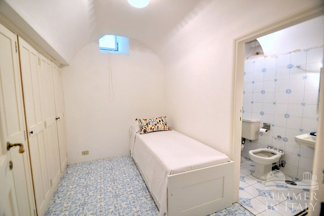 You will be able to enter the fourth bedroom through a corridor. The bedroom has a matrimonial bed (160 cm/62 inches, wider than a queen-size bed), that can be split into twins if requested (please contact our staff in advance to make arrangements). The room has a window with a view of the sea. The bedroom is equipped with an air conditioning/heating unit. This bedroom has an en-suite bathroom, decorated with majolica tiles and equipped with a washbasin, a toilet and a bathtub with shower wand.