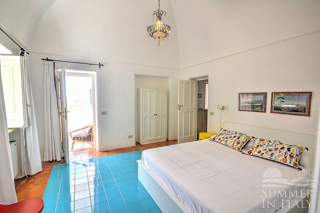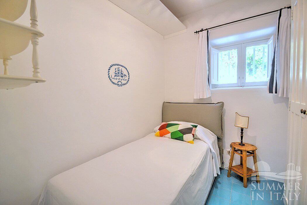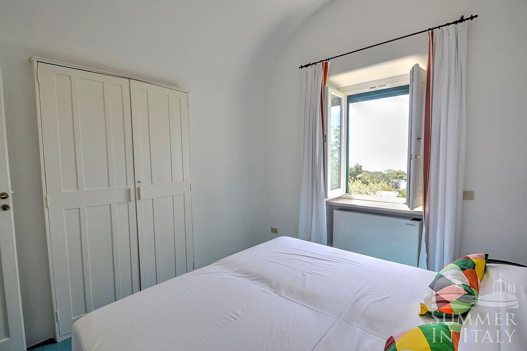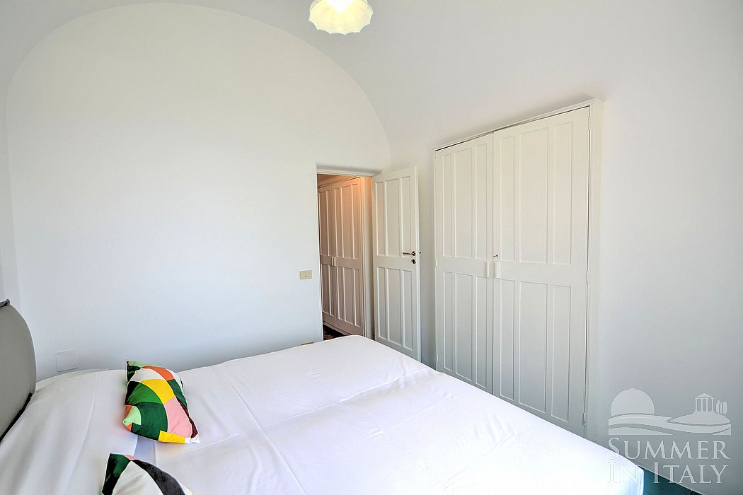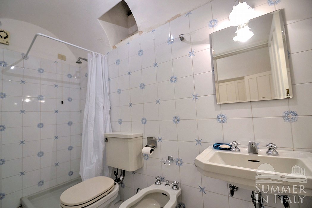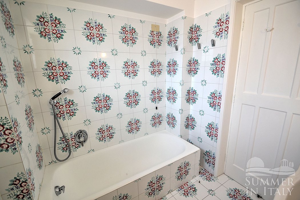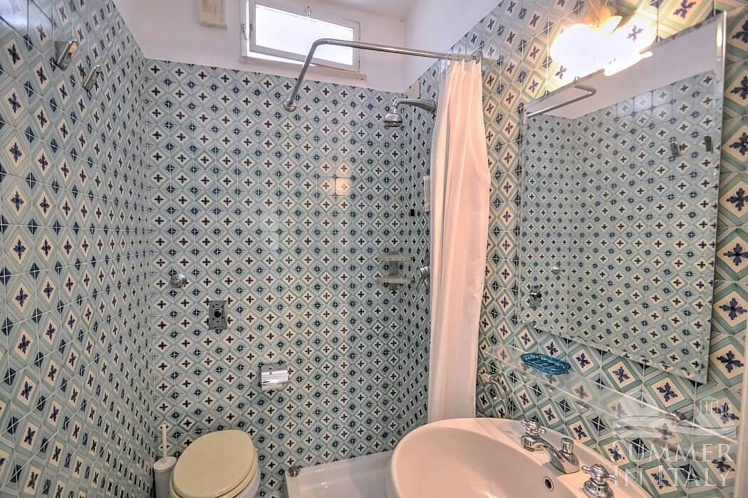 You will be able to enter the fourth bedroom through a corridor. The bedroom has a matrimonial bed (160 cm/62 inches, wider than a queen-size bed), that can be split into twins if requested (please contact our staff in advance to make arrangements). The room has a window with a view of the sea. The bedroom is equipped with an air conditioning/heating unit. This bedroom has an en-suite bathroom, decorated with majolica tiles and equipped with a washbasin, a toilet and a bathtub with shower wand.