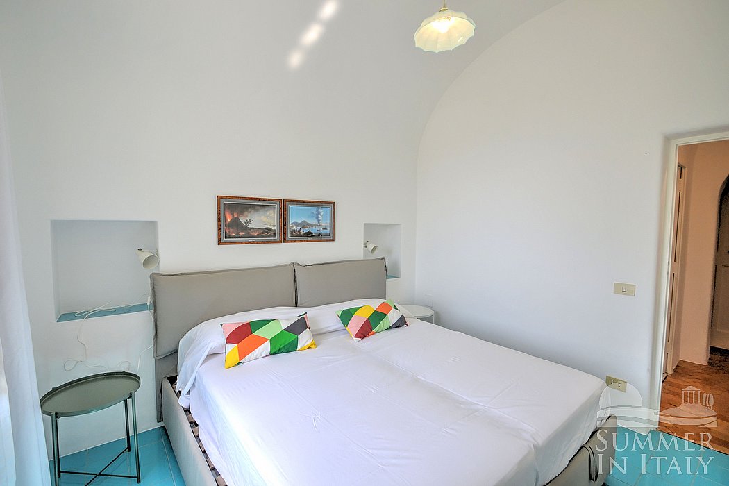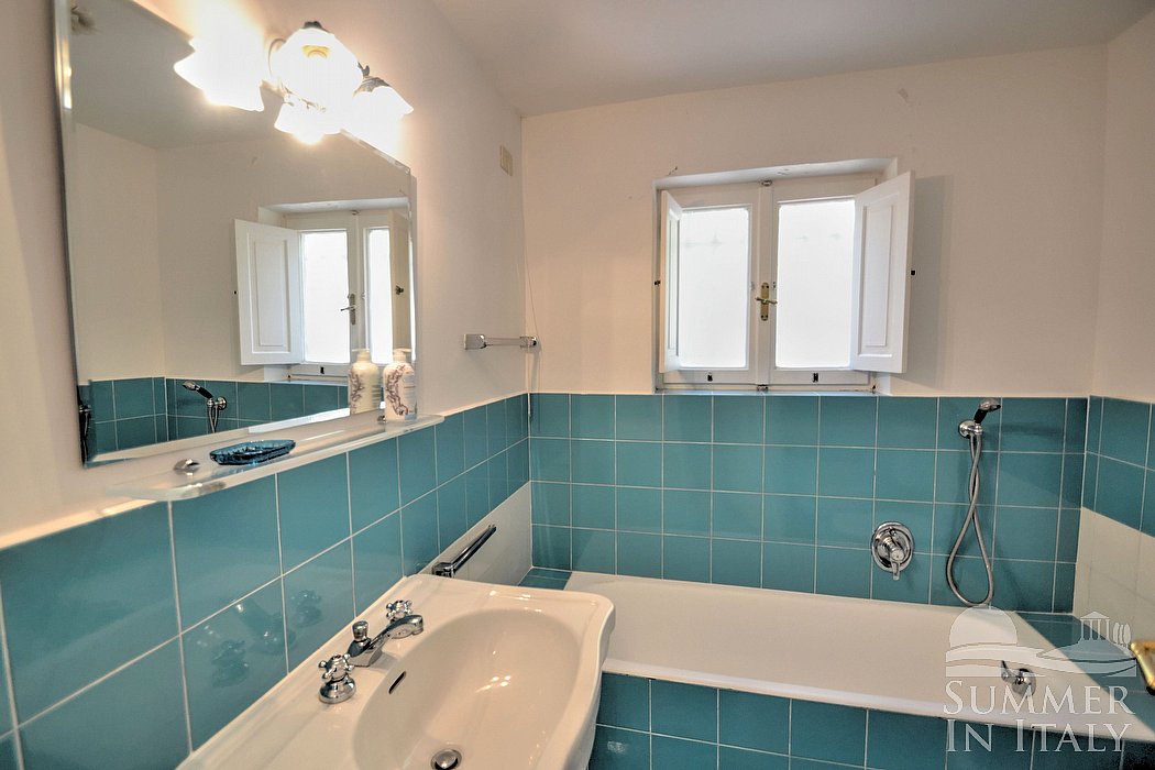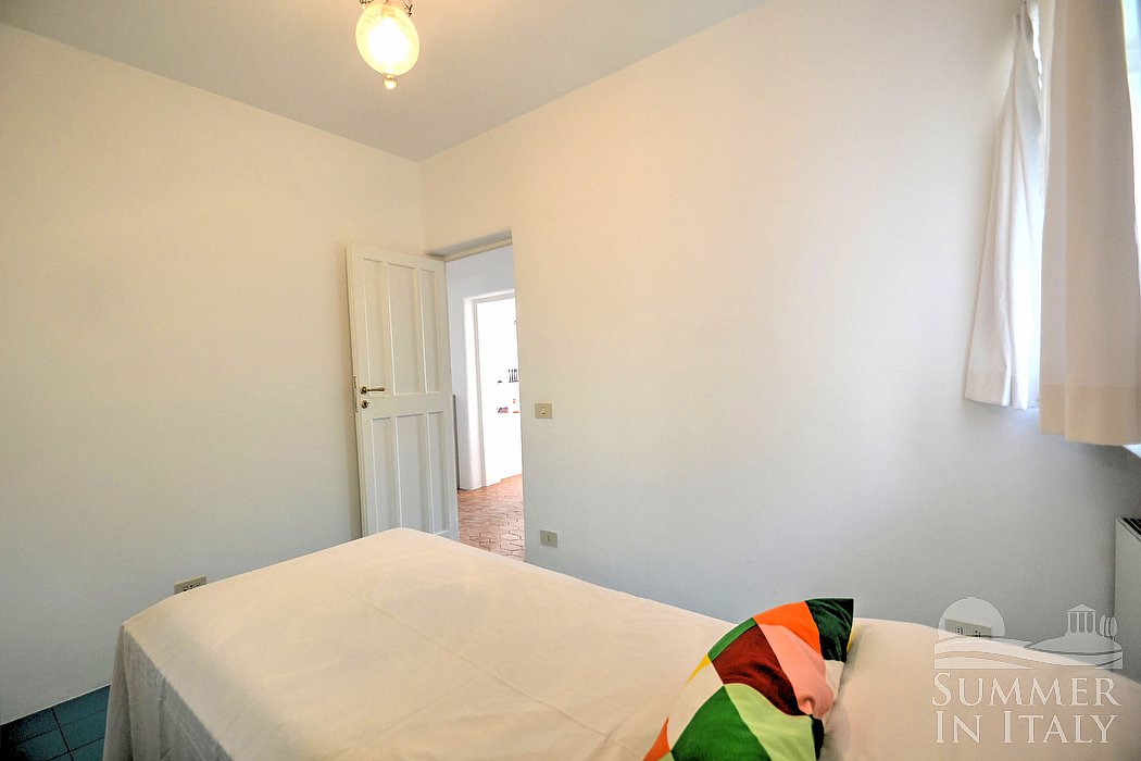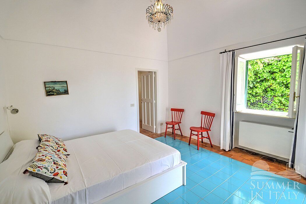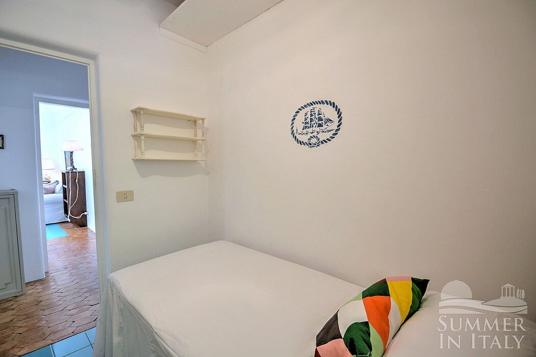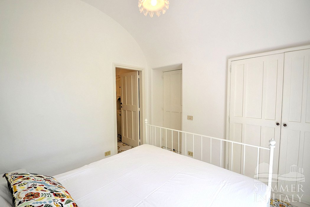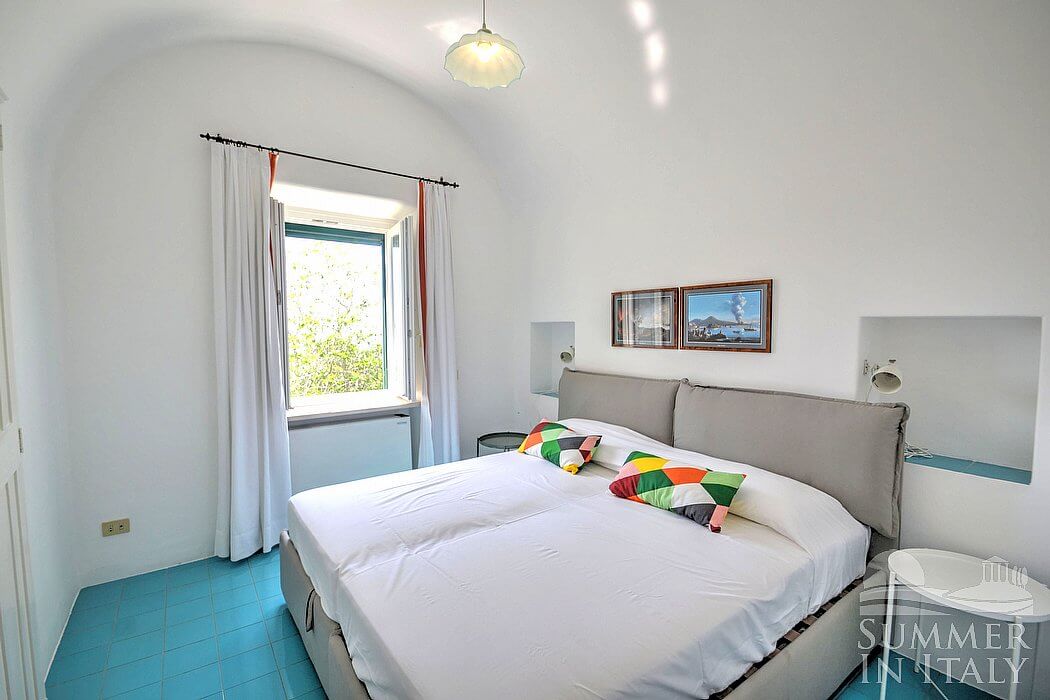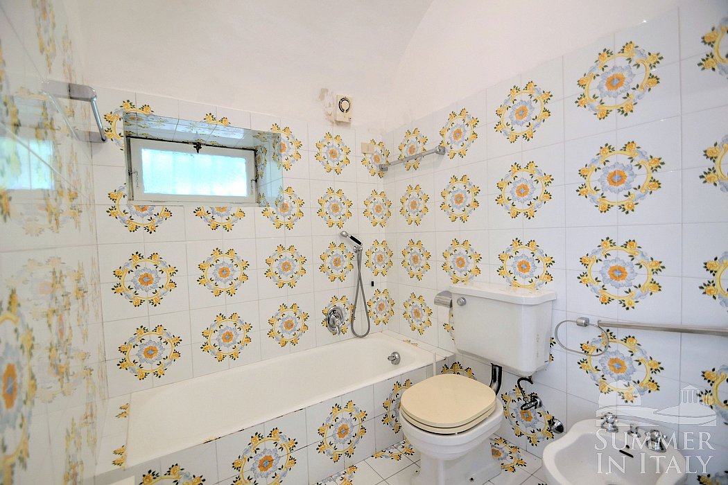 You will be able to enter the fourth bedroom through a corridor. The bedroom has a matrimonial bed (160 cm/62 inches, wider than a queen-size bed), that can be split into twins if requested (please contact our staff in advance to make arrangements). The room has a window with a view of the sea. The bedroom is equipped with an air conditioning/heating unit. This bedroom has an en-suite bathroom, decorated with majolica tiles and equipped with a washbasin, a toilet and a bathtub with shower wand.