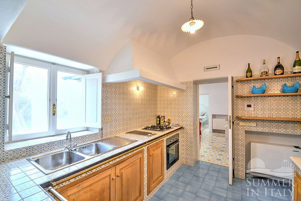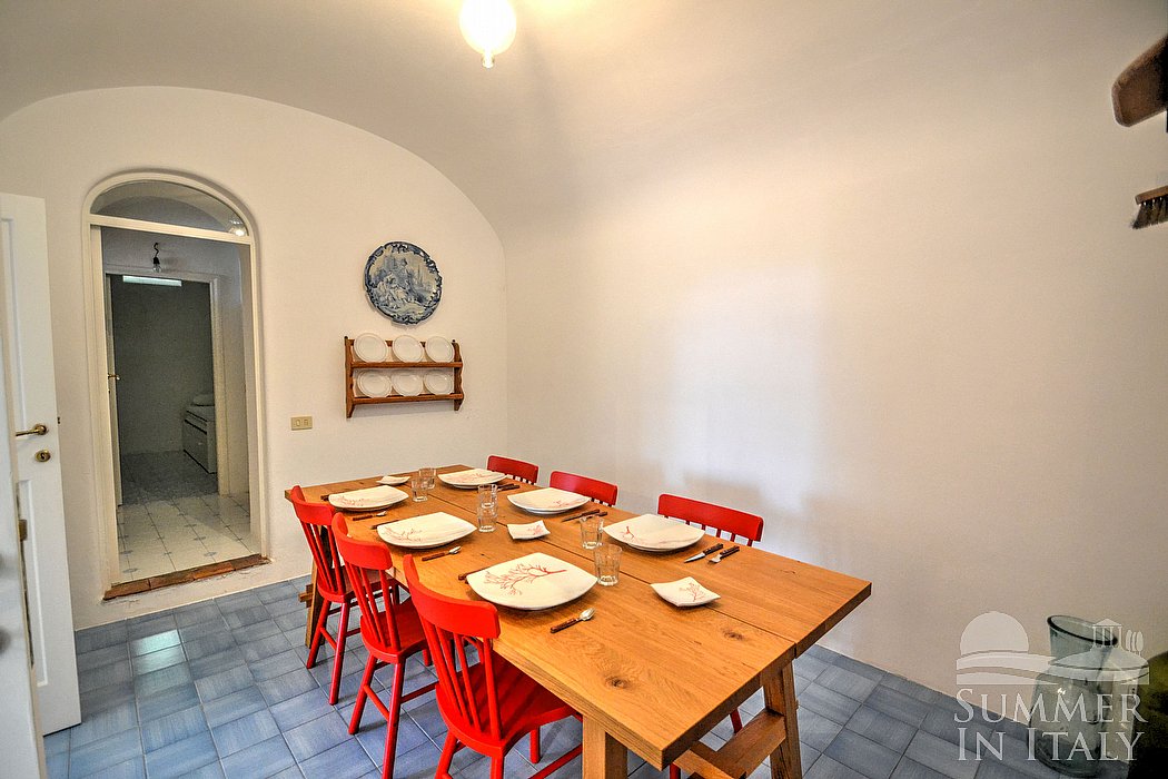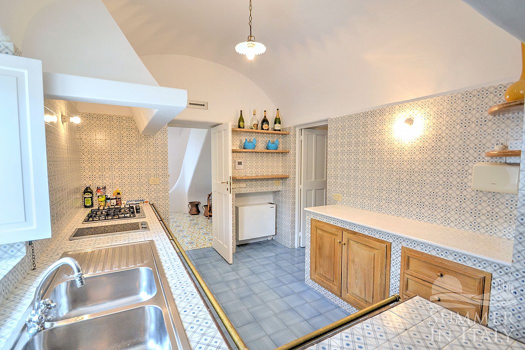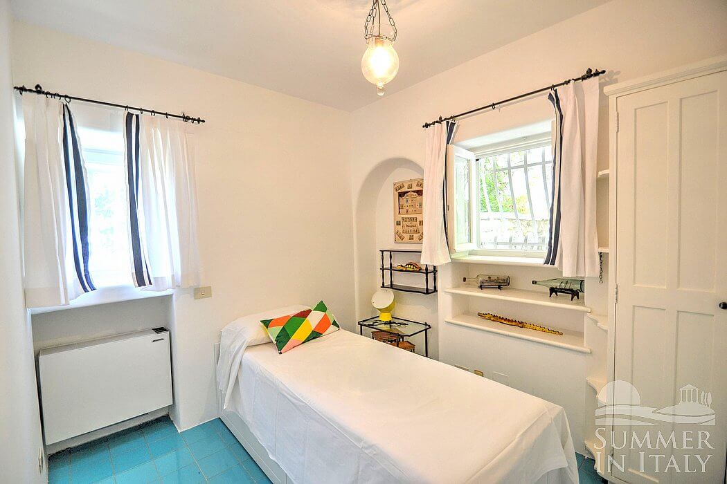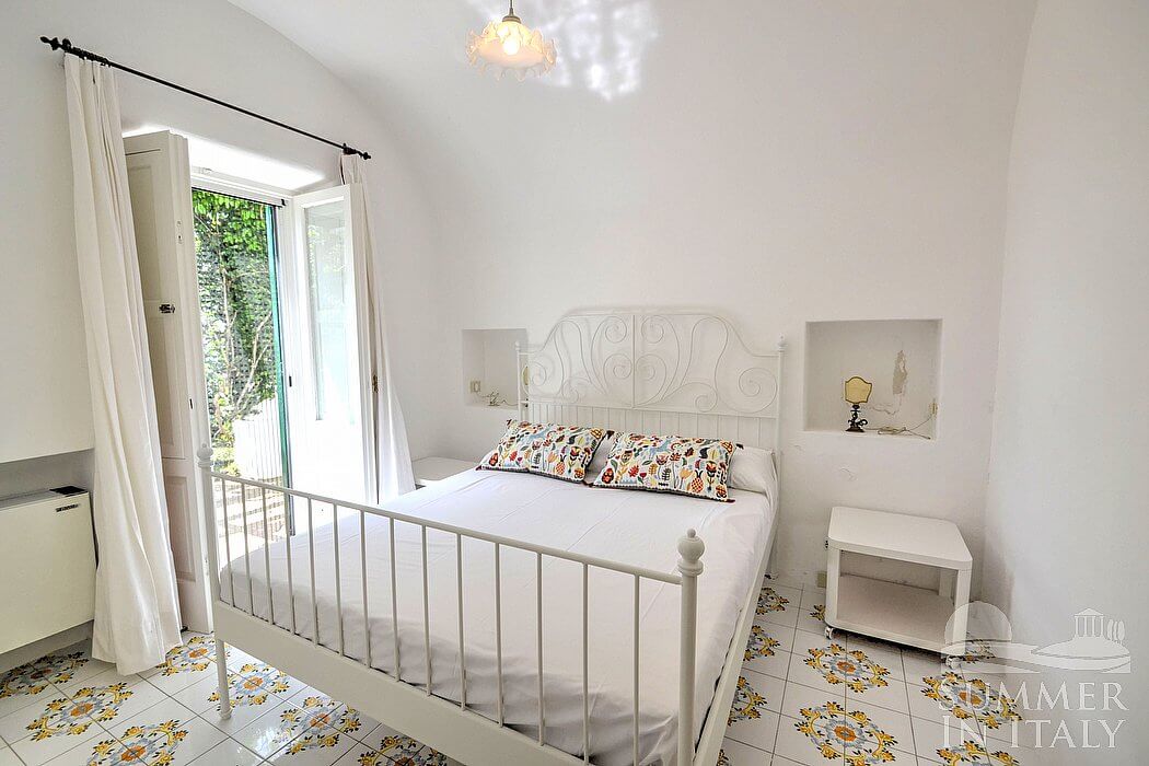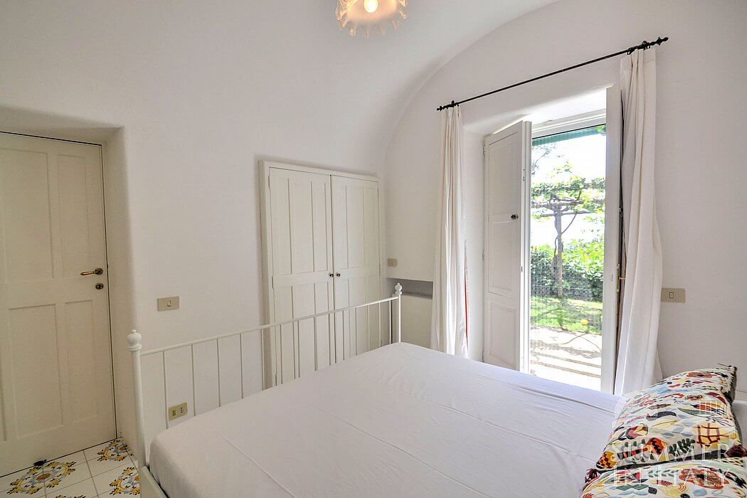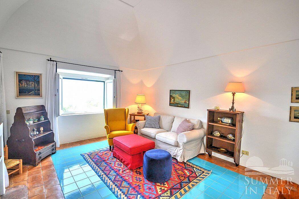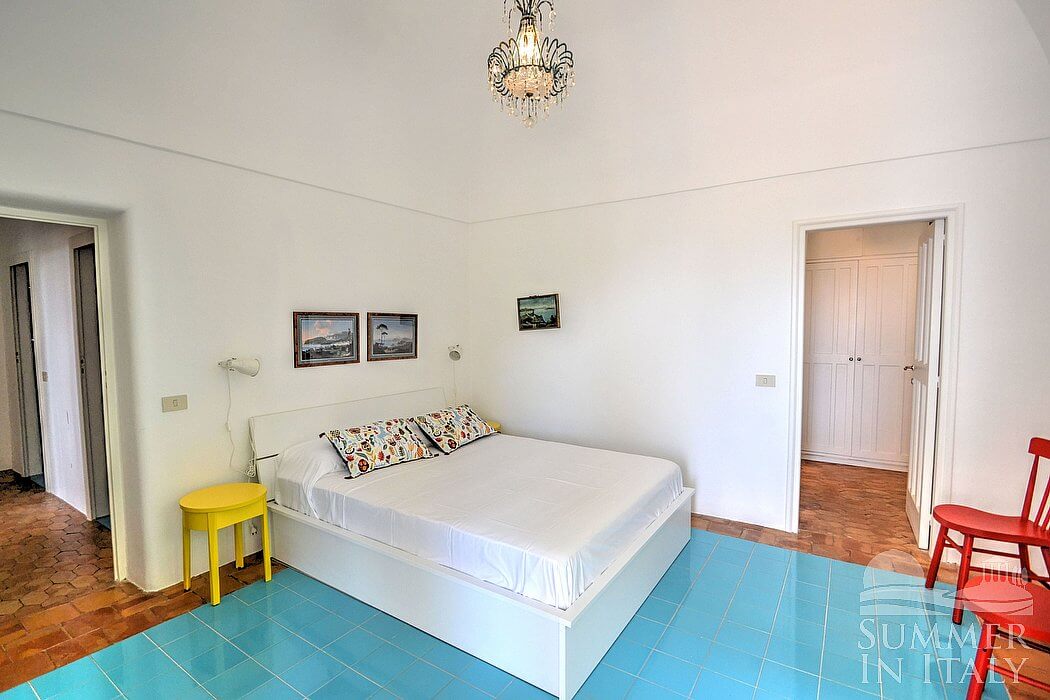 You will be able to enter the fourth bedroom through a corridor. The bedroom has a matrimonial bed (160 cm/62 inches, wider than a queen-size bed), that can be split into twins if requested (please contact our staff in advance to make arrangements). The room has a window with a view of the sea. The bedroom is equipped with an air conditioning/heating unit. This bedroom has an en-suite bathroom, decorated with majolica tiles and equipped with a washbasin, a toilet and a bathtub with shower wand.