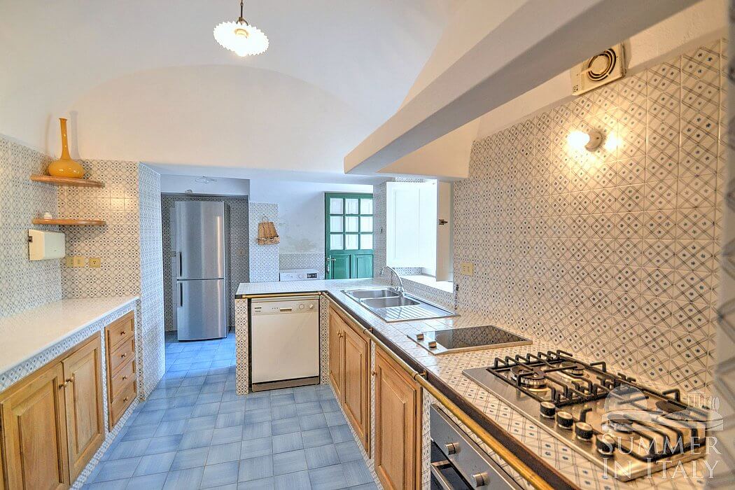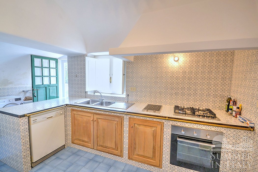You will be able to enter the kitchen from the living room. It is equipped with a cooker with four gas burners and a two-burner electric cooker, an electric oven, a refrigerator with freezer, a dishwasher and an Italian-style coffee-maker. Here you will also find a washing machine, an iron and an ironing board. From the kitchen a French door will take you to the patio. The room also has a window. The kitchen is equipped with an air conditioning/heating unit.