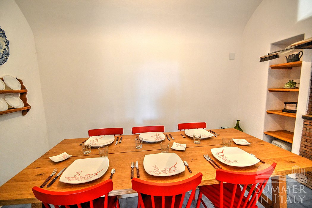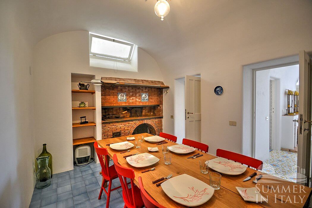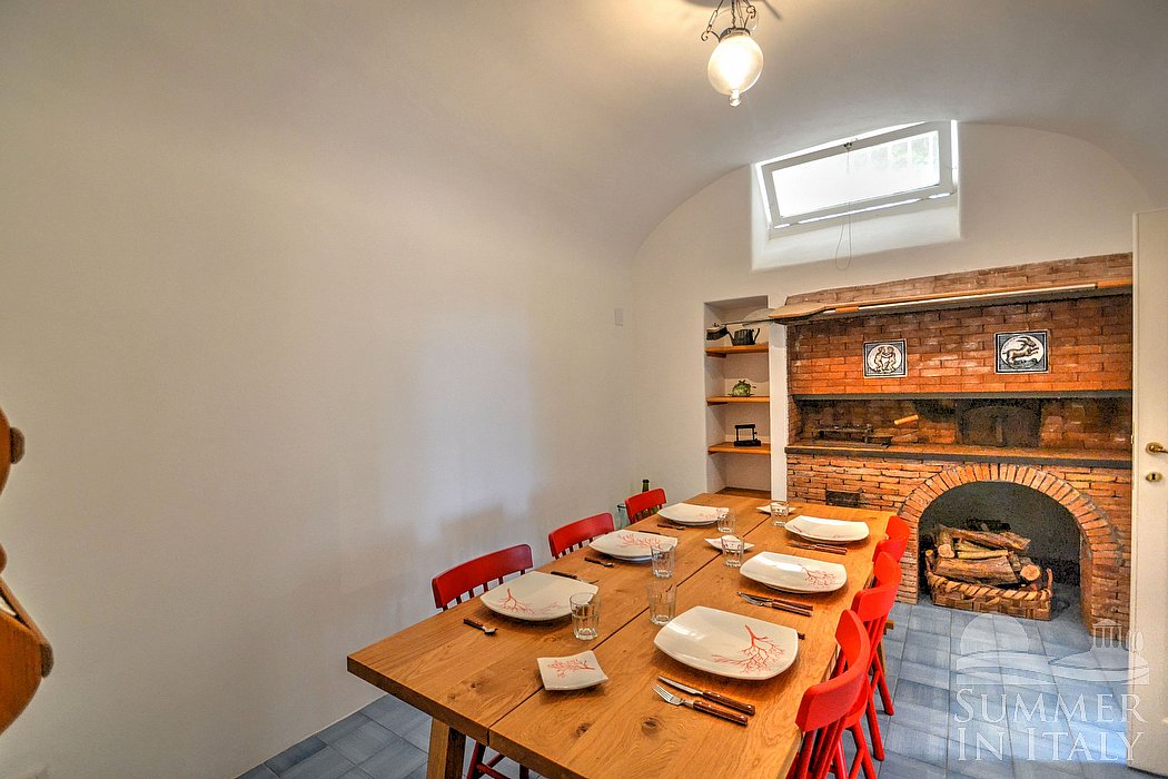 You will be able to enter the dining room from the living room and from the kitchen. The furnishings are cozy and comfortable. The dining table can accommodate eight guests. In the dining room you will find a small wood-fired pizza oven. The room has a small high window. The room is equipped with an air conditioning/heating.