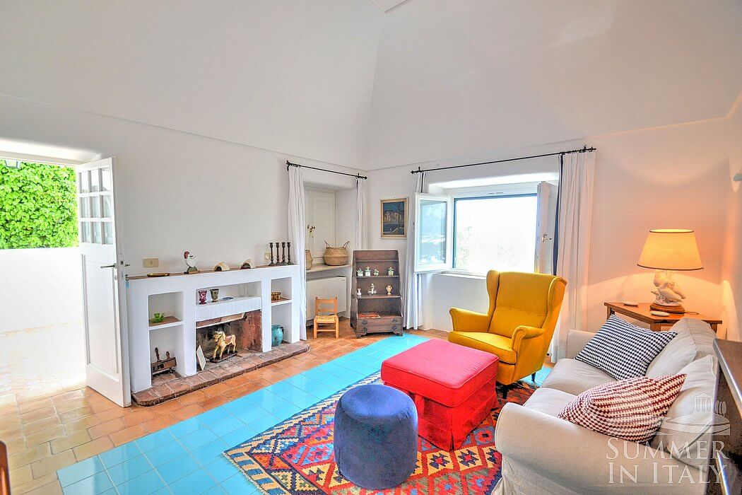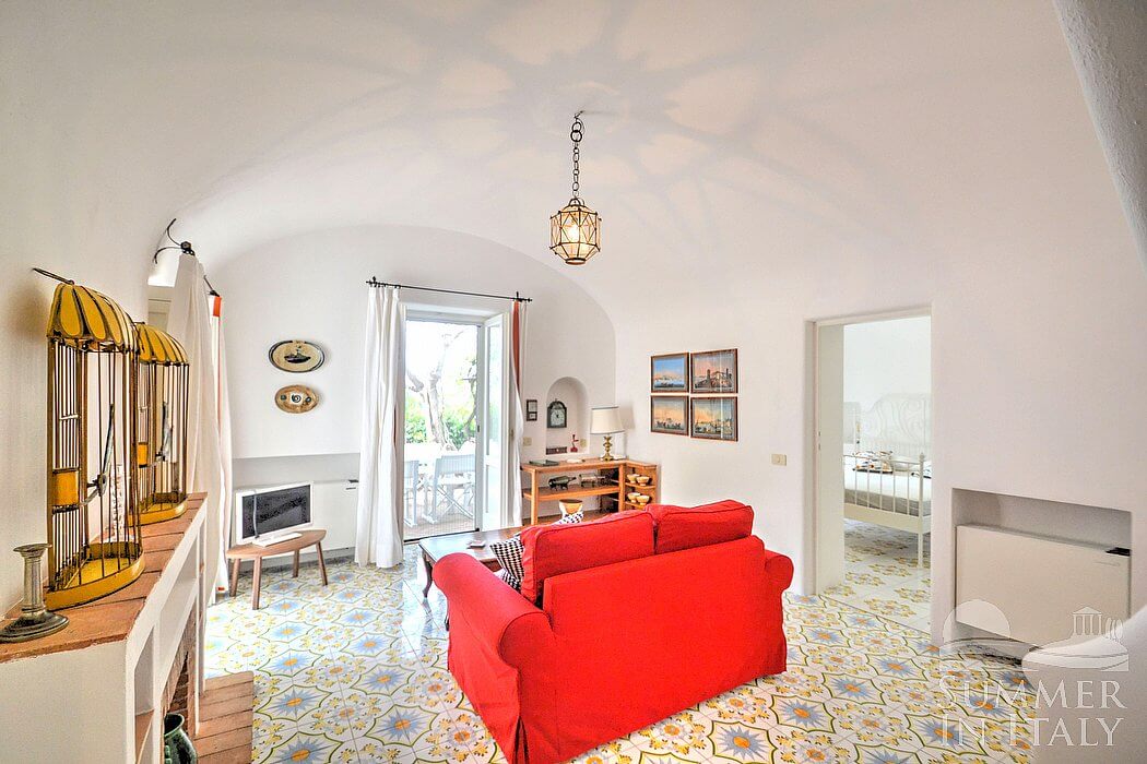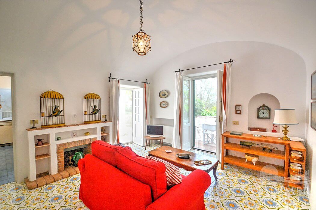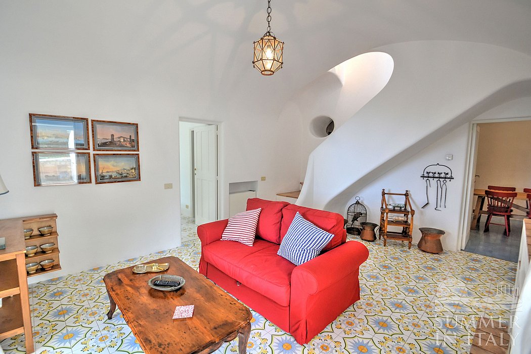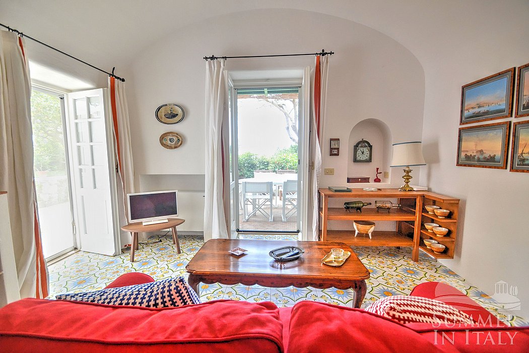 The first living room is paved with handmade tiles, decorated in the characteristic style of the island of Capri. The ceiling is vaulted. The furnishings are elegant. The furnishings include a divan that unfolds into a double bed. There is a small fireplace, for decorative purposes only. In this room you will find a television (local channels). From the living room you will be able to enter the patio through two French doors. The room is equipped with an air conditioning/heating unit.
