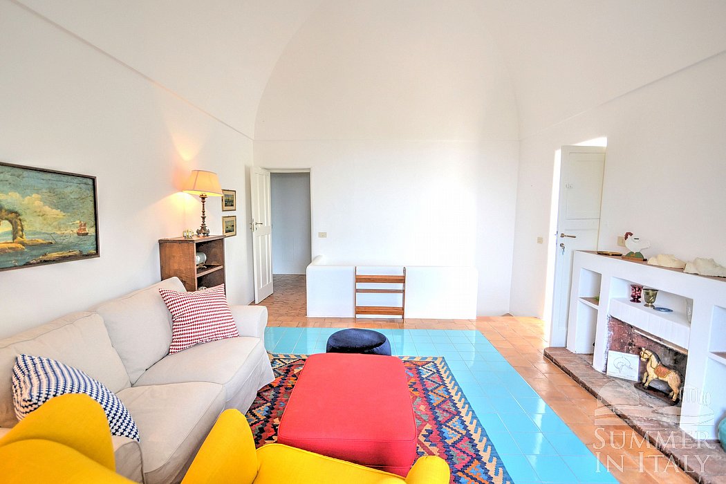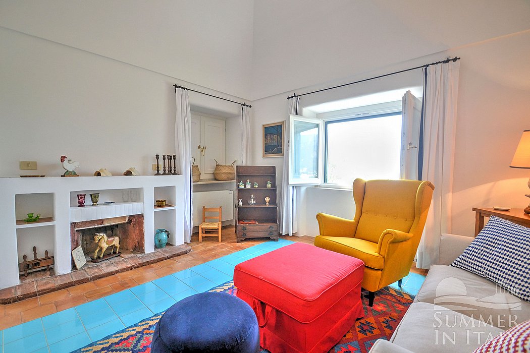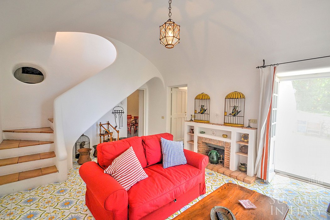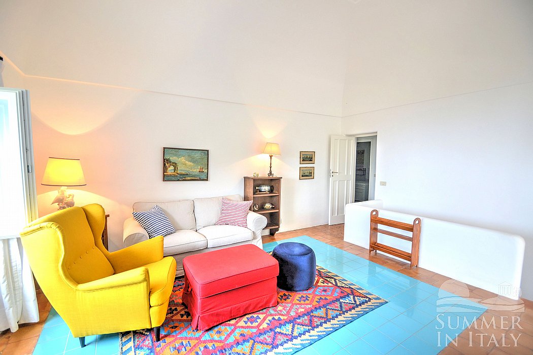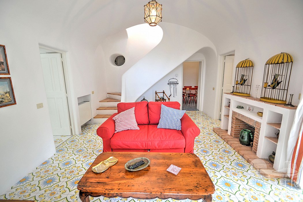 The first living room is paved with handmade tiles, decorated in the characteristic style of the island of Capri. The ceiling is vaulted. The furnishings are elegant. The furnishings include a divan that unfolds into a double bed. There is a small fireplace, for decorative purposes only. In this room you will find a television (local channels). From the living room you will be able to enter the patio through two French doors. The room is equipped with an air conditioning/heating unit.