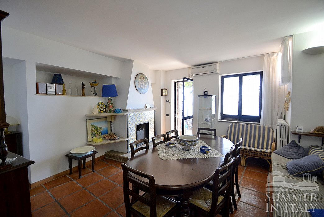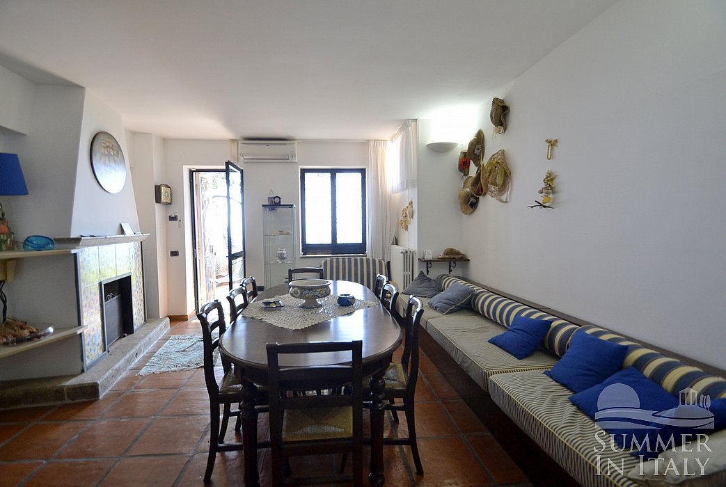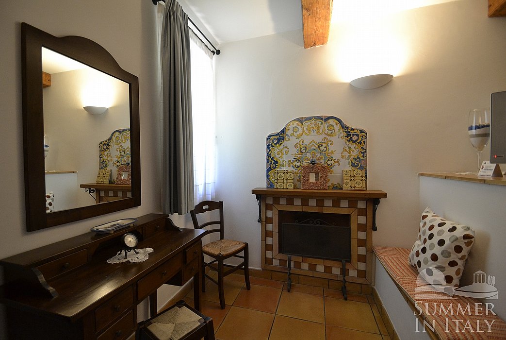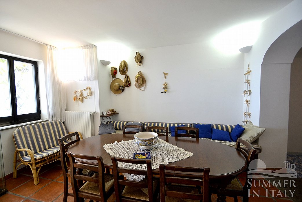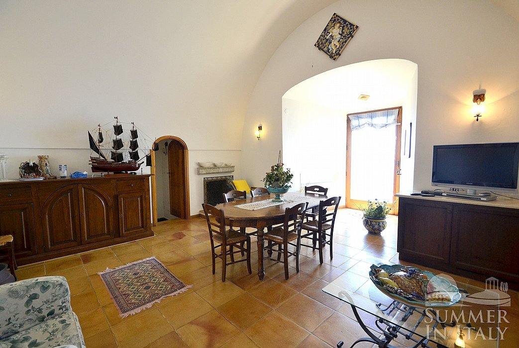 The first living room is paved with terracotta tiles. The ceiling is vaulted. The furnishings are elegant and refined, and include some antique pieces. The furnishings include two sofas and two armchairs. There is an age-old fireplace decorated with age-old majolica tiles. The dining table can accommodate ten guests. In this room you will find a satellite television (local channels), a DVD player and a CD player. From the living room you will be able to enter the first patio and the garden through a French door. The room has a large panoramic window with a view of the sea.