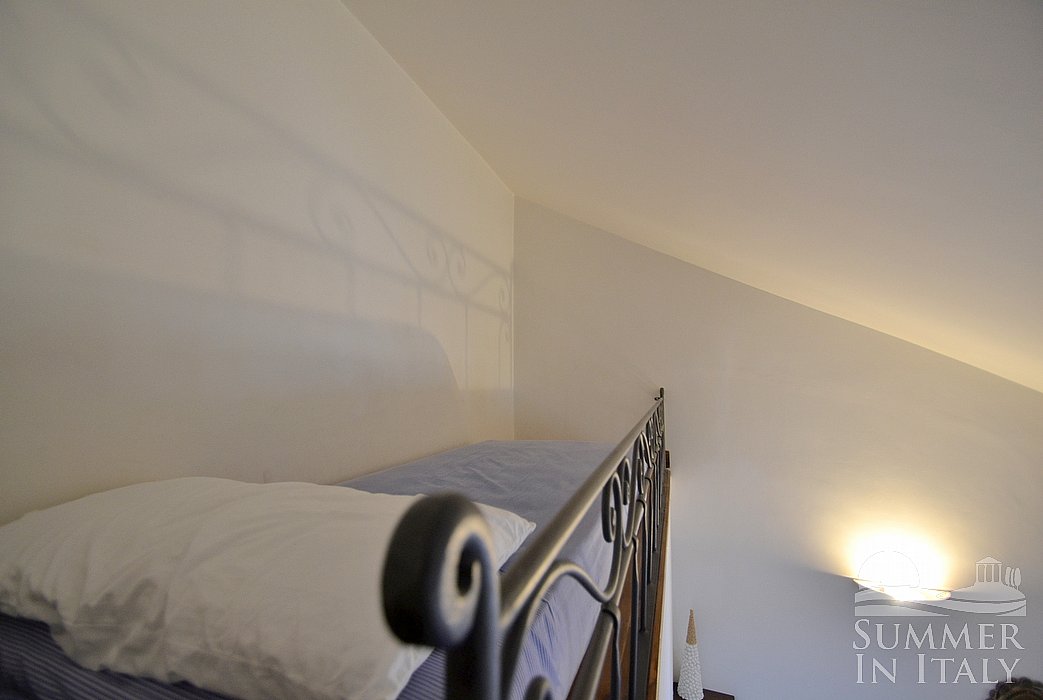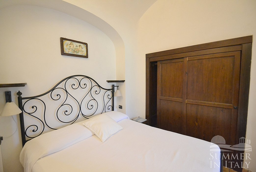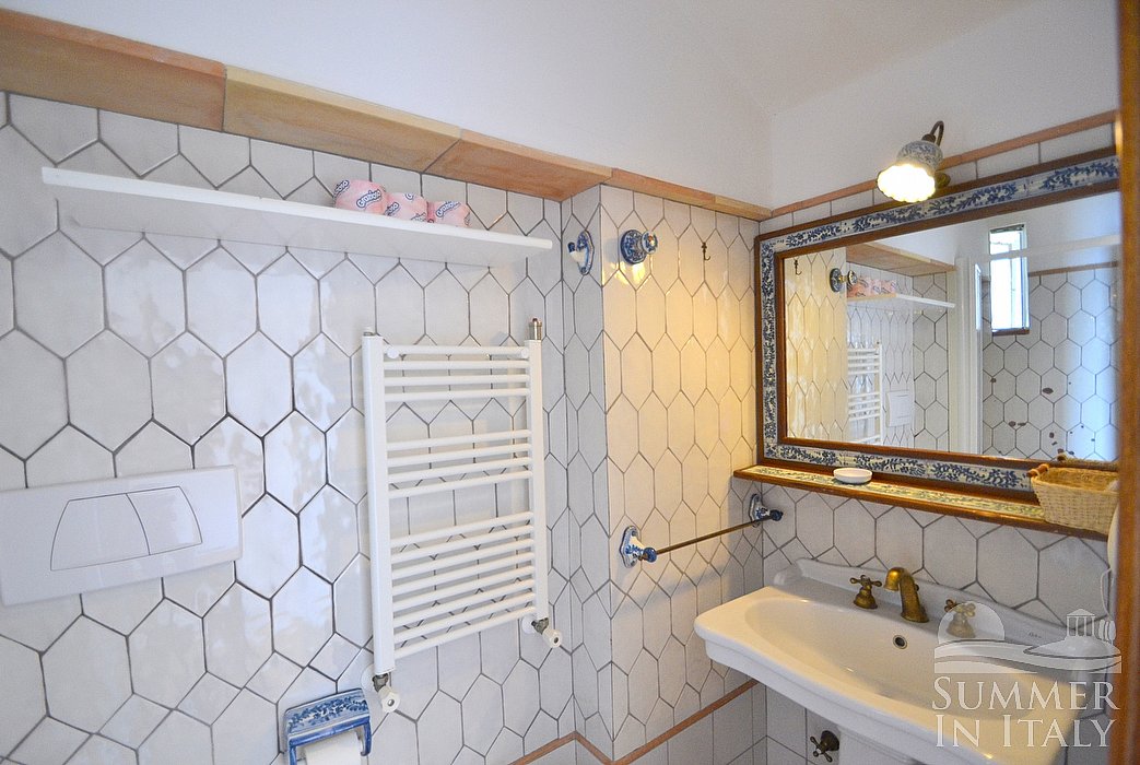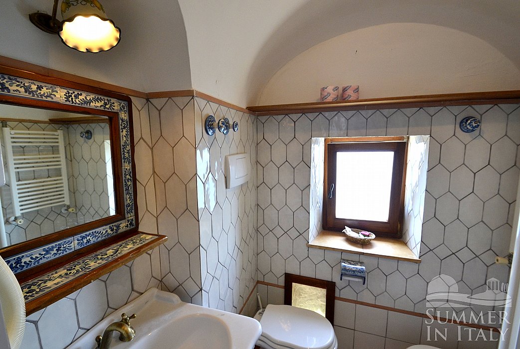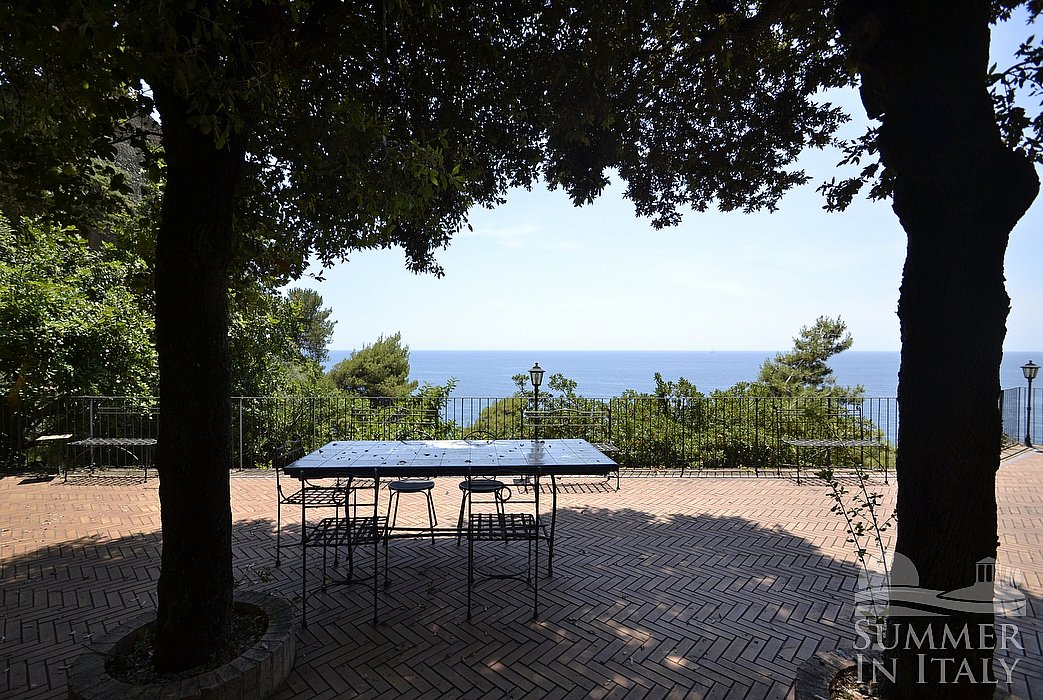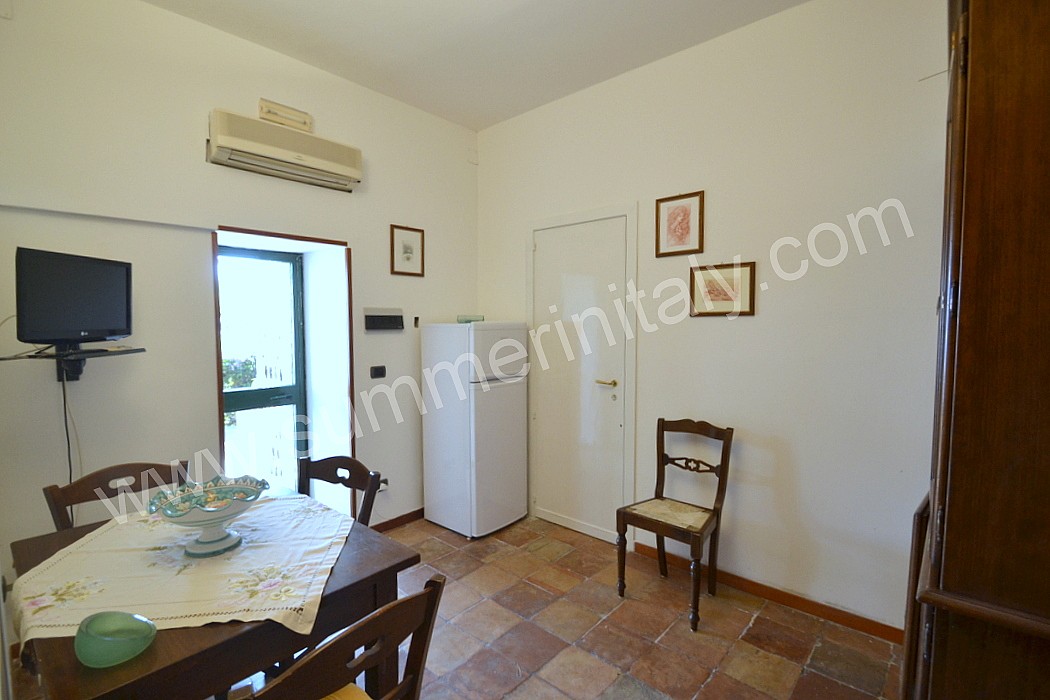 The first living room is paved with terracotta tiles. The ceiling is vaulted. The furnishings are elegant and refined, and include some antique pieces. The furnishings include two sofas and two armchairs. There is an age-old fireplace decorated with age-old majolica tiles. The dining table can accommodate ten guests. In this room you will find a satellite television (local channels), a DVD player and a CD player. From the living room you will be able to enter the first patio and the garden through a French door. The room has a large panoramic window with a view of the sea.