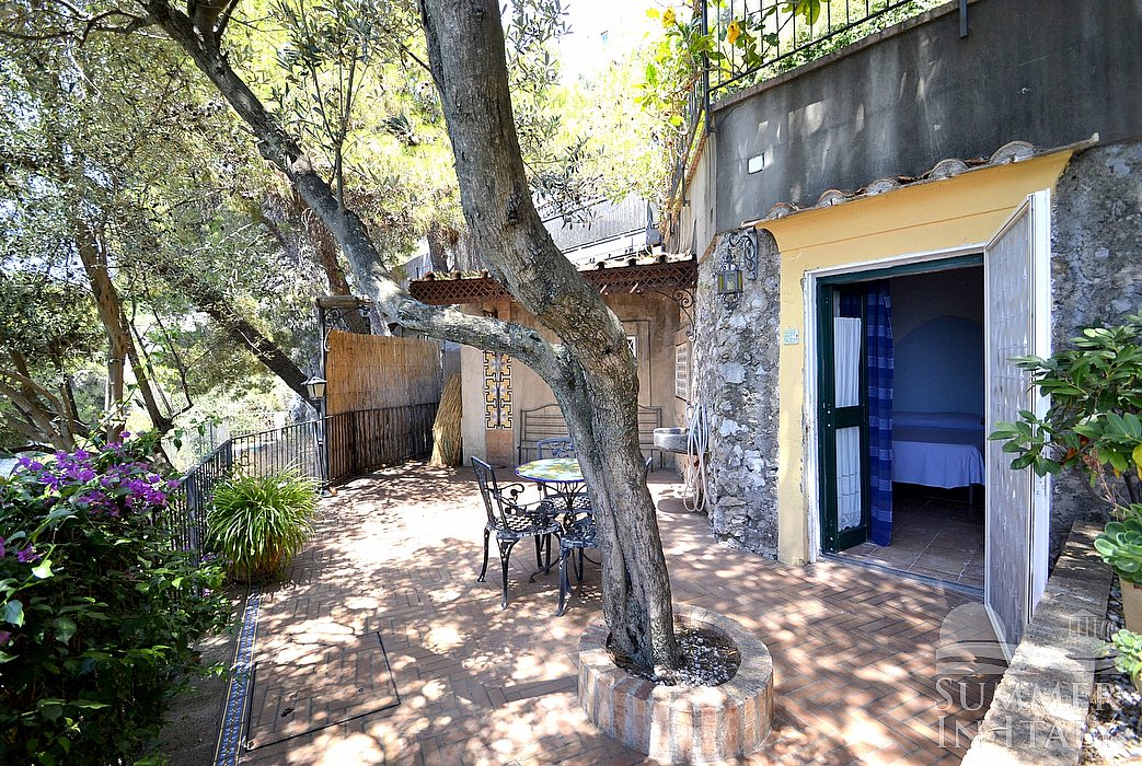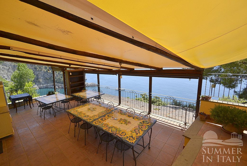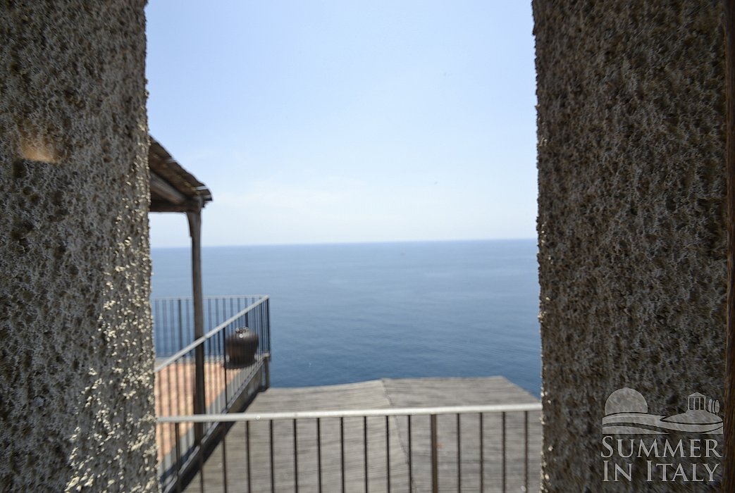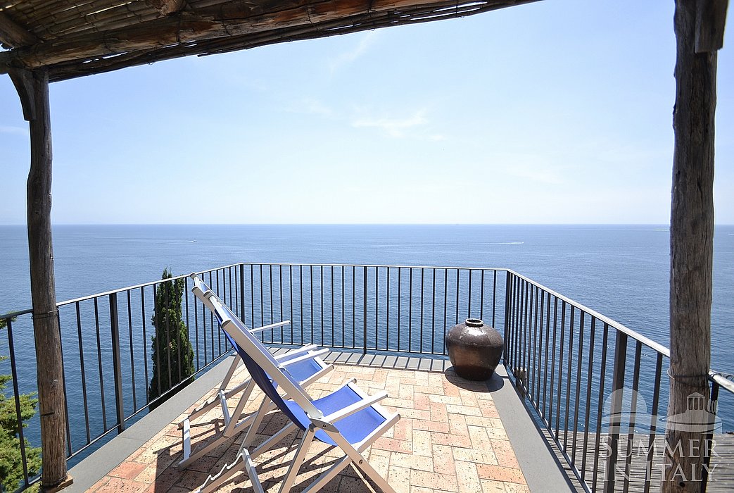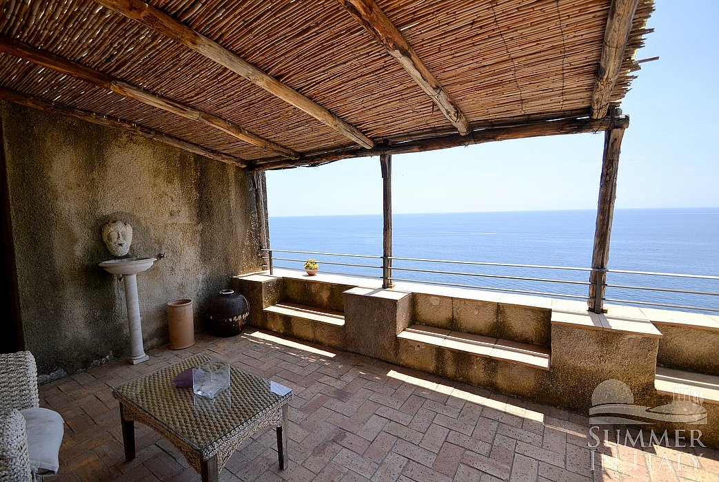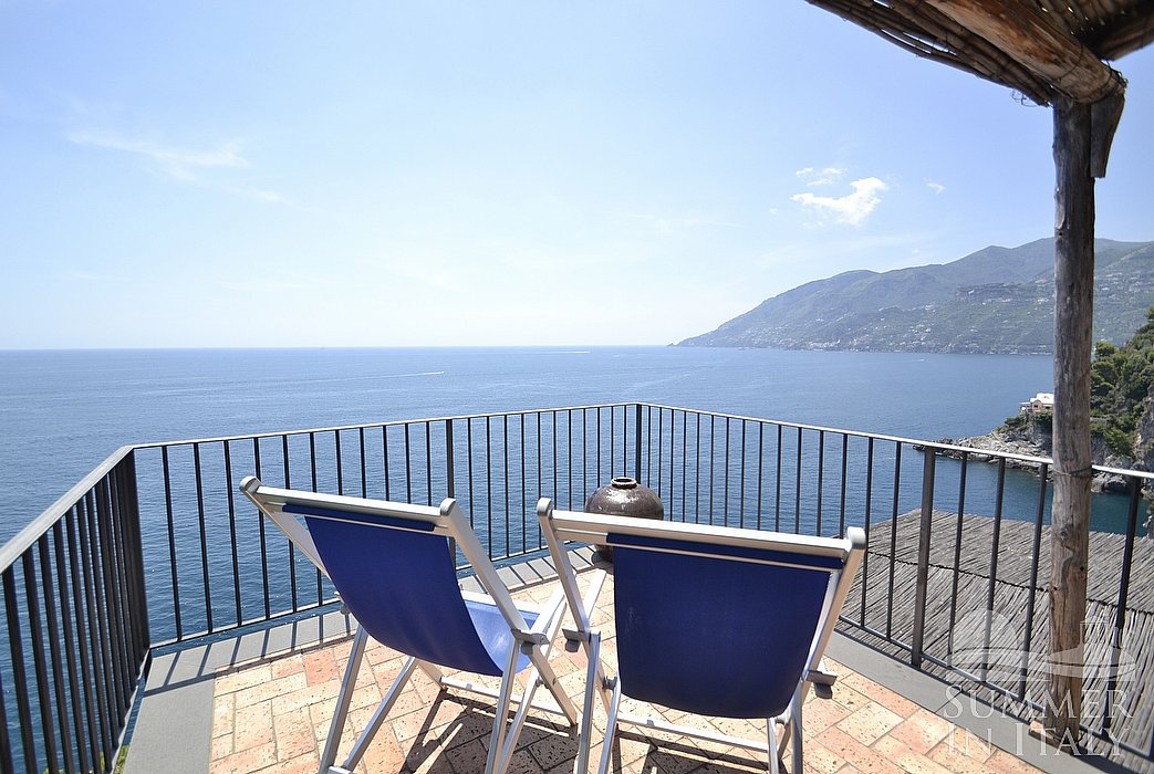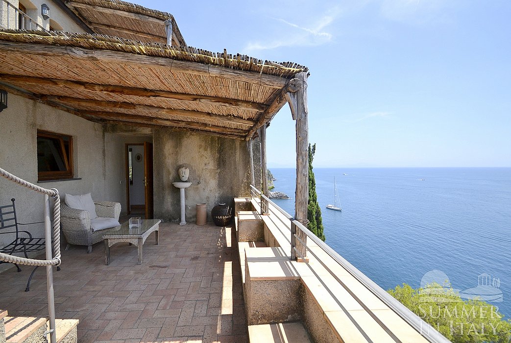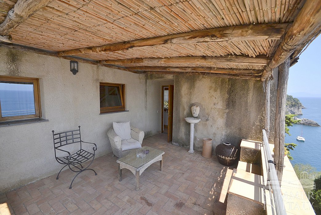 The second terrace is 20 square meters (215 square feet) large. You will reach it from the living room going up an external stairway which consists of approximately 30 steps. It is partly shaded by a pergola with a bamboo roof. It is equipped with two sun loungers. From the terrace you will enjoy a breathtaking view of the sea and of the coast of Amalfi.